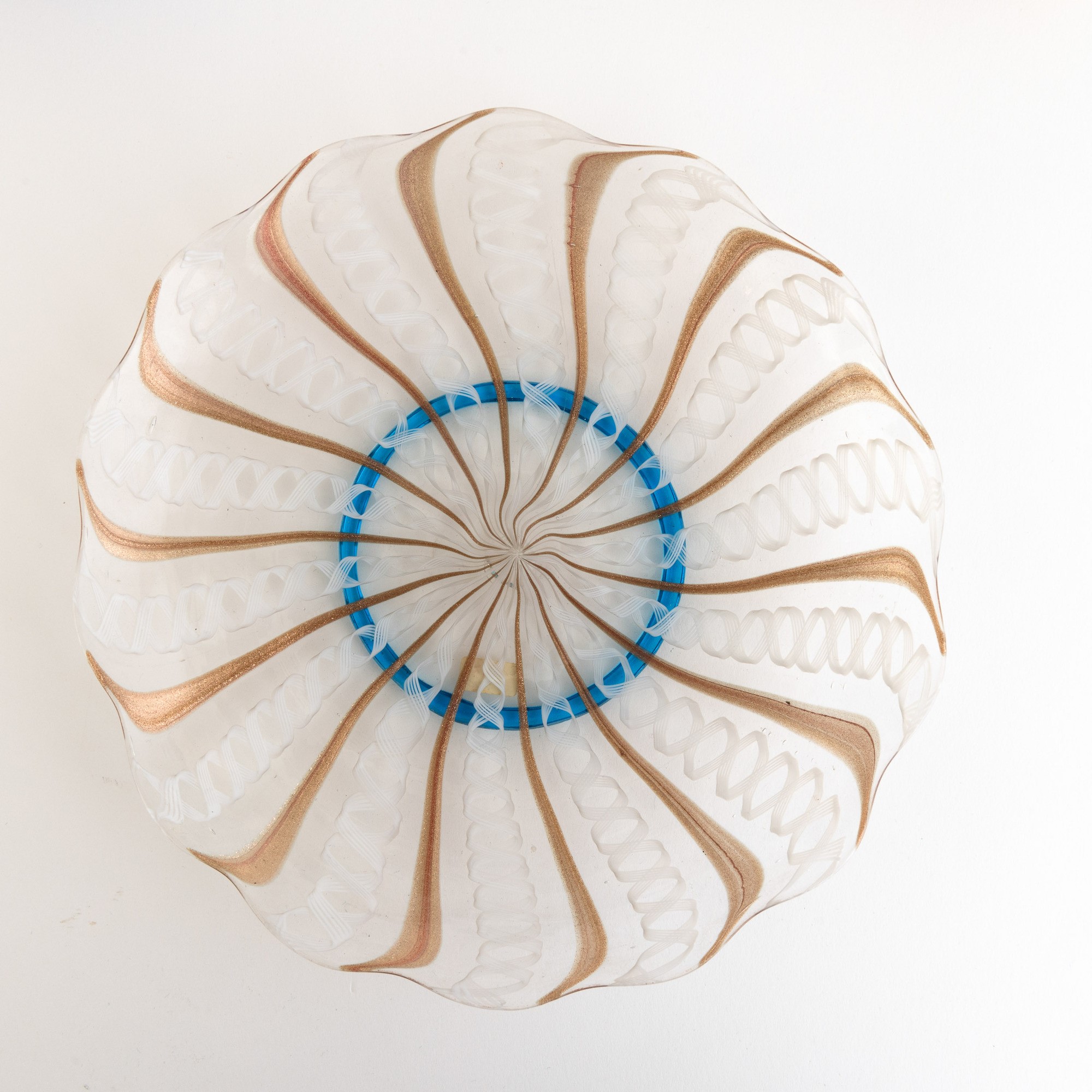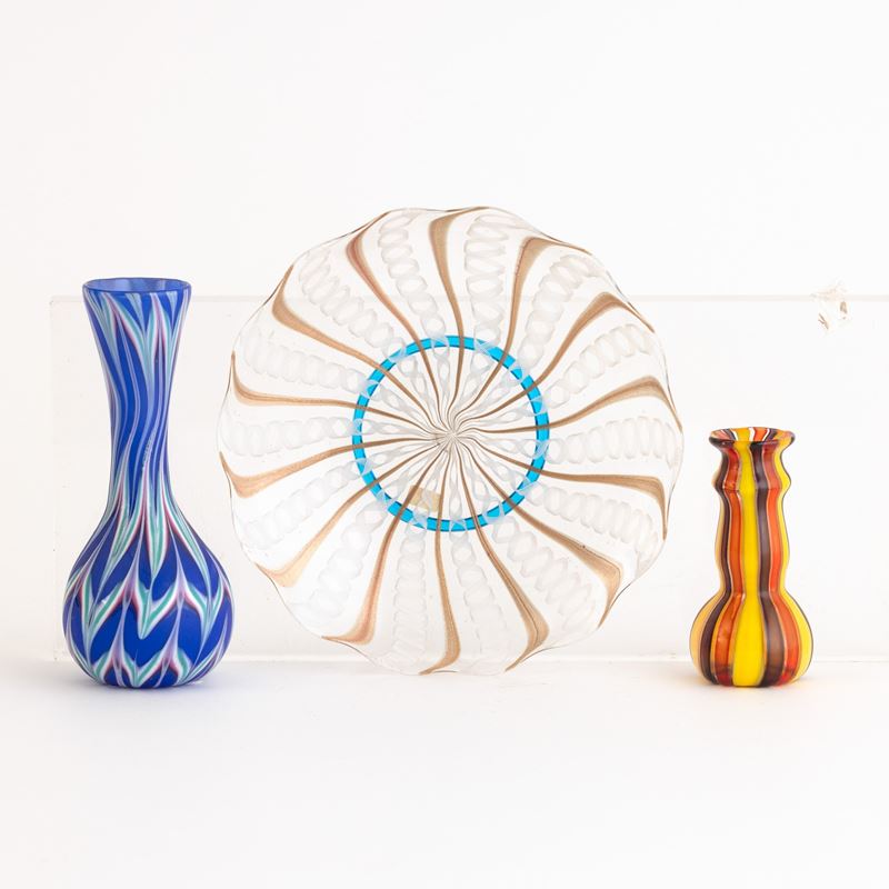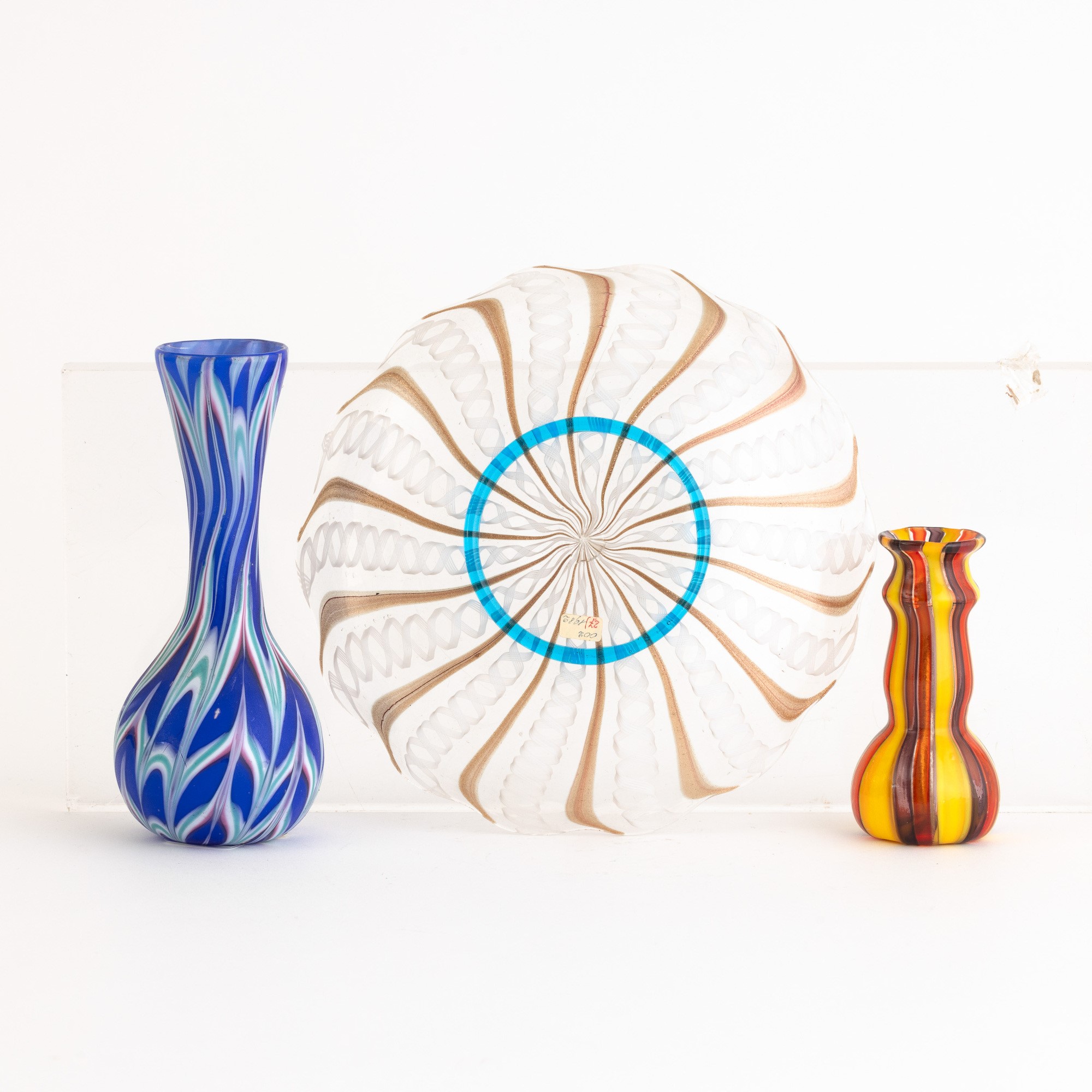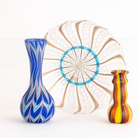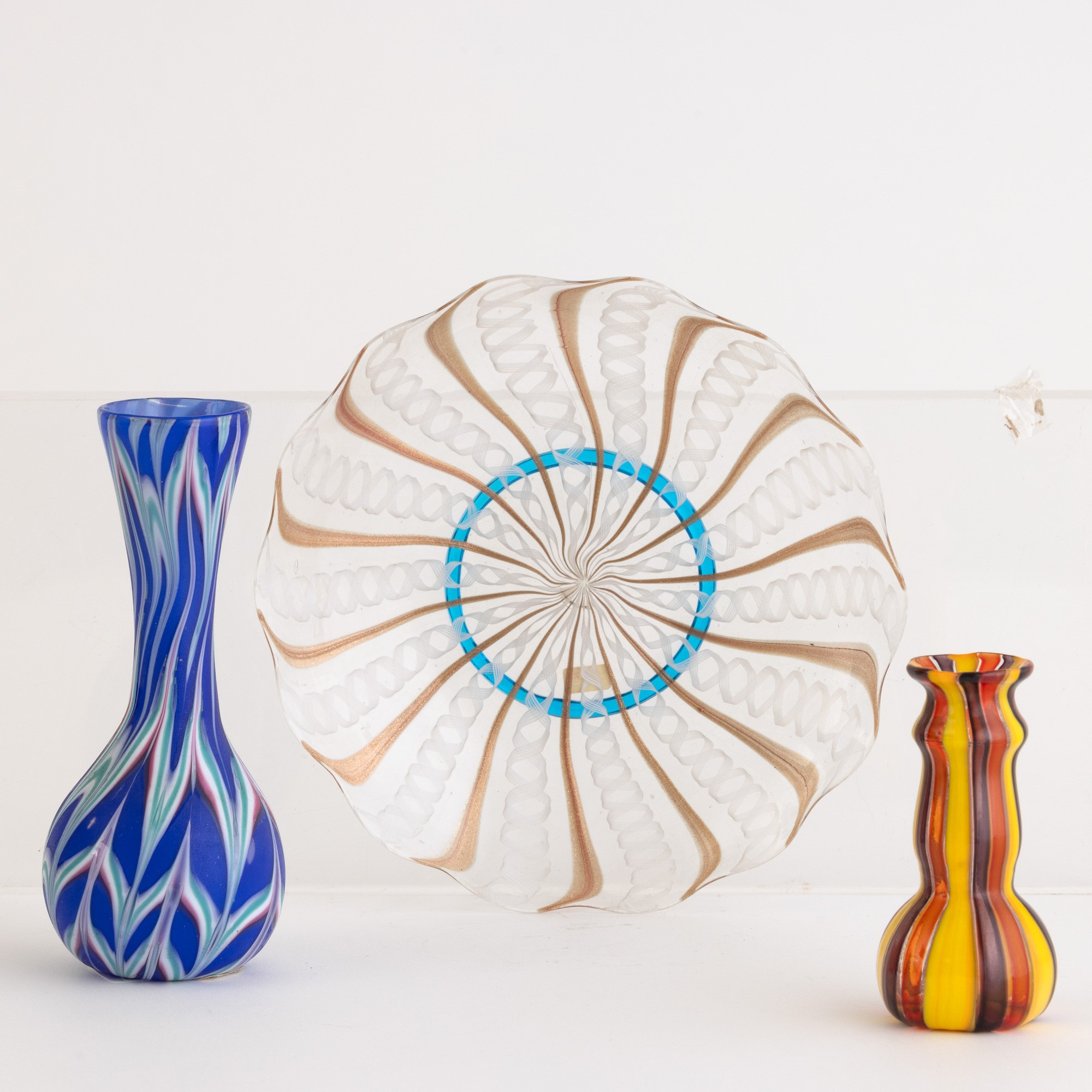 Lotto formato da due vasi a canne policrome e piatto in vetro soffiato con decoro di canne policrome e a zanfirico.