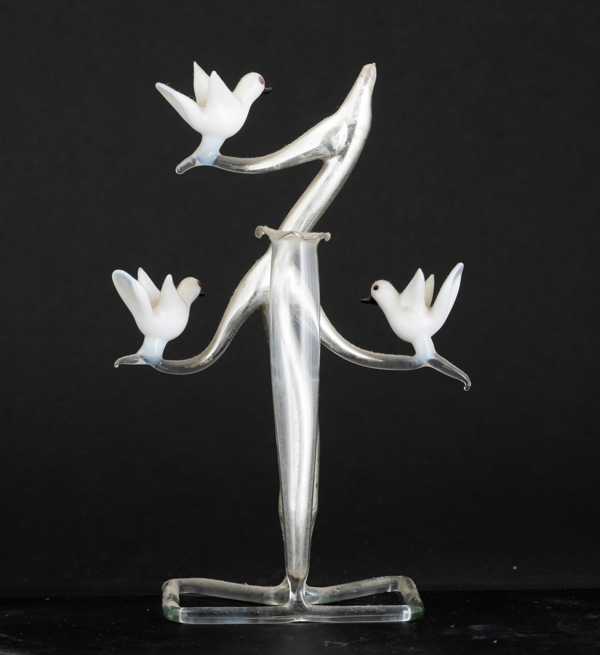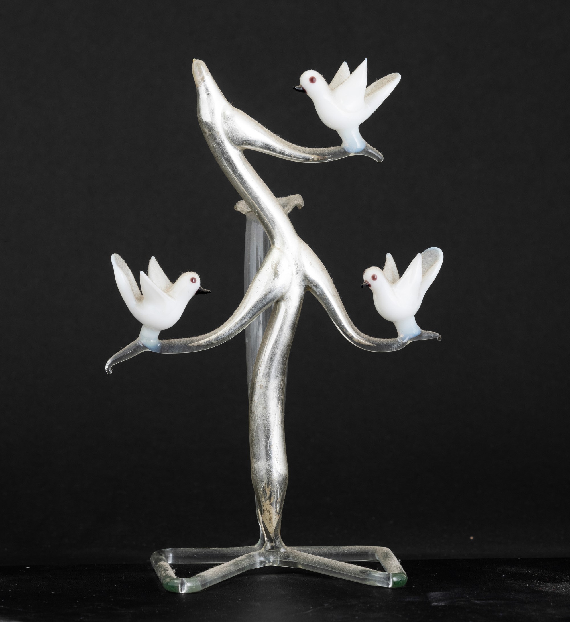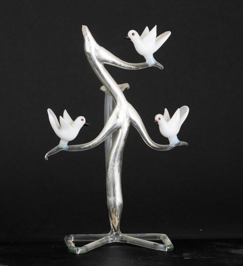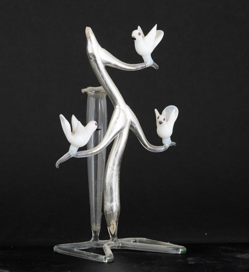 Vaso solifleur in vetro epossidico soffiato con decoro di ramo argentato e uccellini.