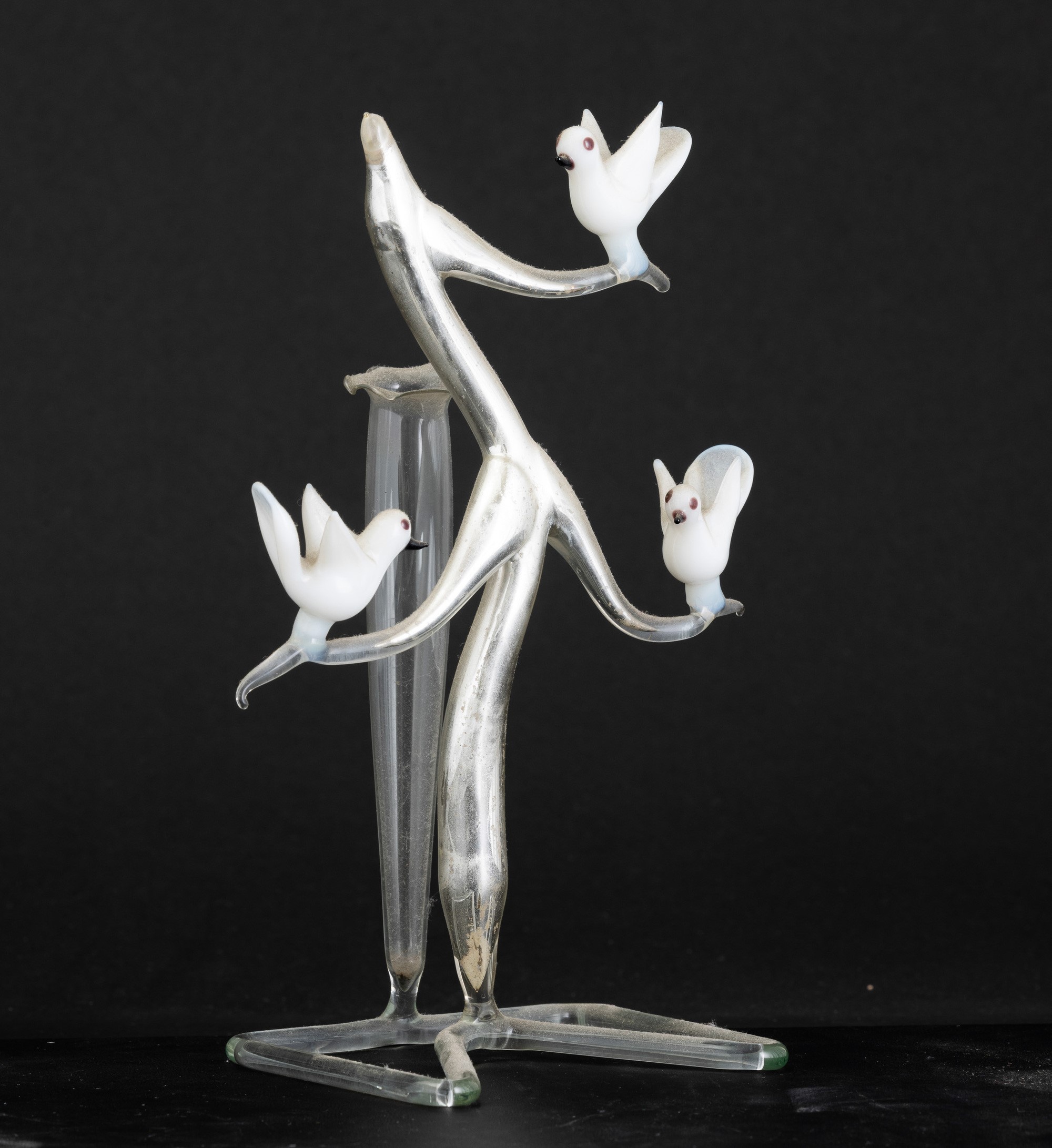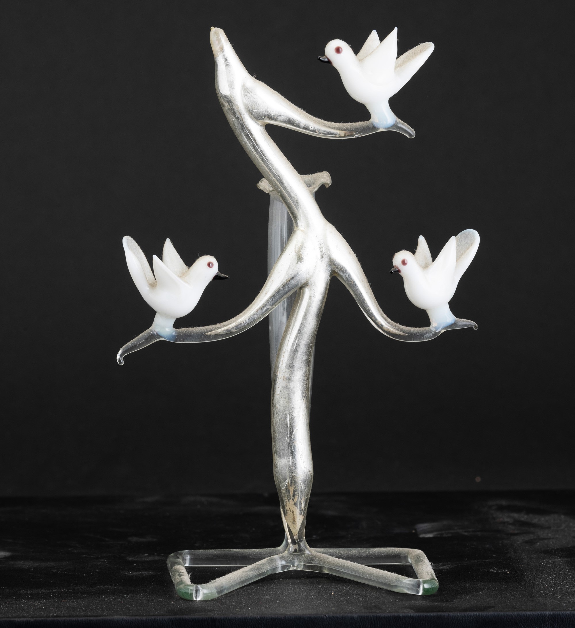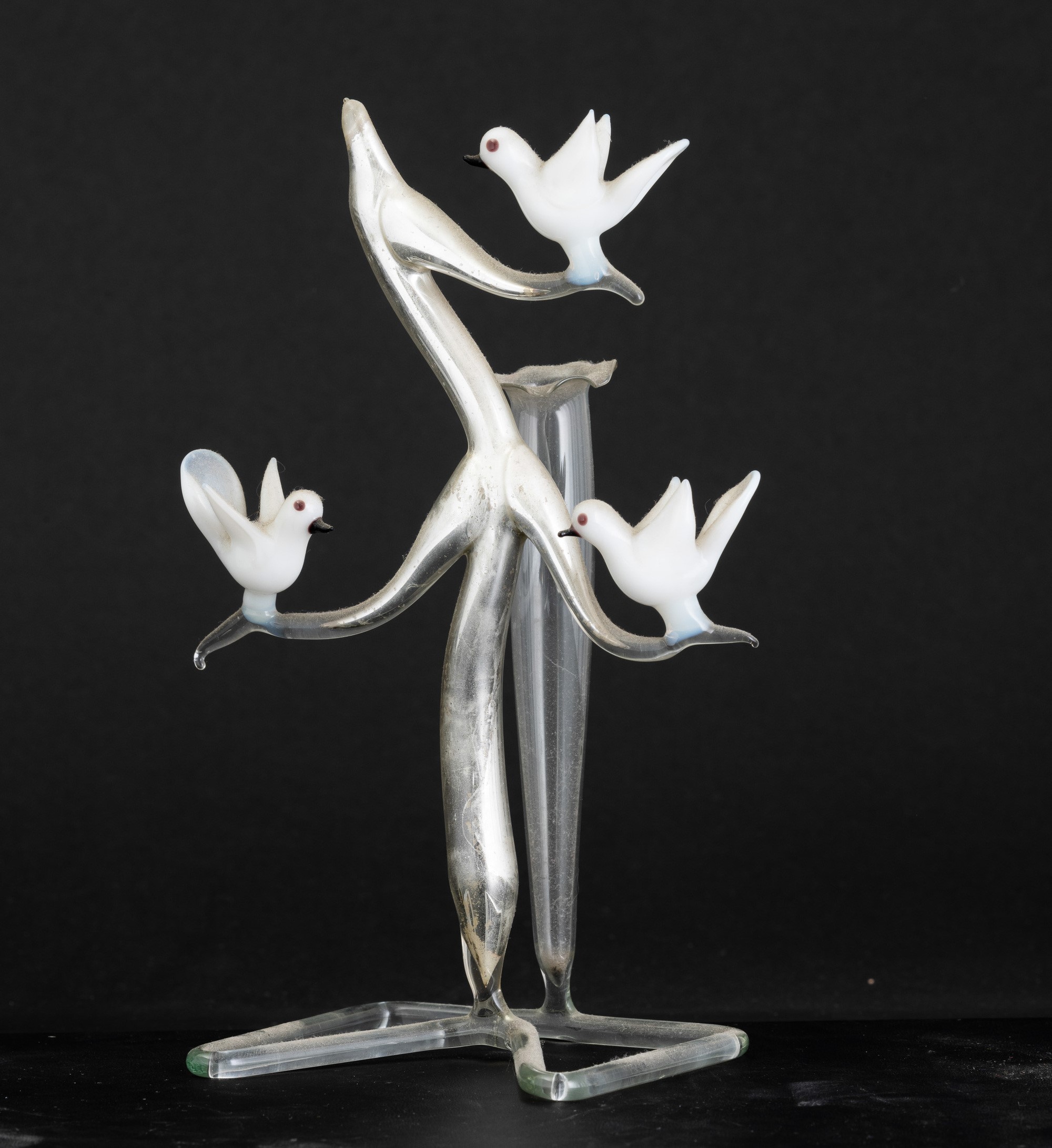 Vaso solifleur in vetro epossidico soffiato con decoro di ramo argentato e uccellini.