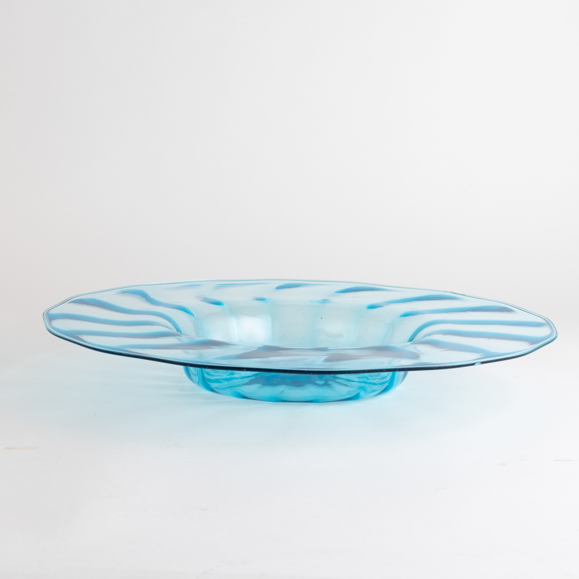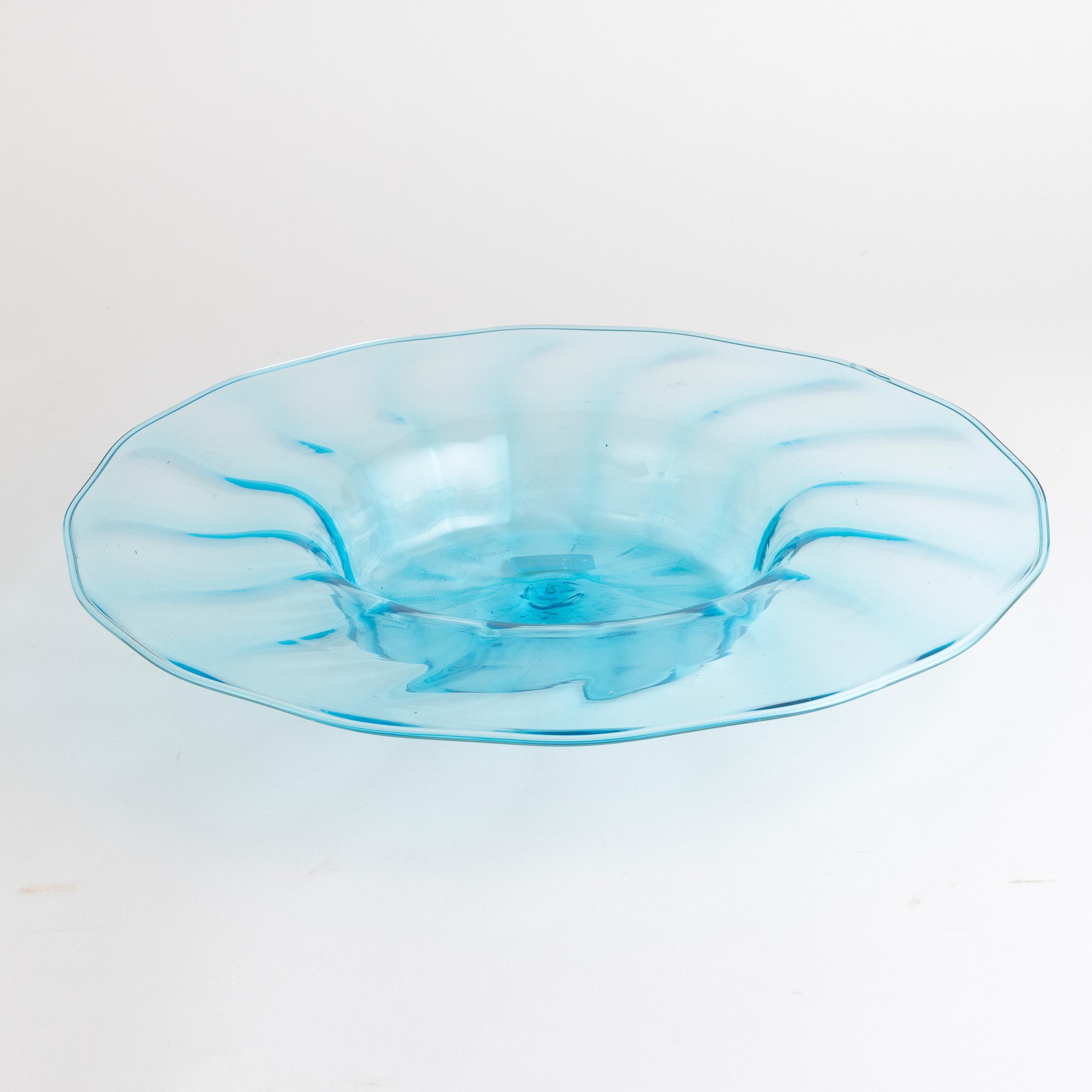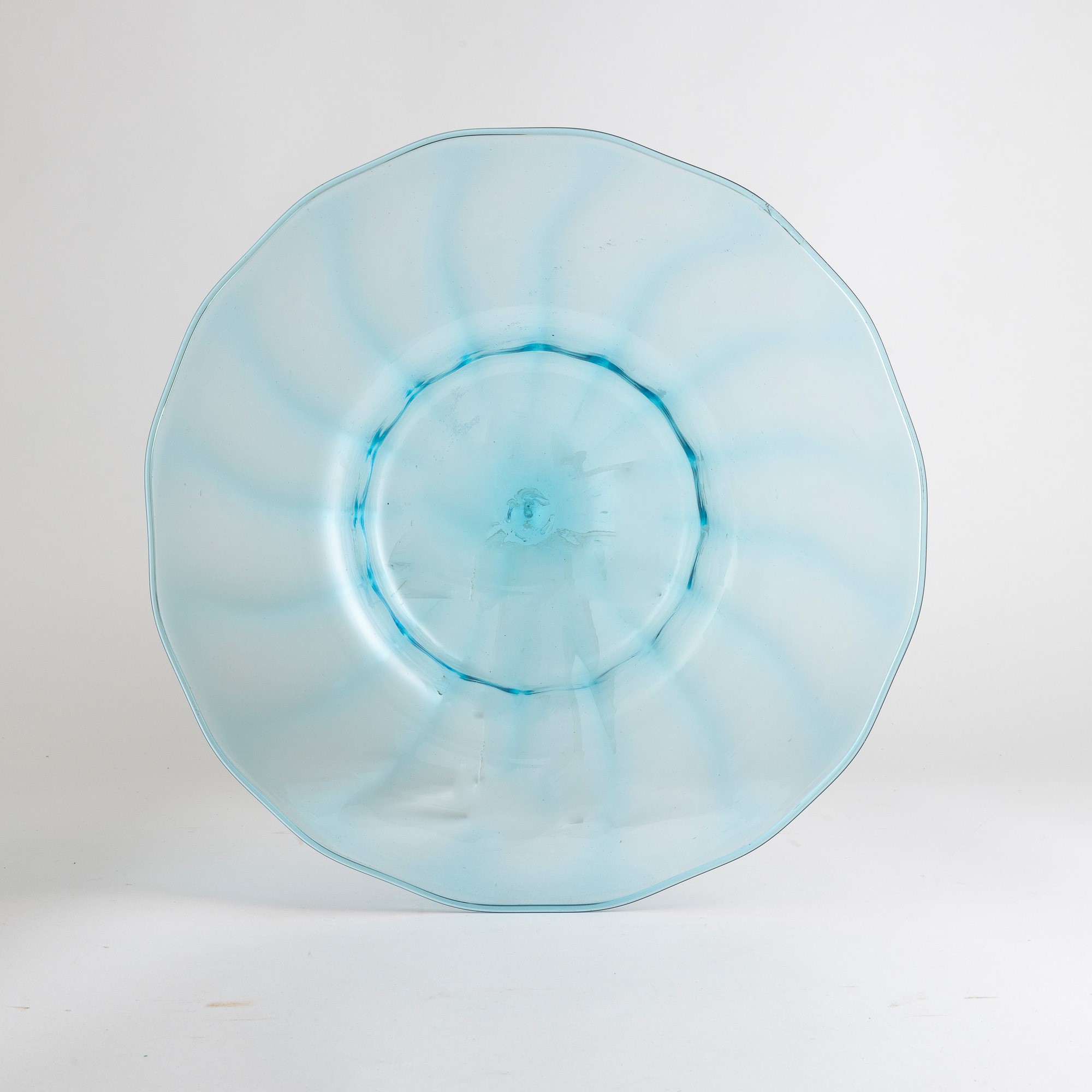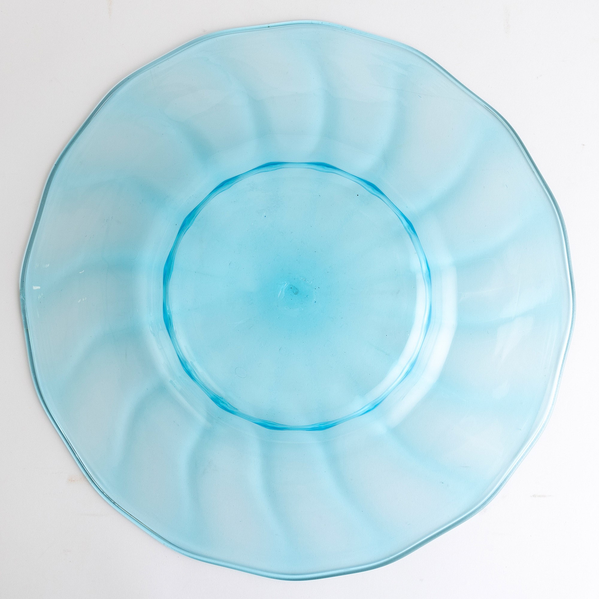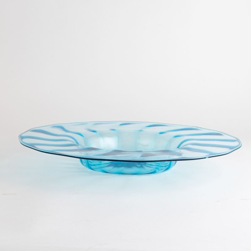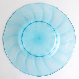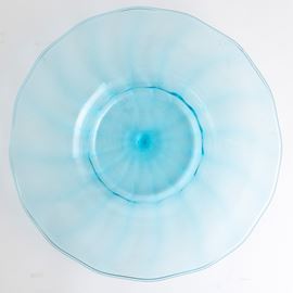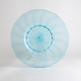 Grande piatto in vetro soffiato celestino a costolature.