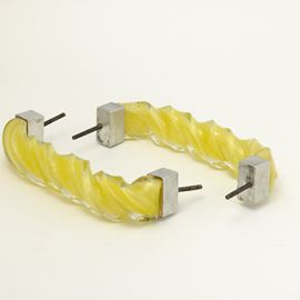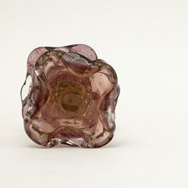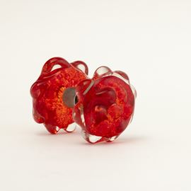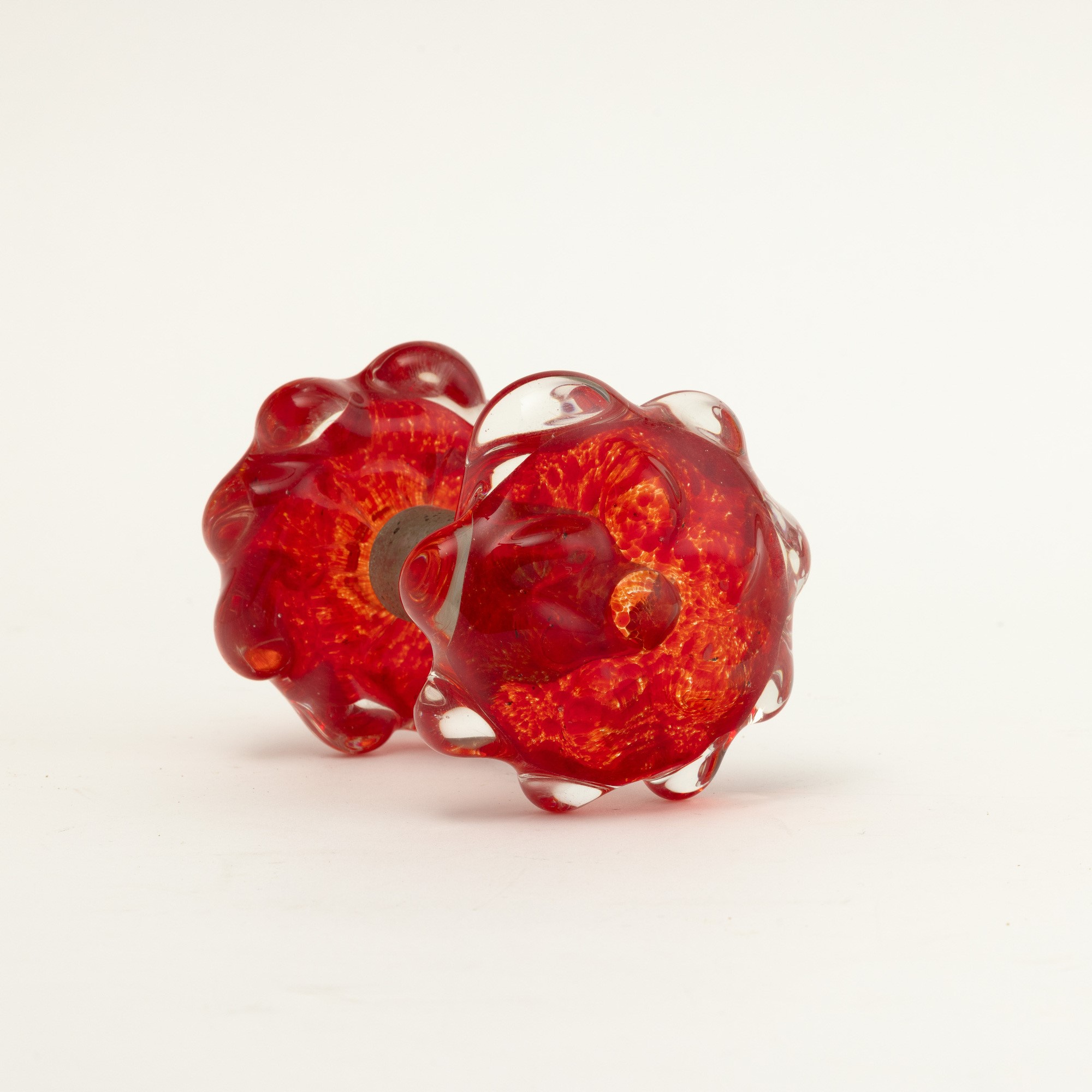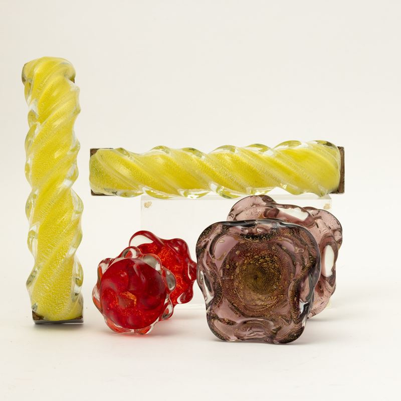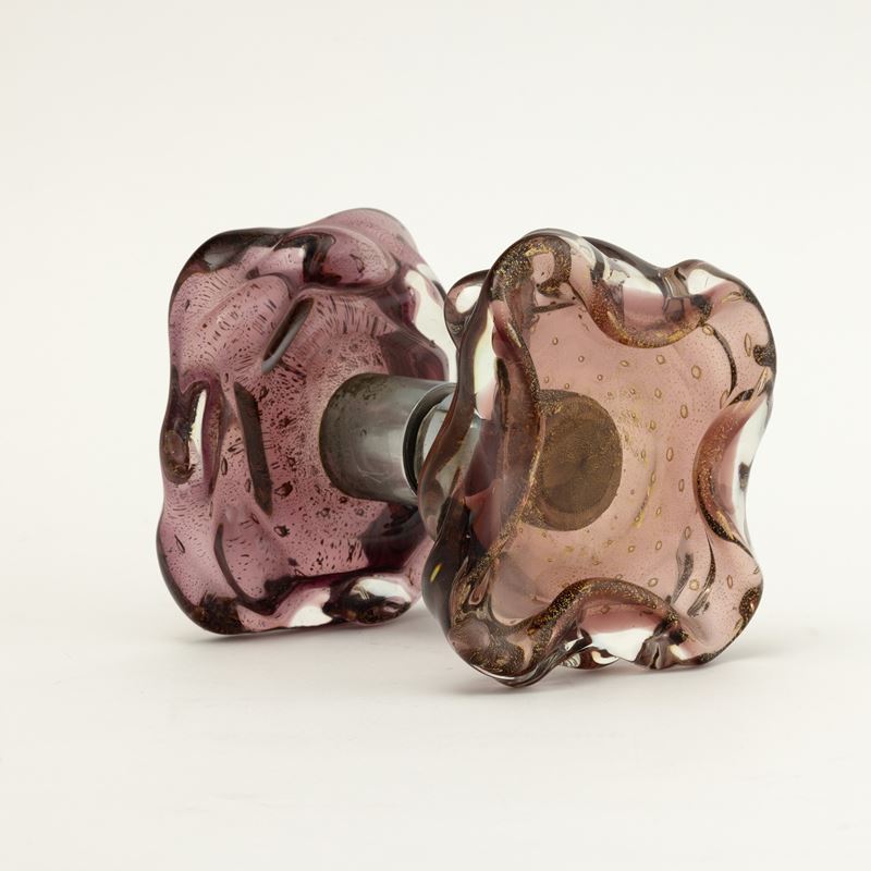 Lotto formato da due maniglie rettangolari e due coppie di pomoli in vetro sommerso policromo con inclusione di bollicine, foglia argento e foglia oro. Montature cromate.