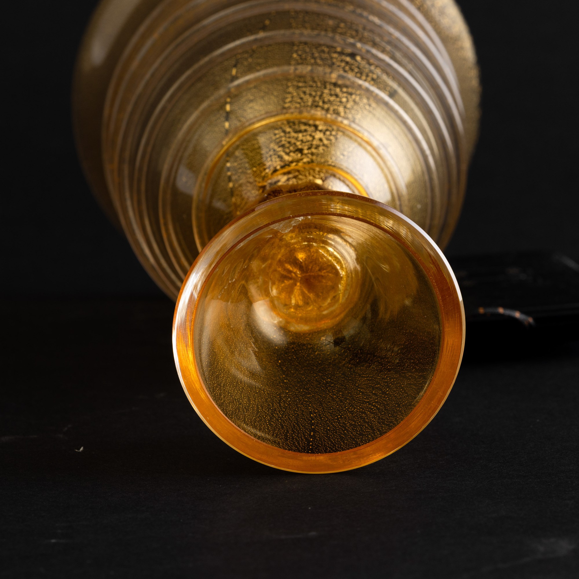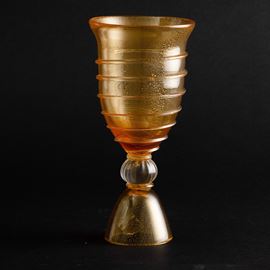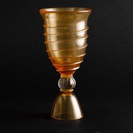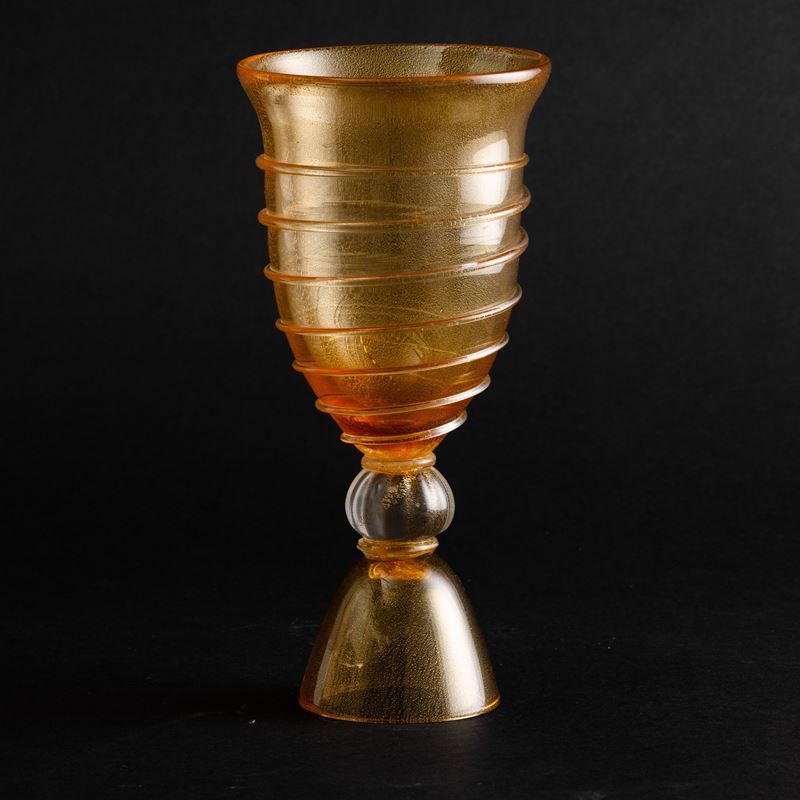 Coppa su alto basamento in vetro soffiato con inclusione di foglia oro e canna a spirale applicata.