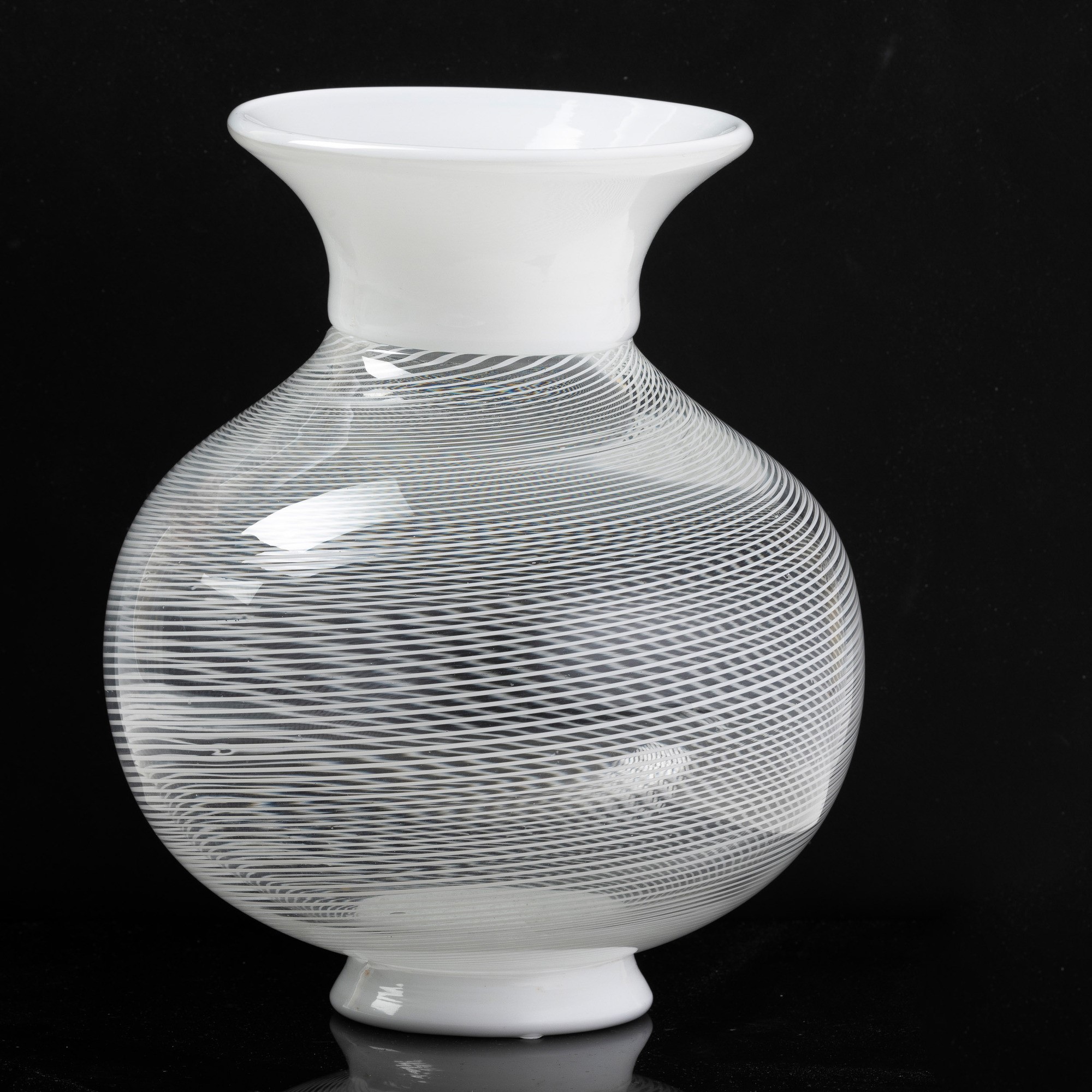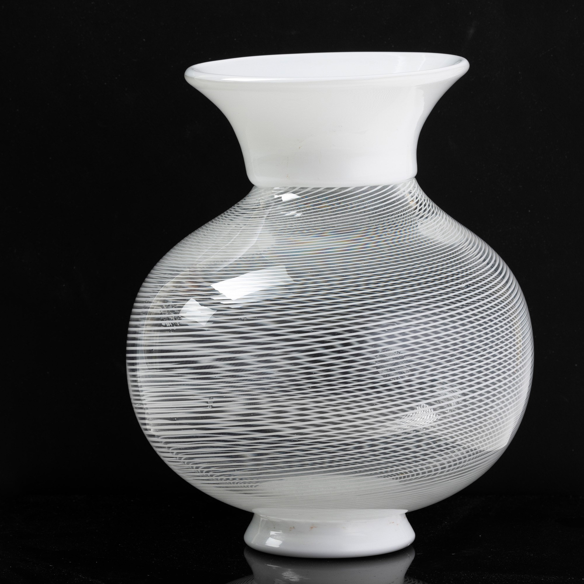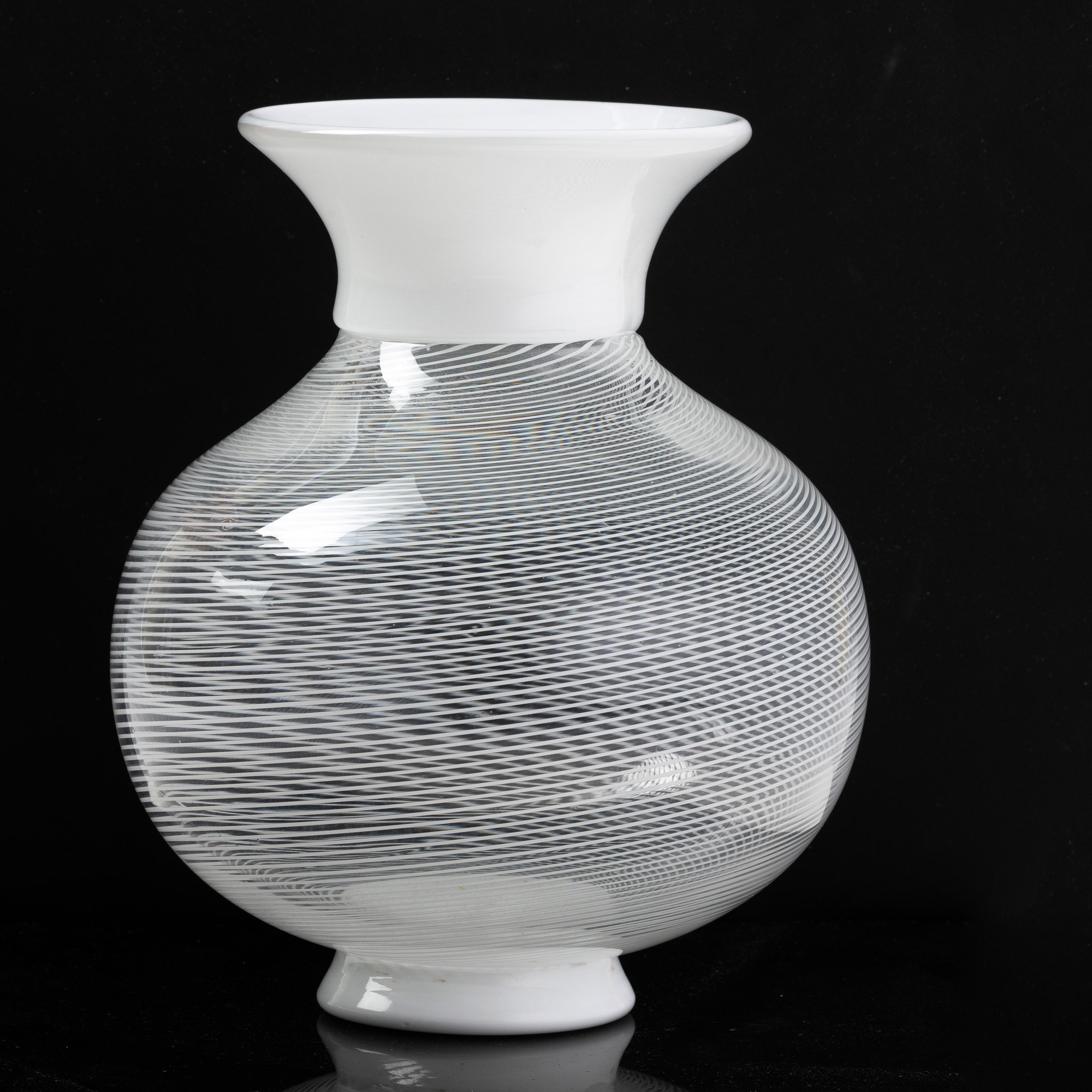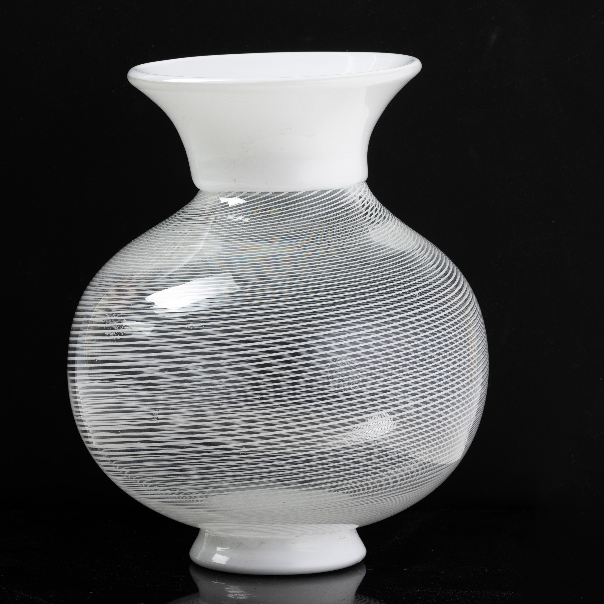 Vaso a balaustro in vetro soffiato con decoro di filigrana sommersa con piede e collo applicati in vetro lattimo.