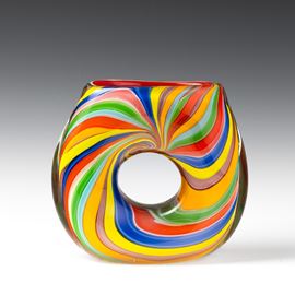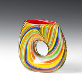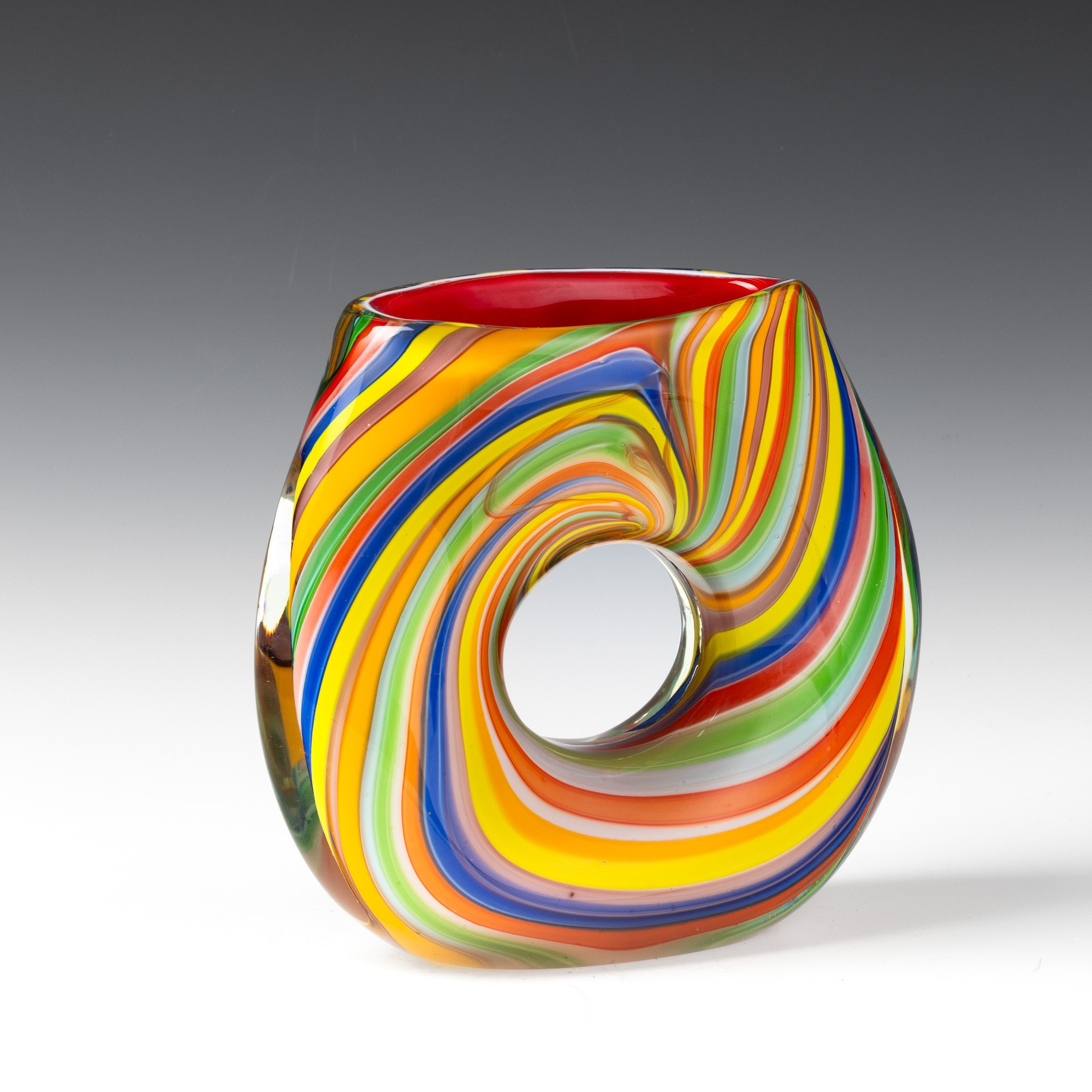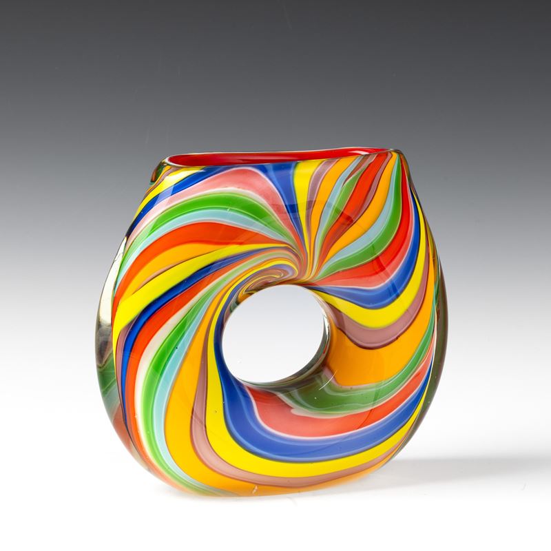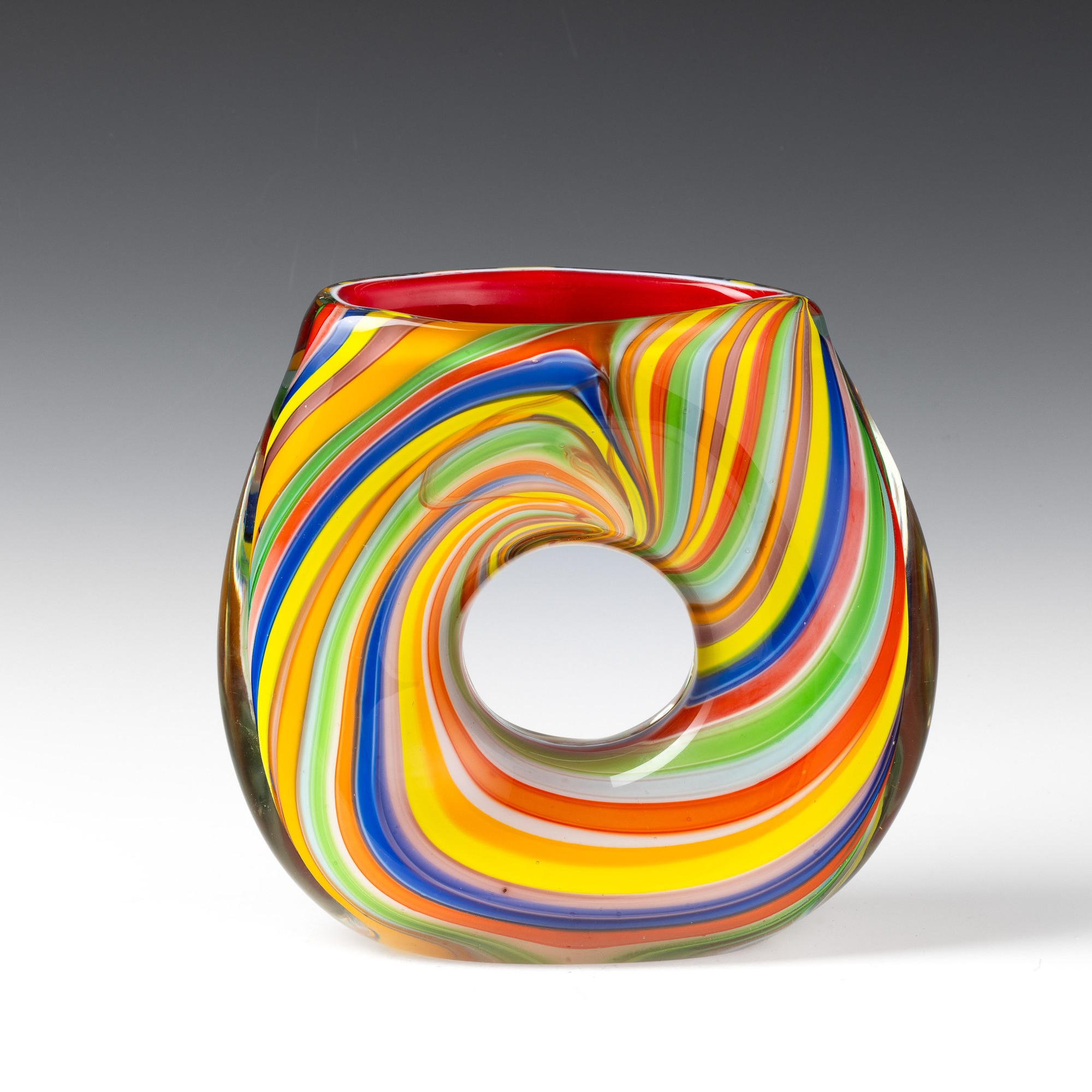 Vaso in vetro soffiato con grande foro centrale e decoro di canne policrome a spirale.