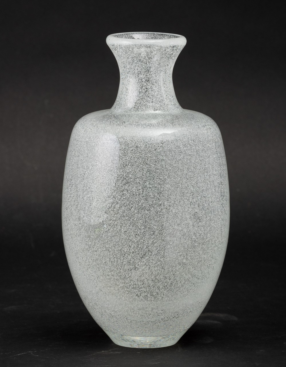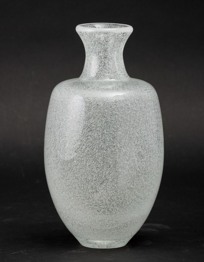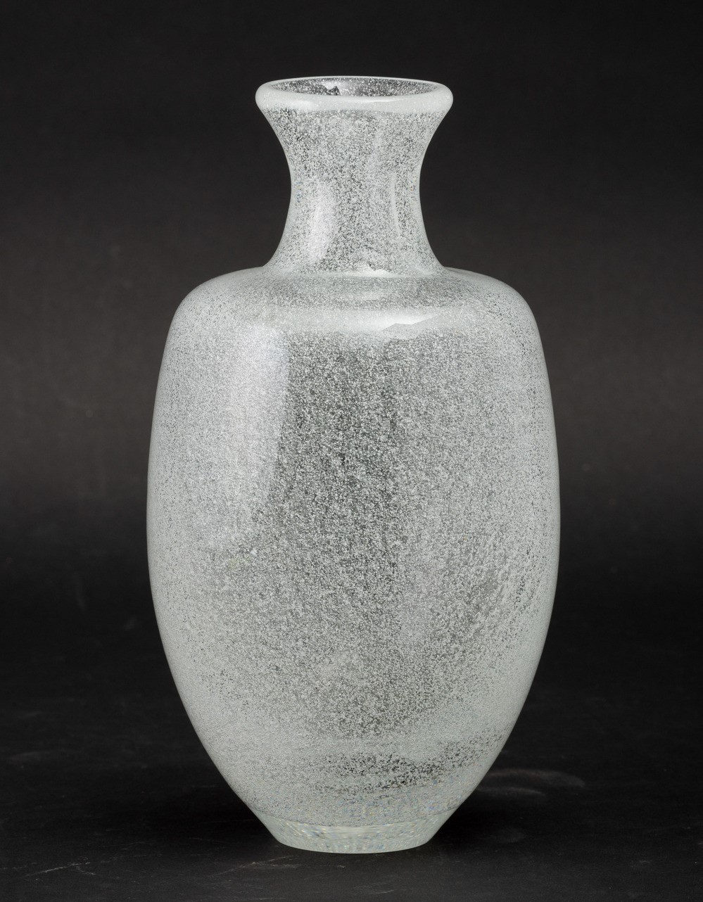 Vaso in forma di uovo con collo svasato in vetro soffiato con inclusione di bollicine lattimo.