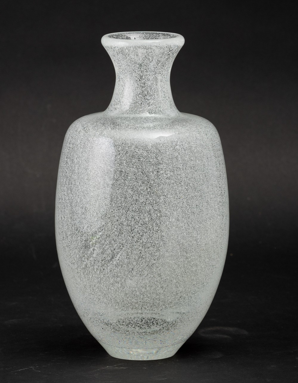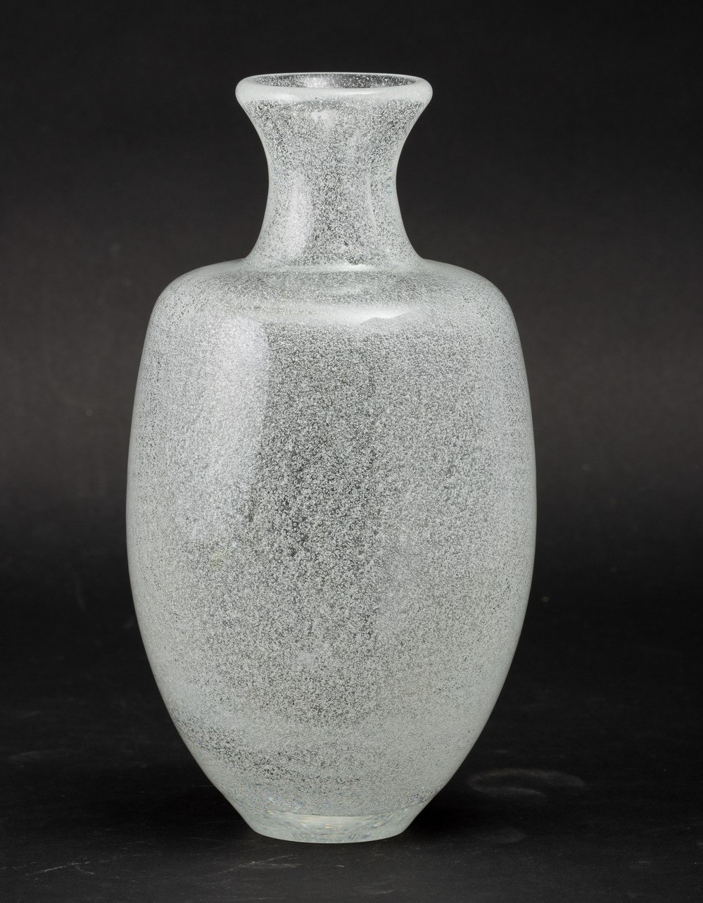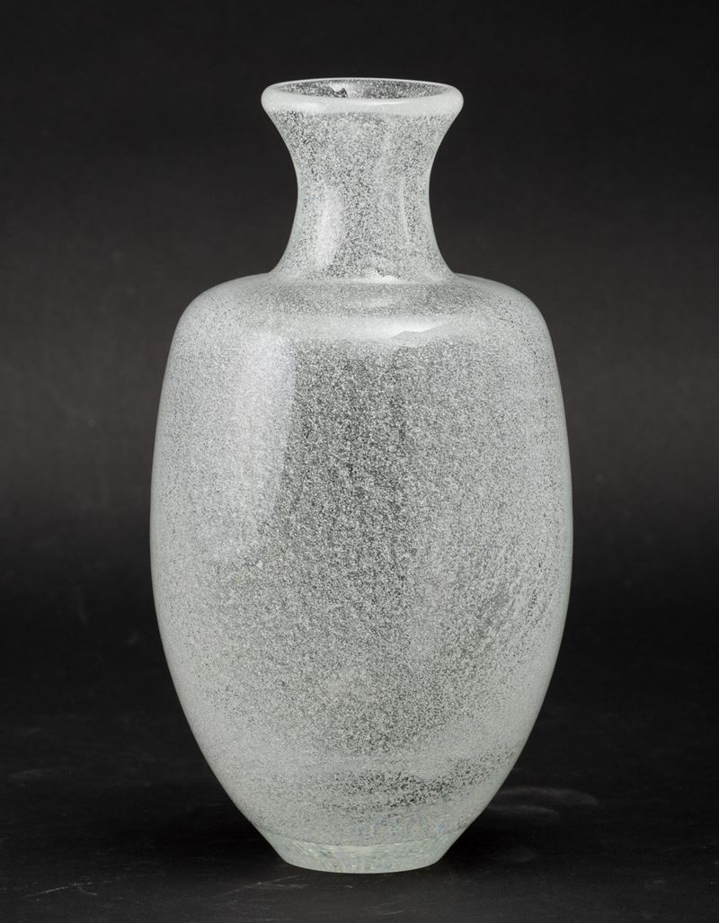 Vaso in forma di uovo con collo svasato in vetro soffiato con inclusione di bollicine lattimo.