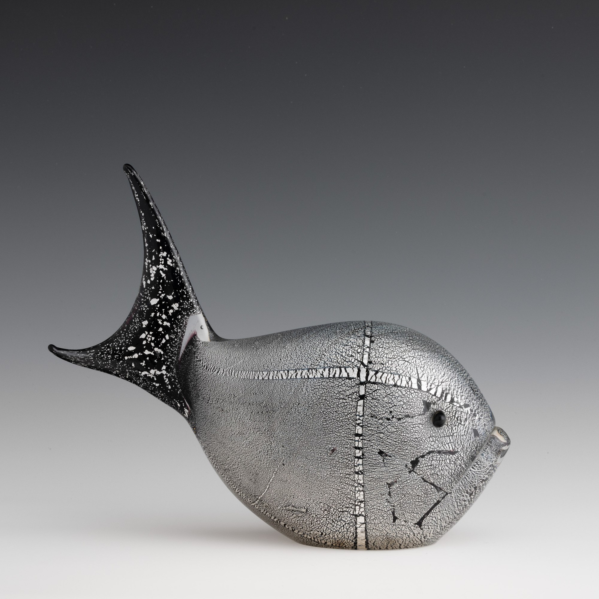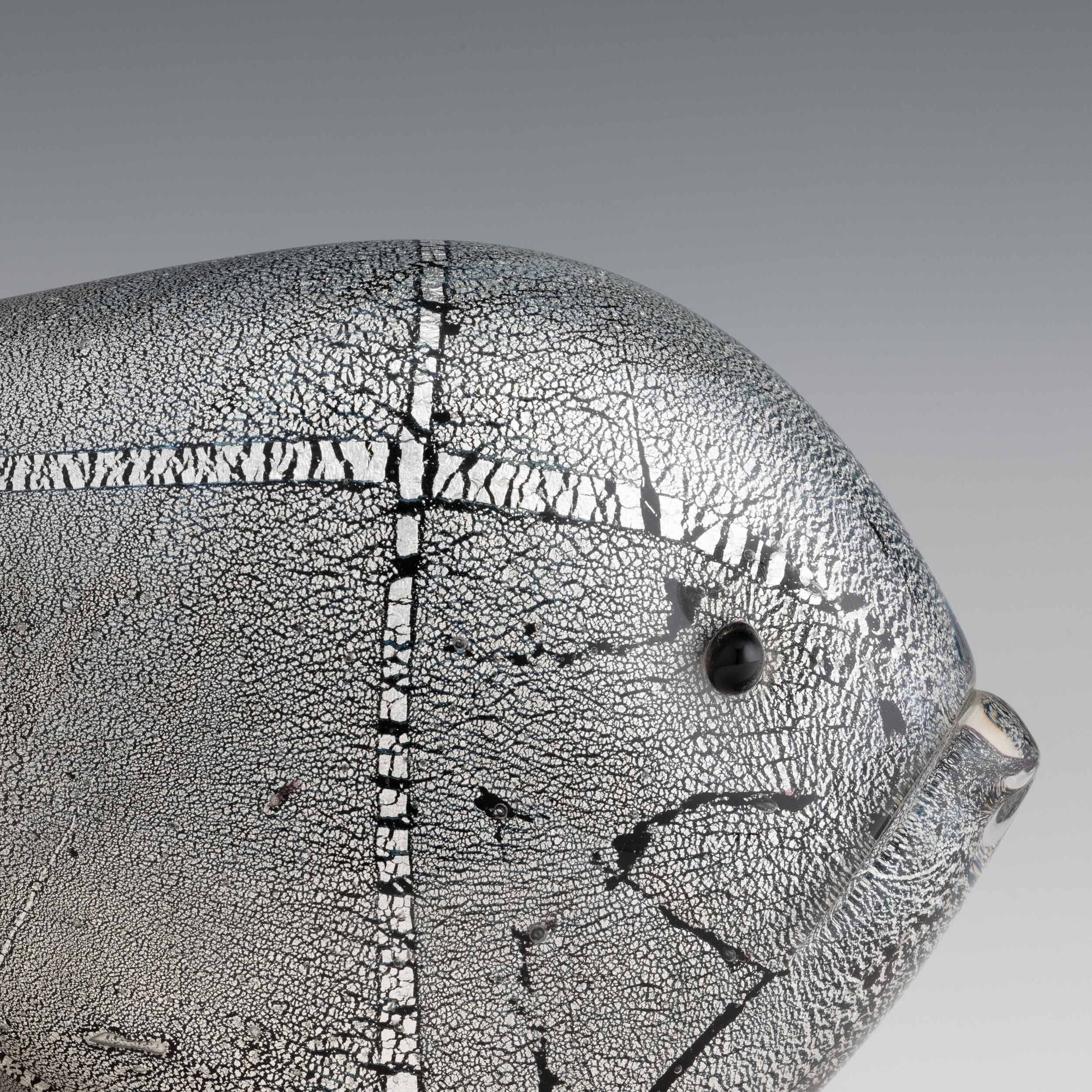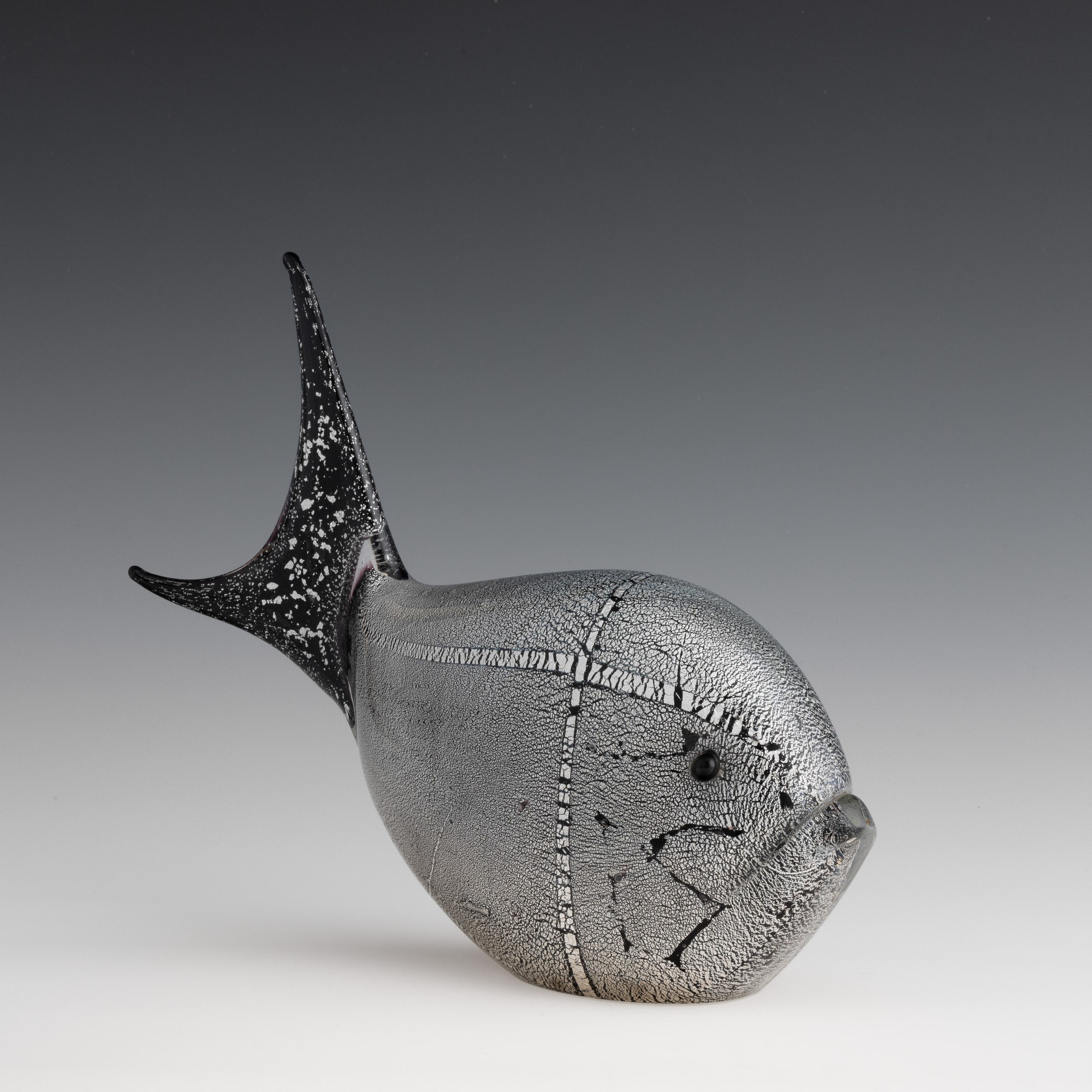 Soprammobile in forma di pesce in vetro sommerso con foglia argento e occhi applicati.