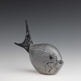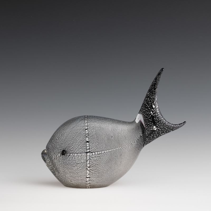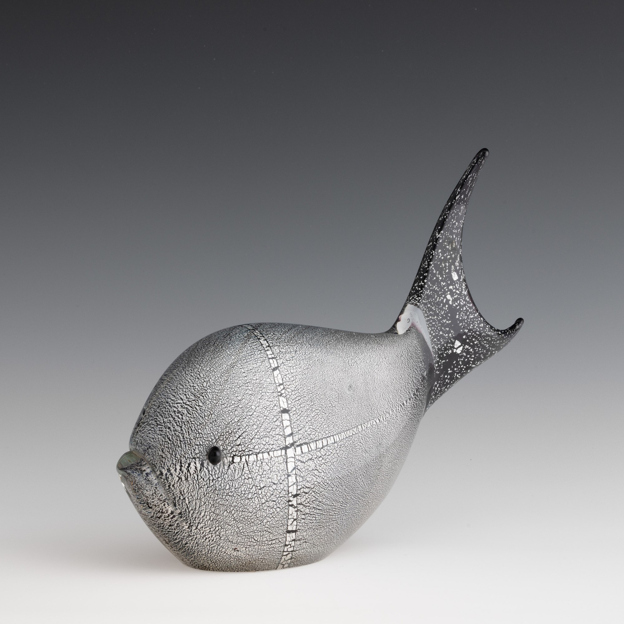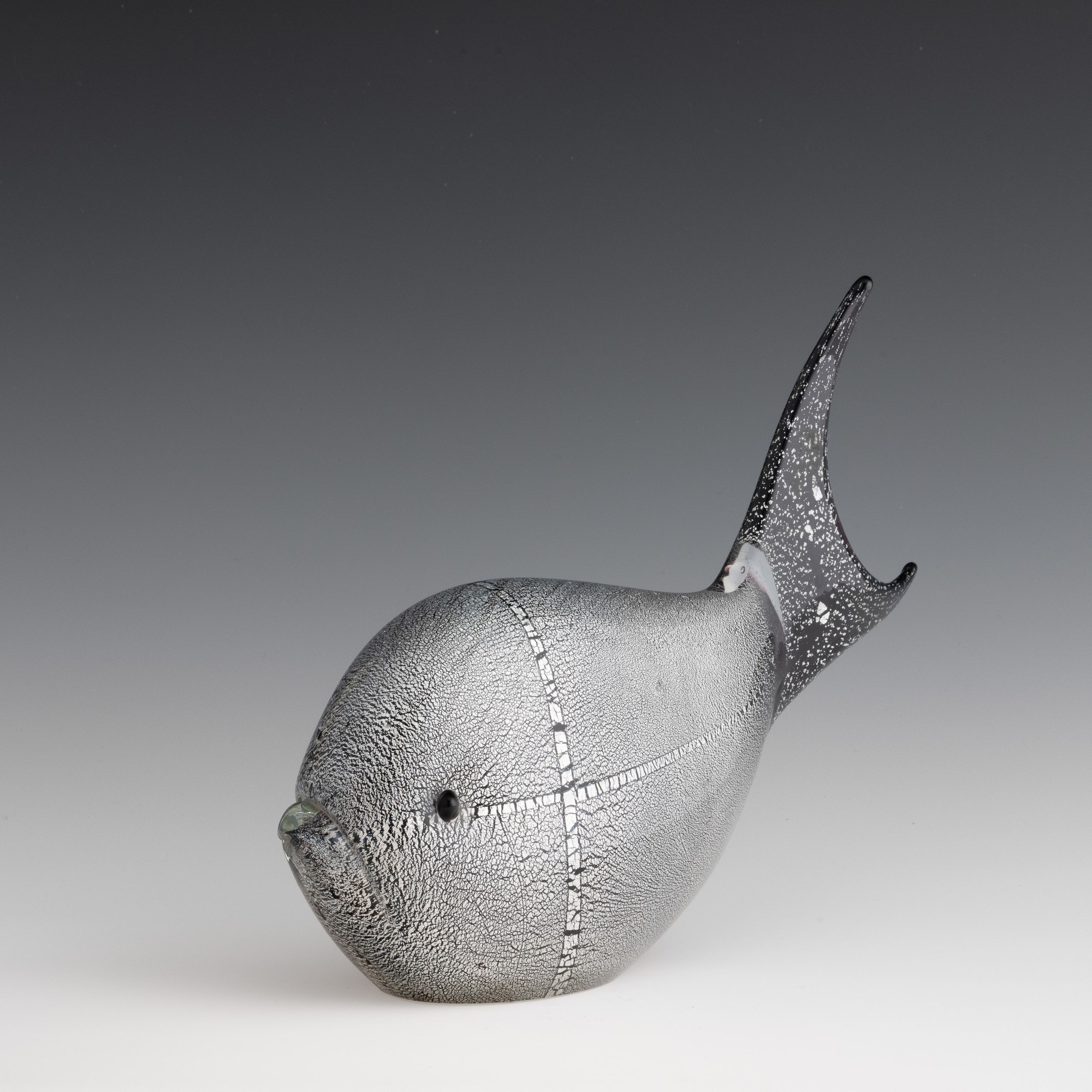 Soprammobile in forma di pesce in vetro sommerso con foglia argento e occhi applicati.