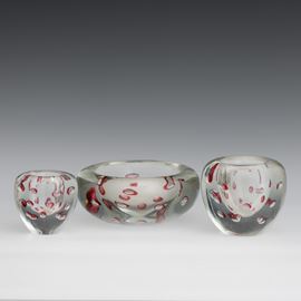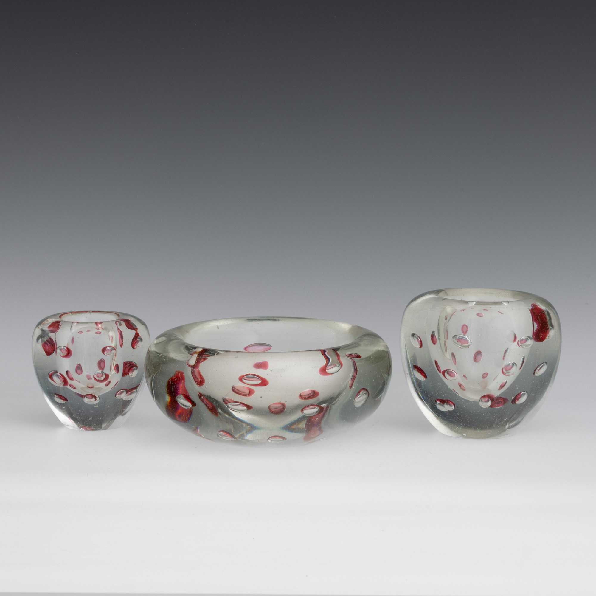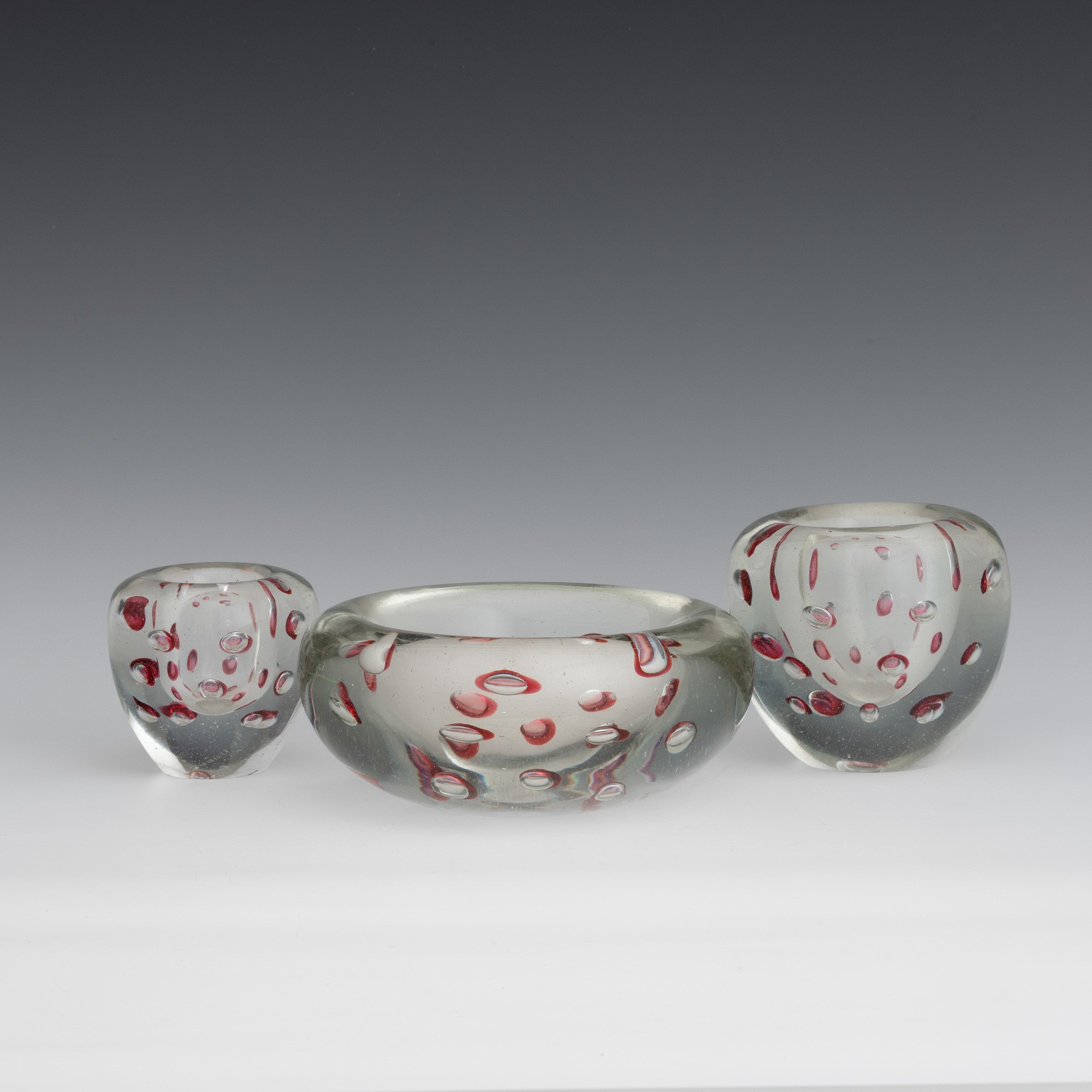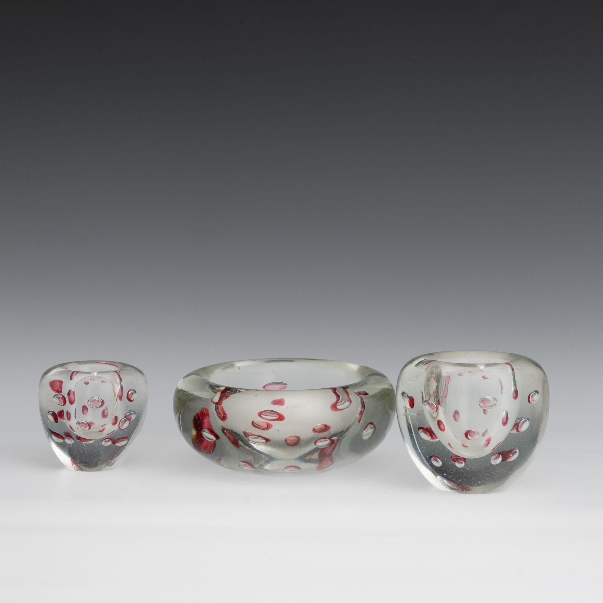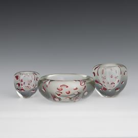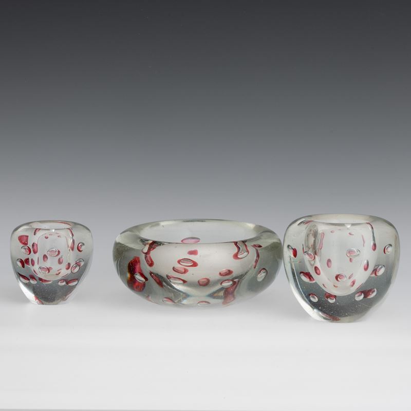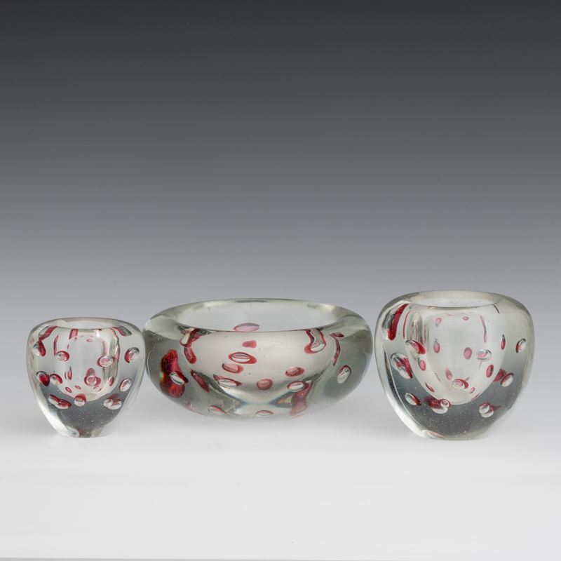 Lotto di un centrotavola e due vasetti in vetro pesante con inclusione di bolle regolari sommerse.