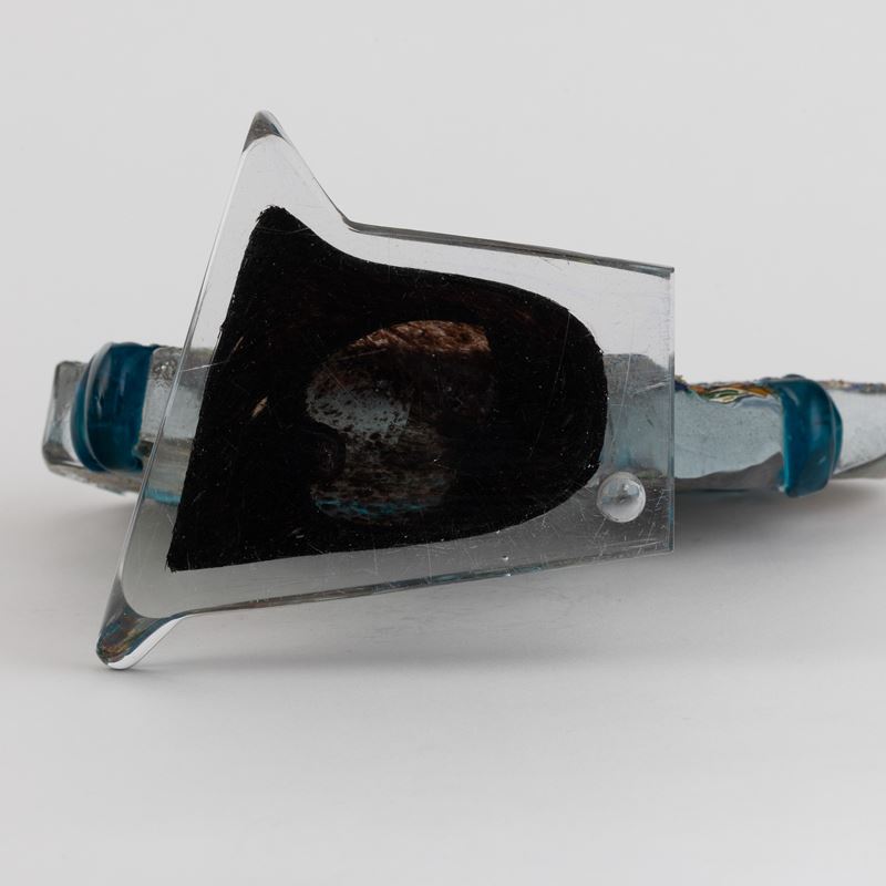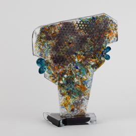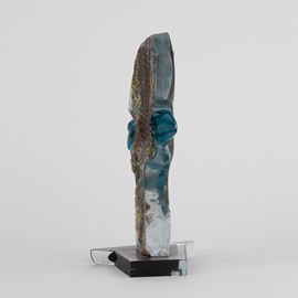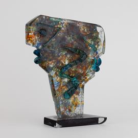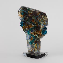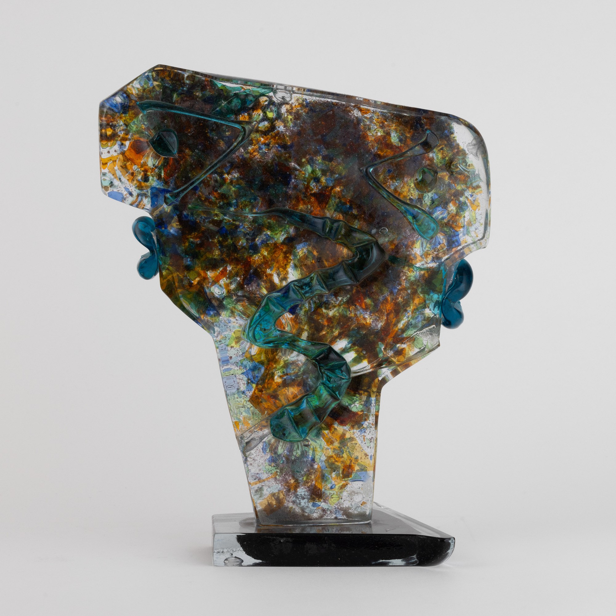 Scultura in forma di placca raffigurante ritratto bifronte con decoro di canne applicate e polveri policrome. Basamento in cristallo molato asimmetrico.