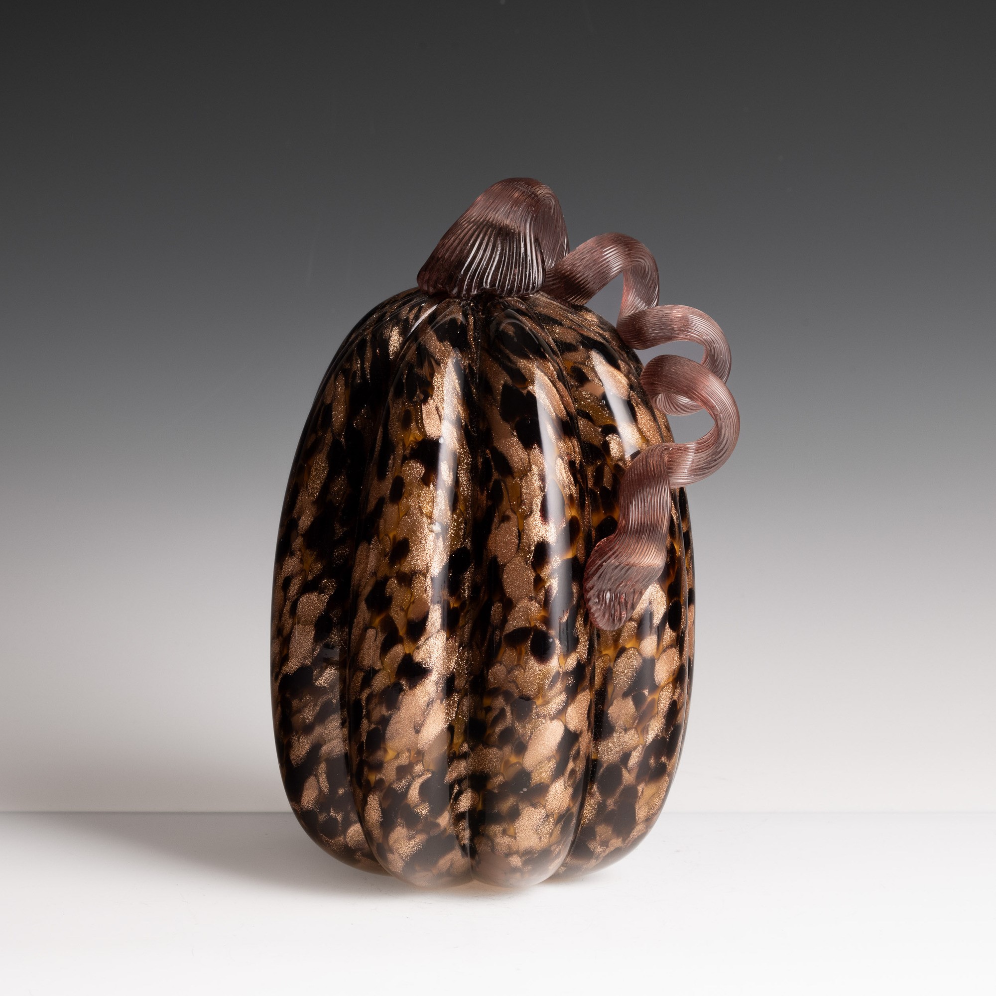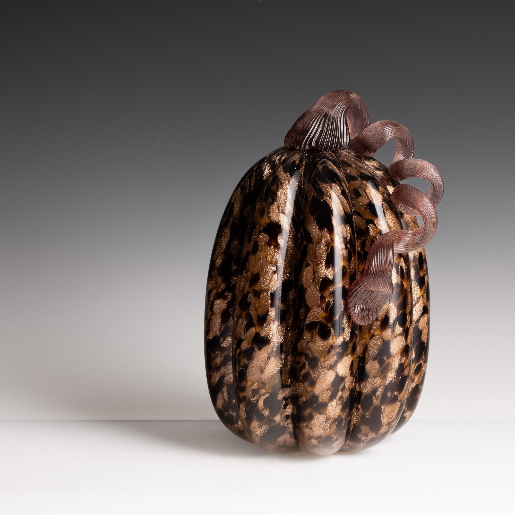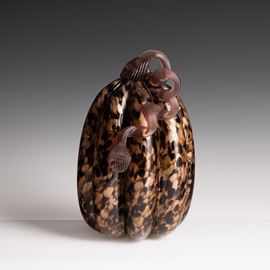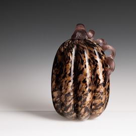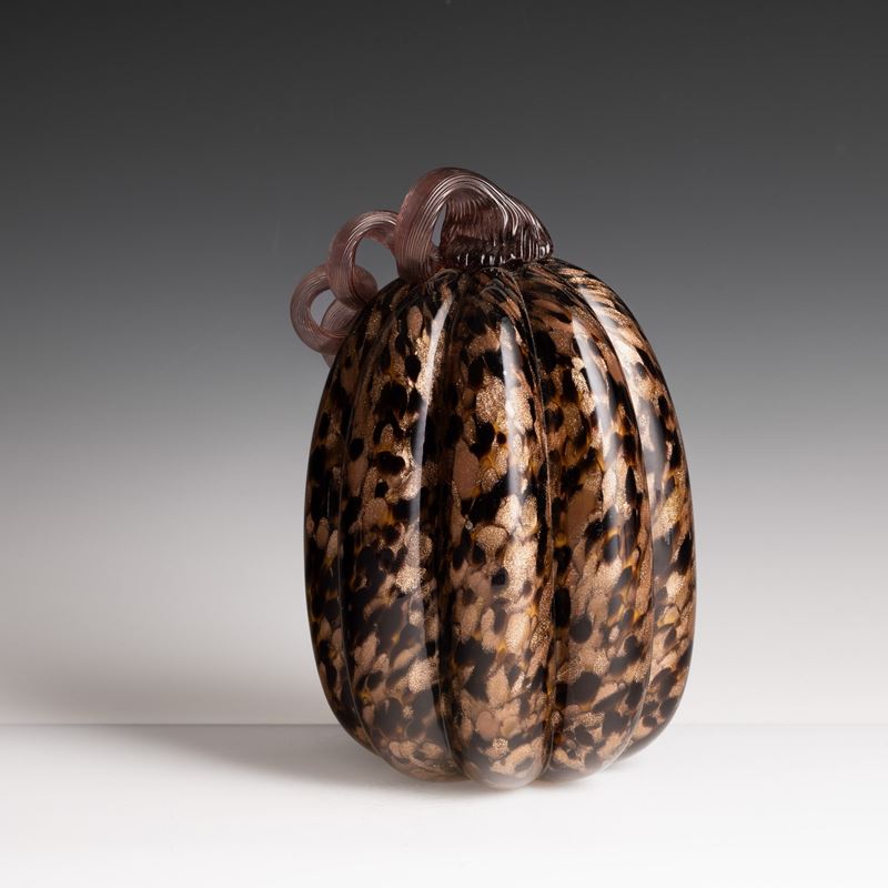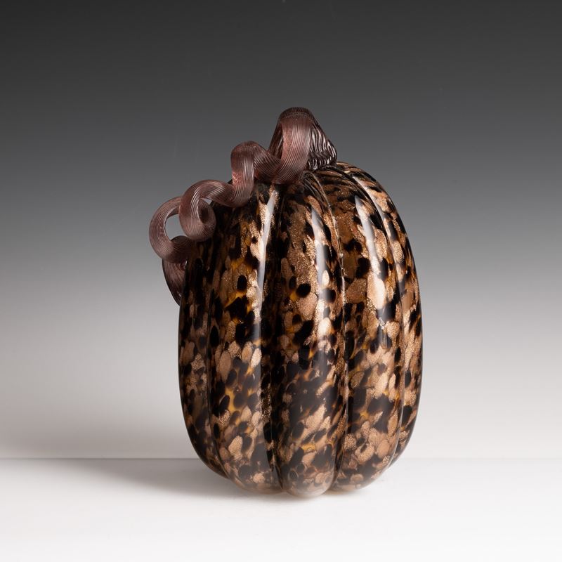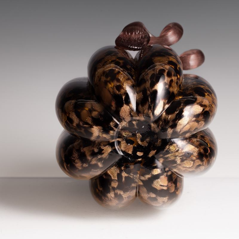 Soprammobile in forma di zucca in vetro soffiato con decoro di macchie policrome e avventurina.