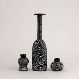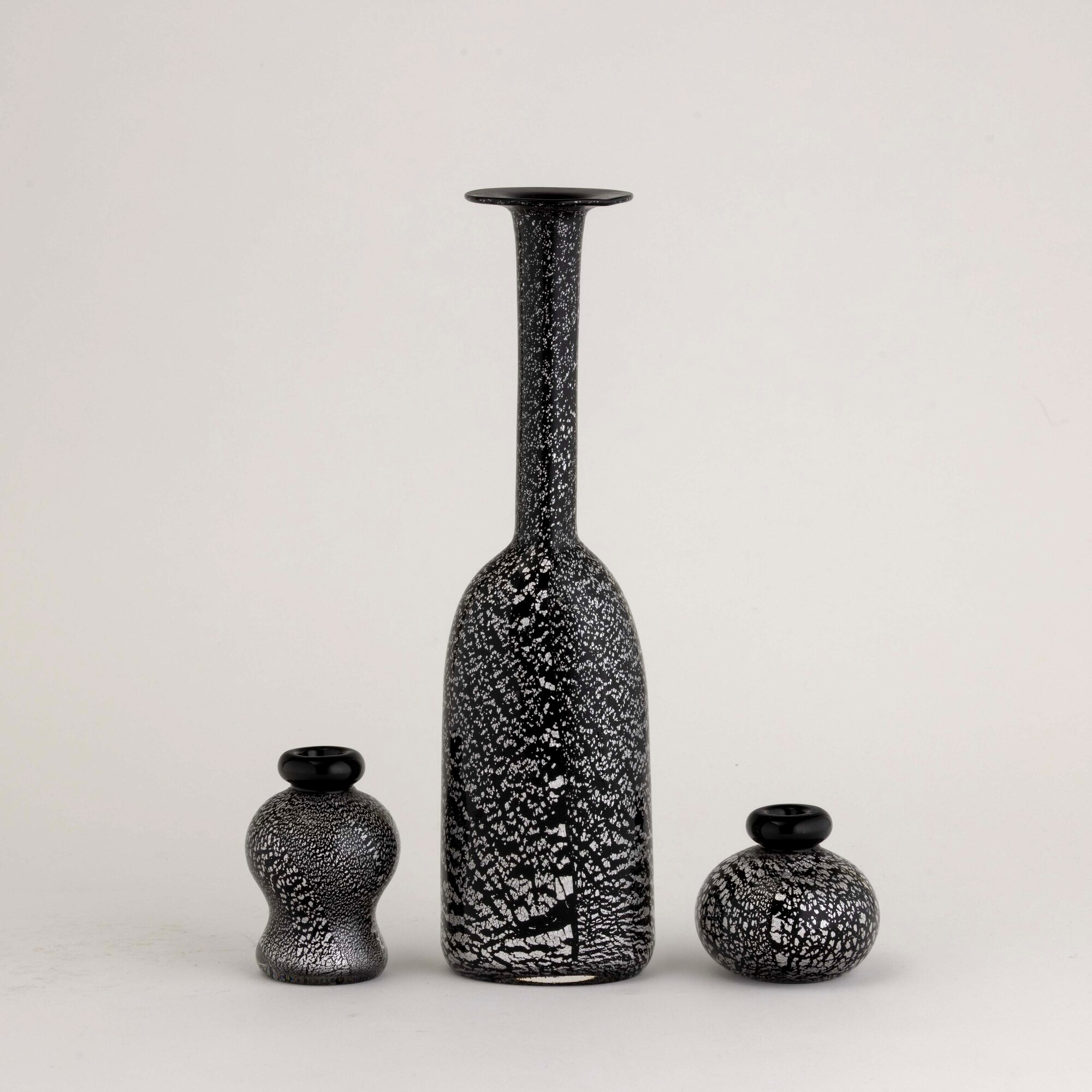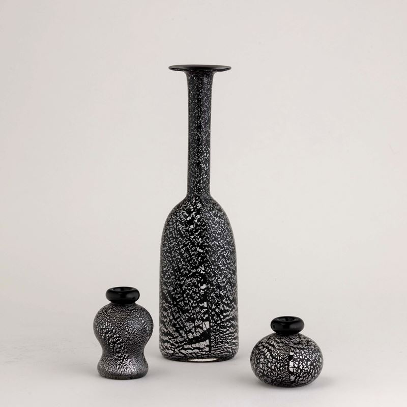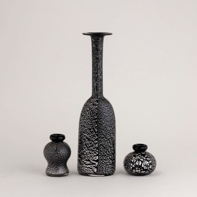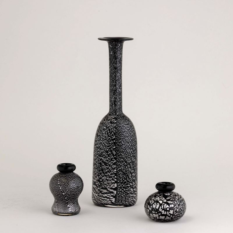 Lotto formato da vaso a bottiglia e due ampolle in vetro sommerso con decoro di inclusioni metalliche.