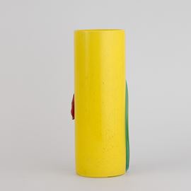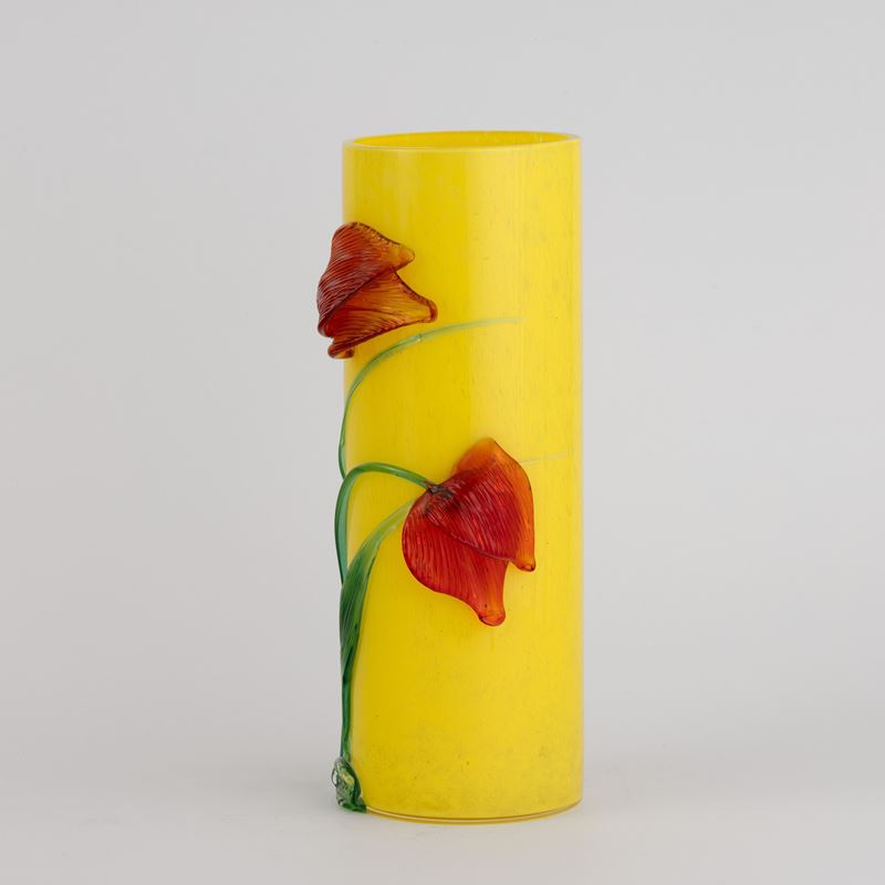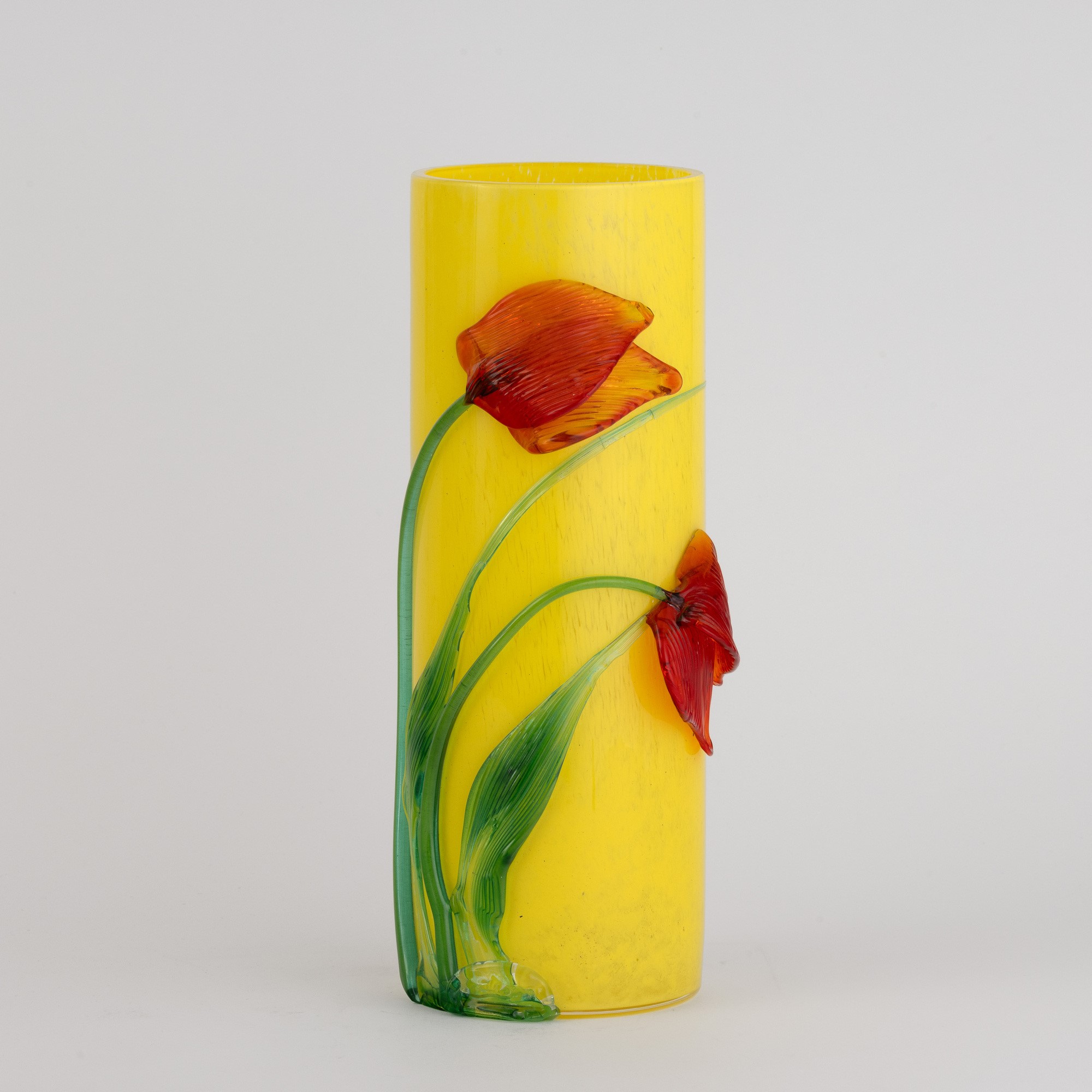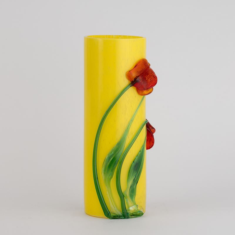 Vaso a cilindro in vetro soffiato con decoro di polveri policrome e applicazioni di tulipani in vetro modellato a caldo.