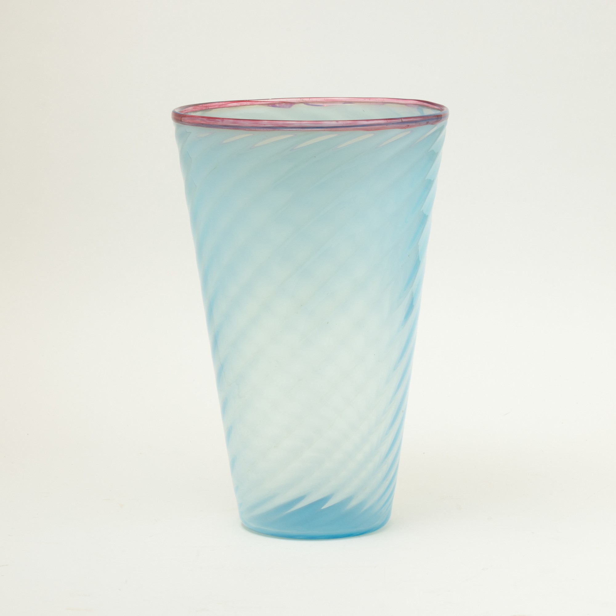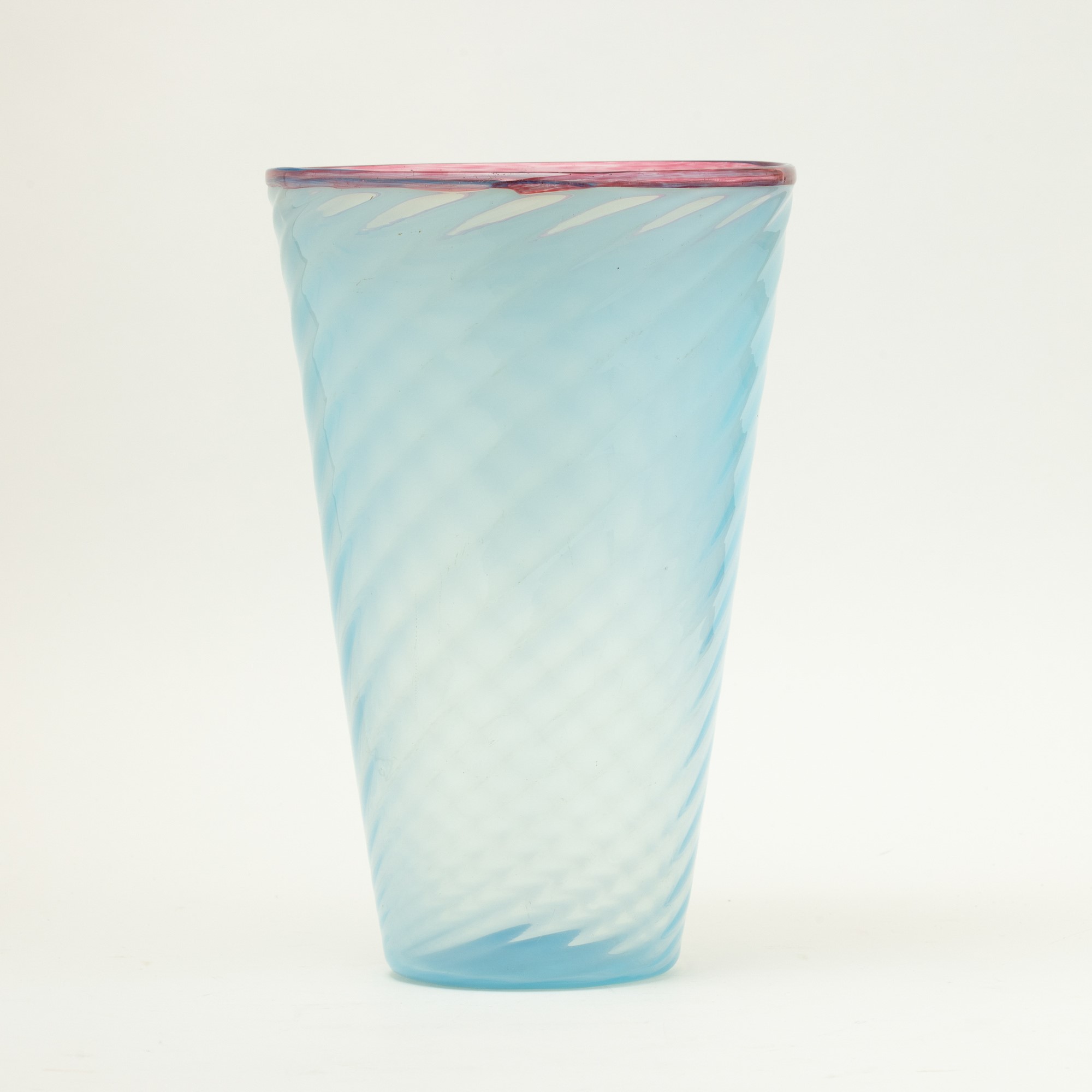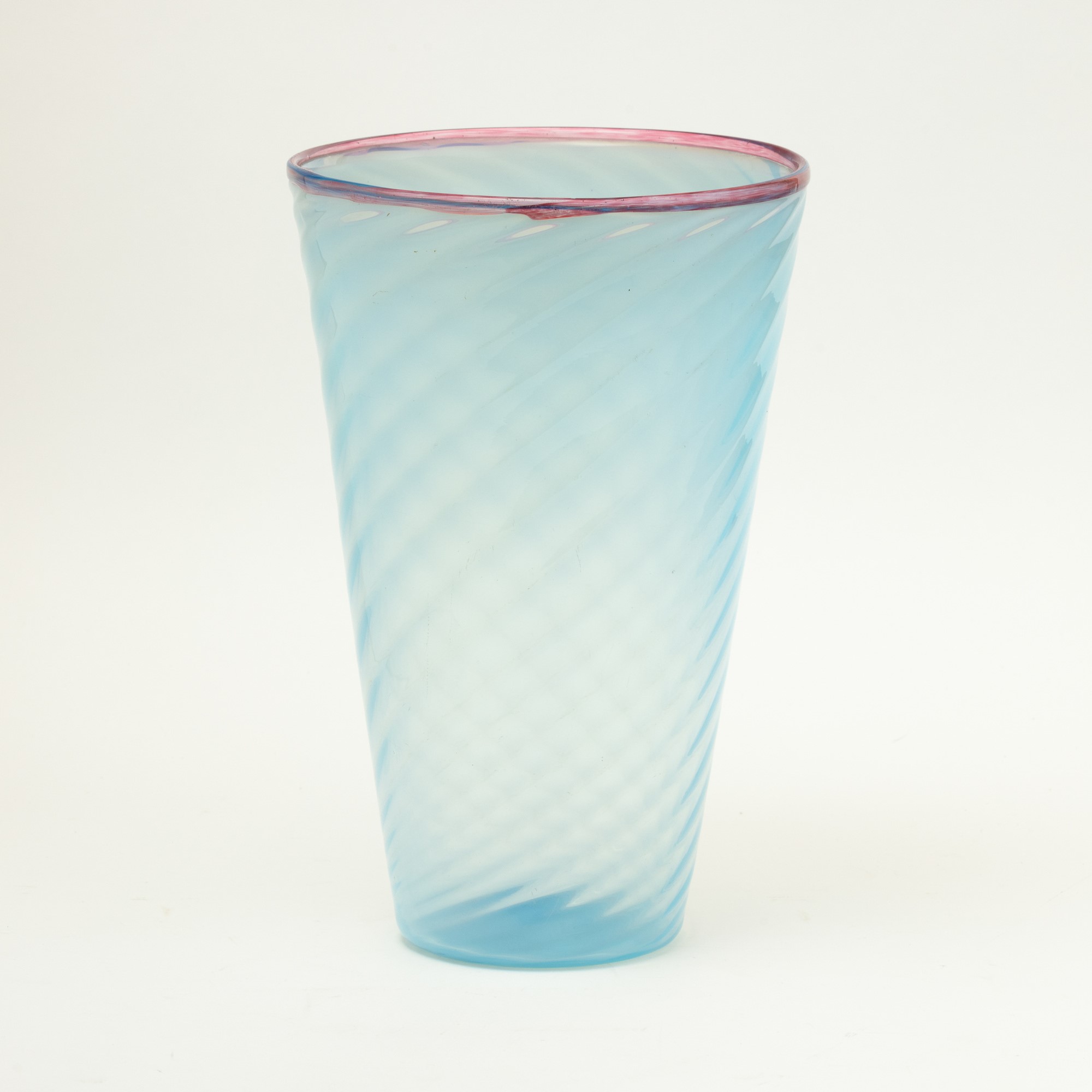 Grande vaso troncoconico in vetro opalescente soffiato entro stampo rigato.