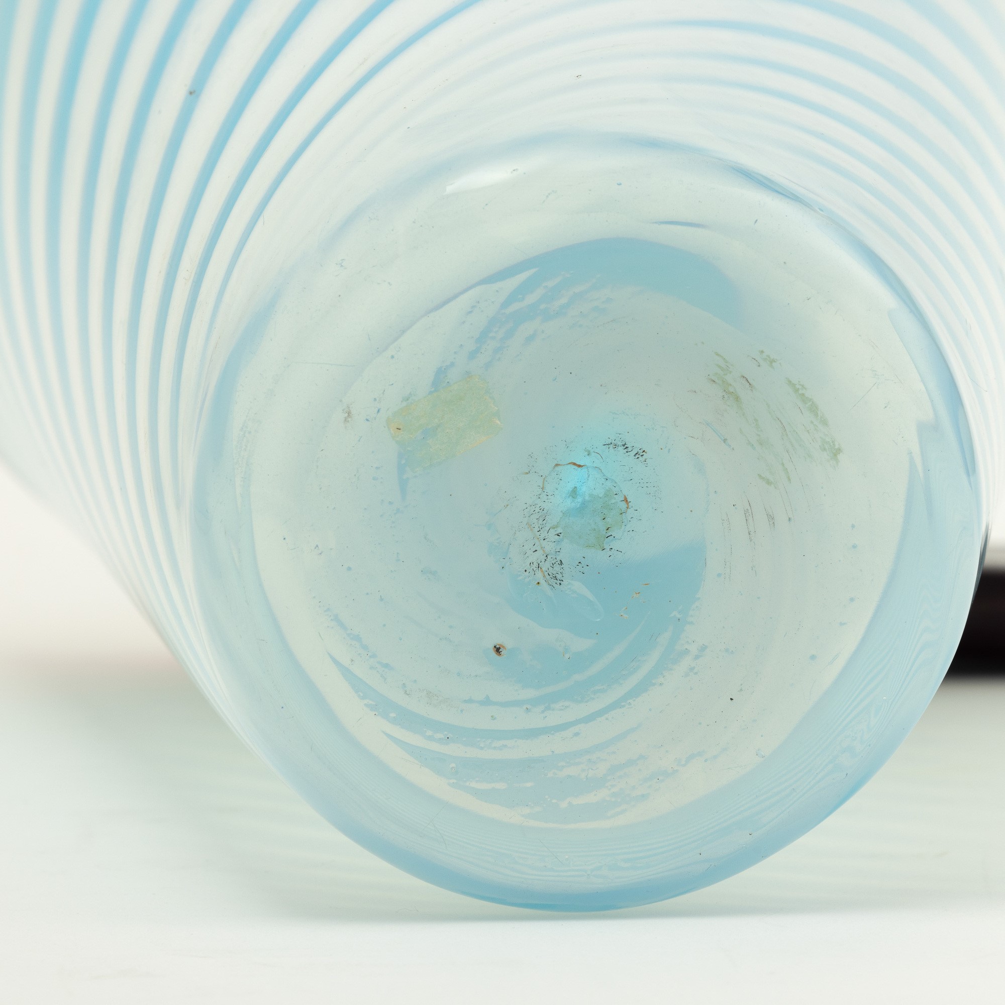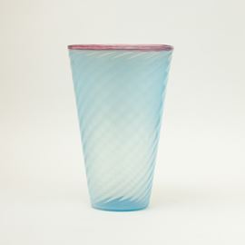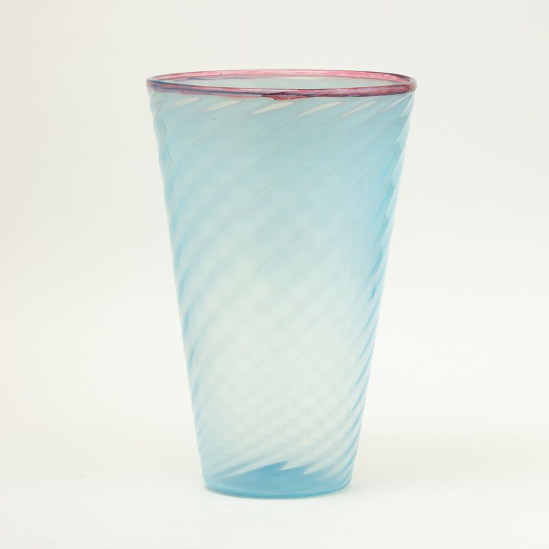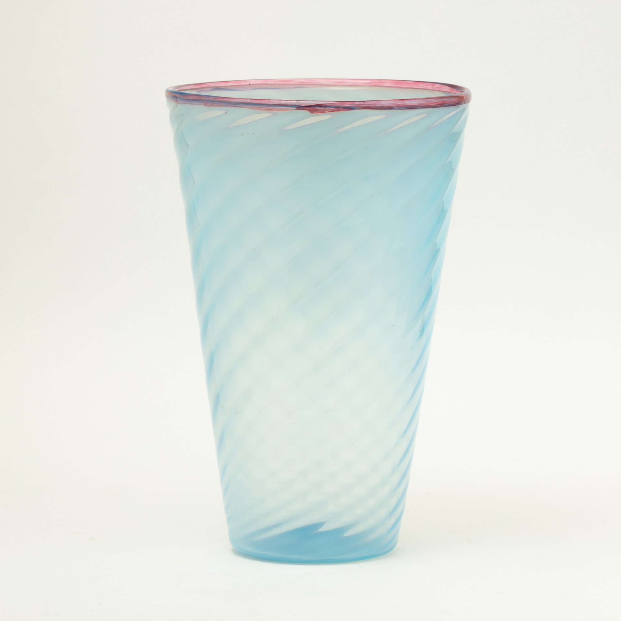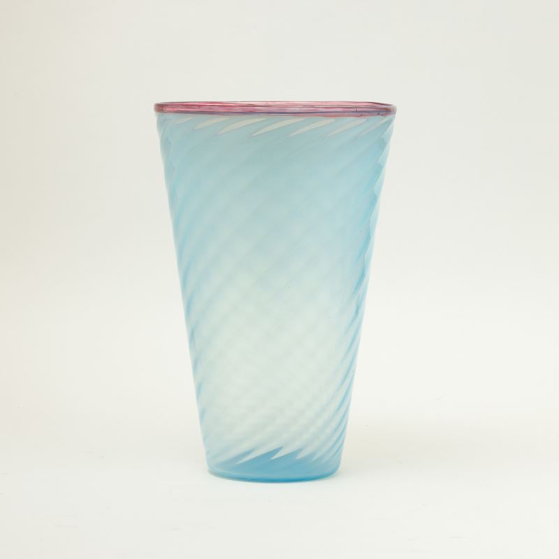 Grande vaso troncoconico in vetro opalescente soffiato entro stampo rigato.