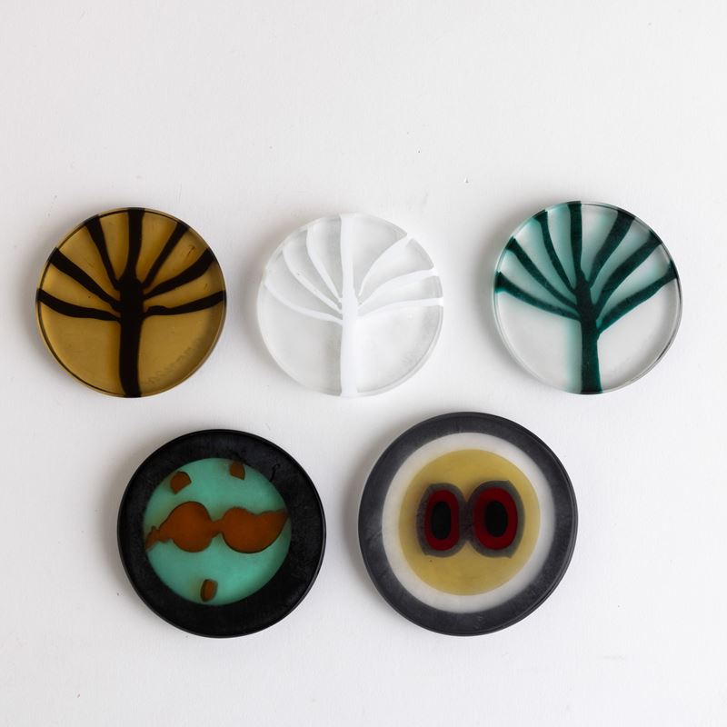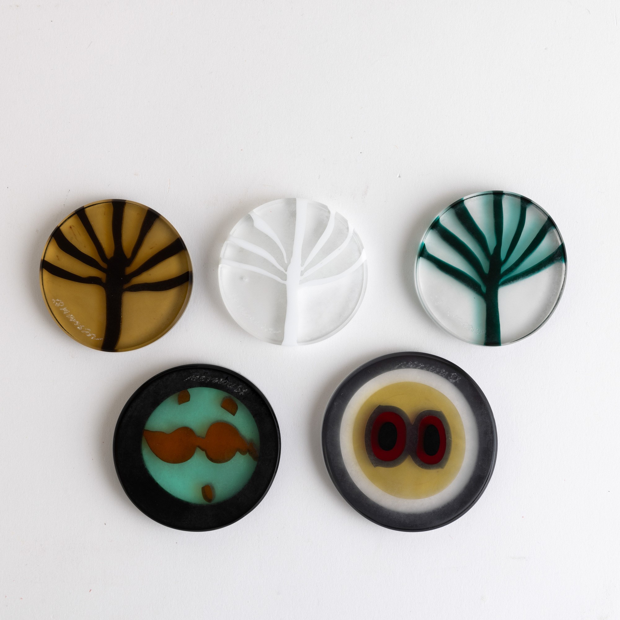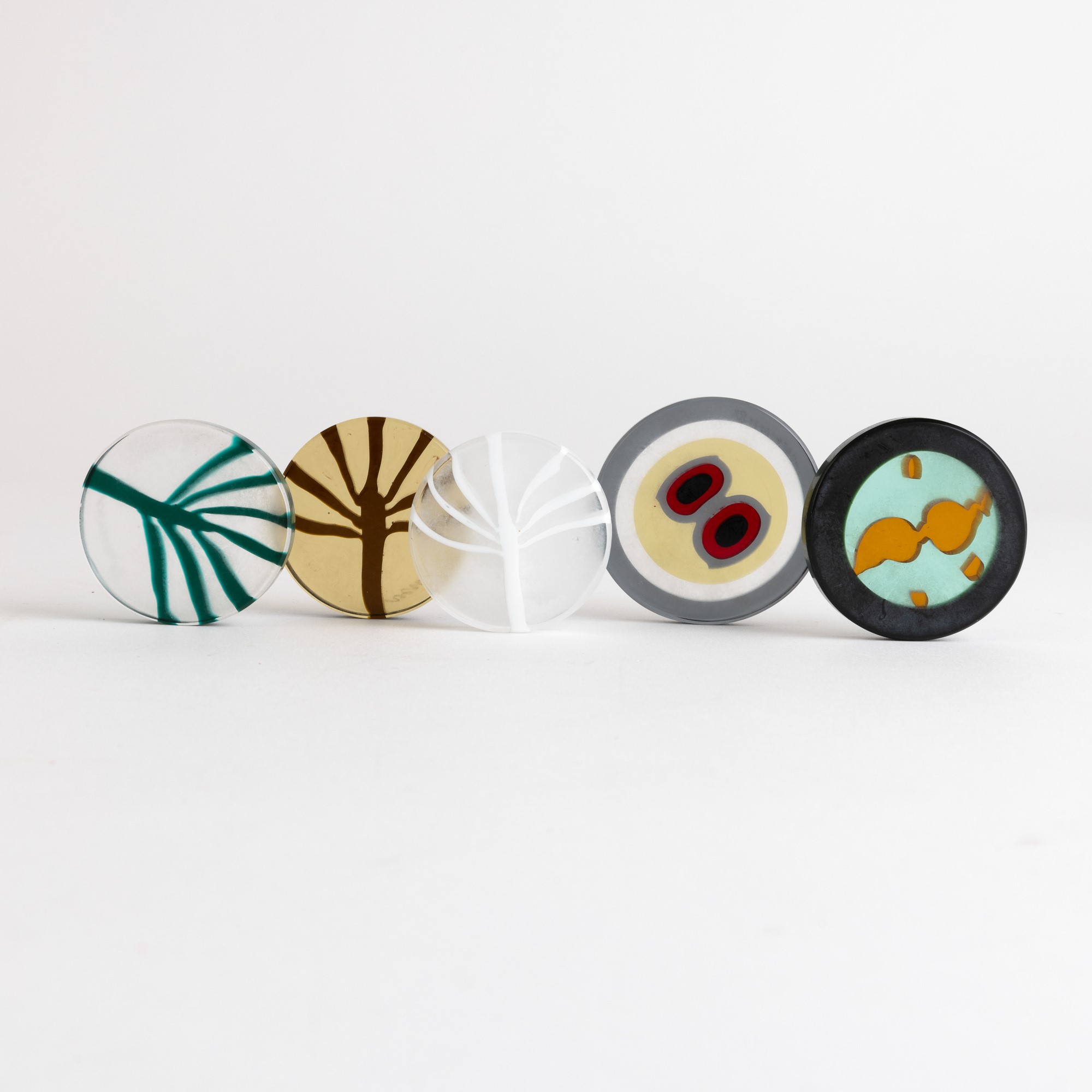 Cinque segnaposto in vetro con decoro a murrine policrome. Firme a punta.