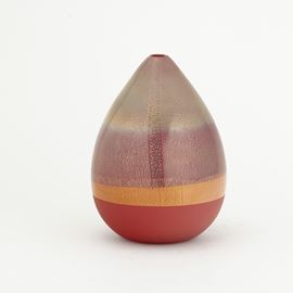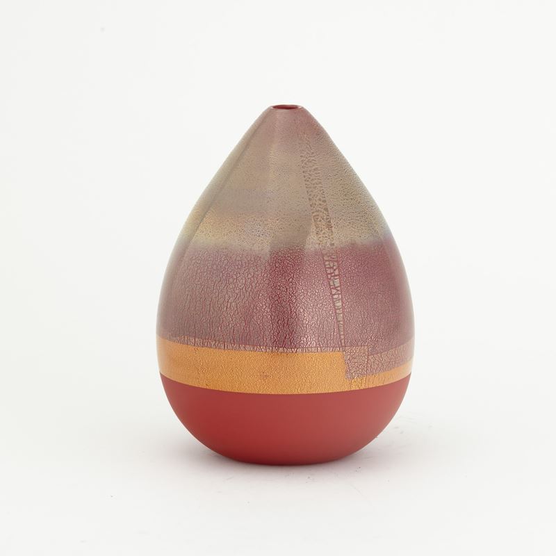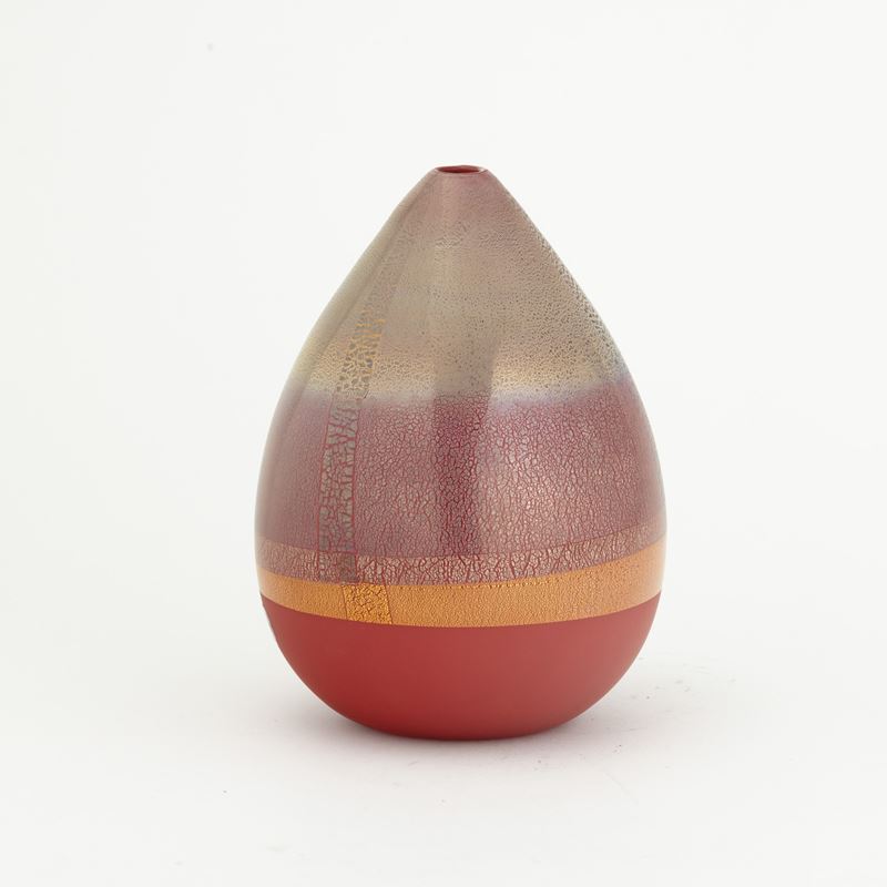 Vaso serie Quarzi in vetro soffiato rosso con decoro di foglia oro e argento e base satinata.