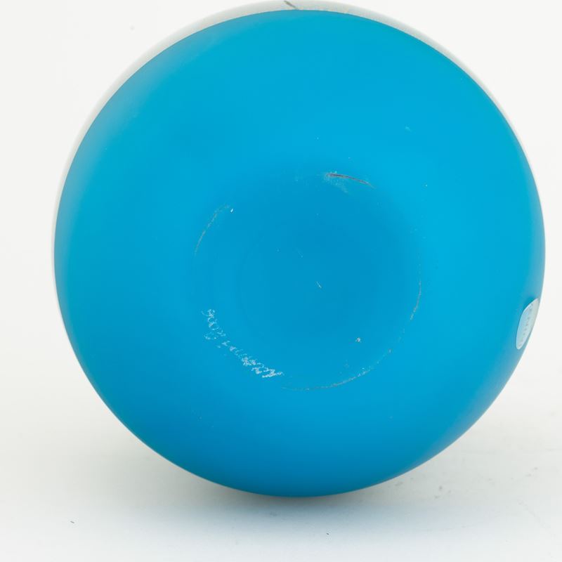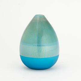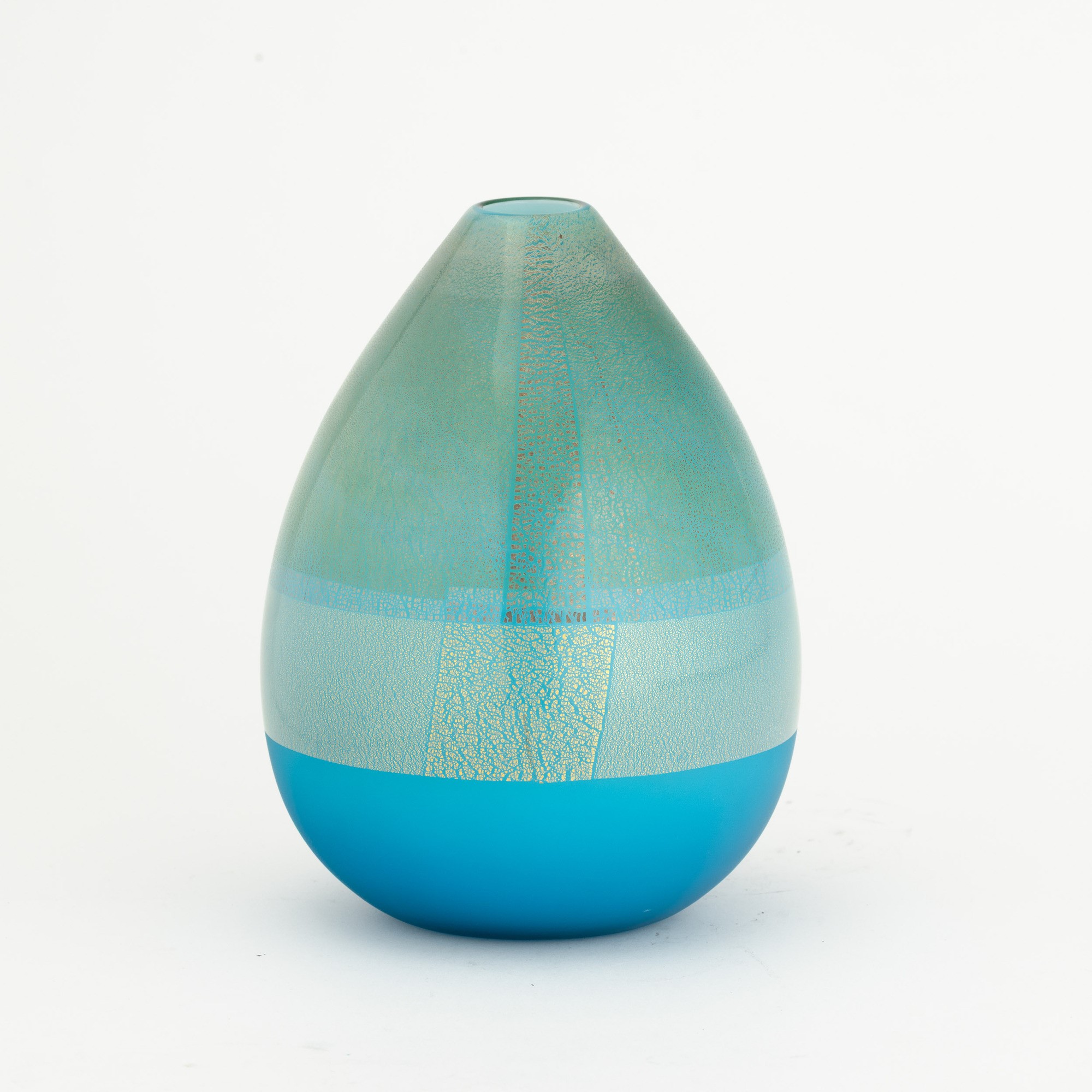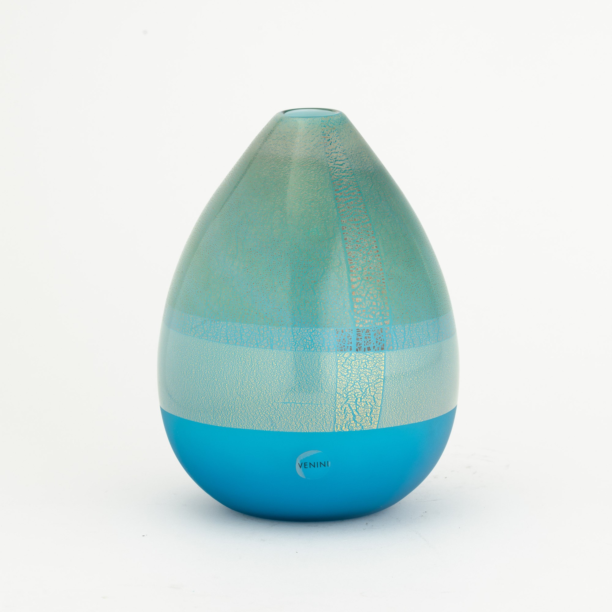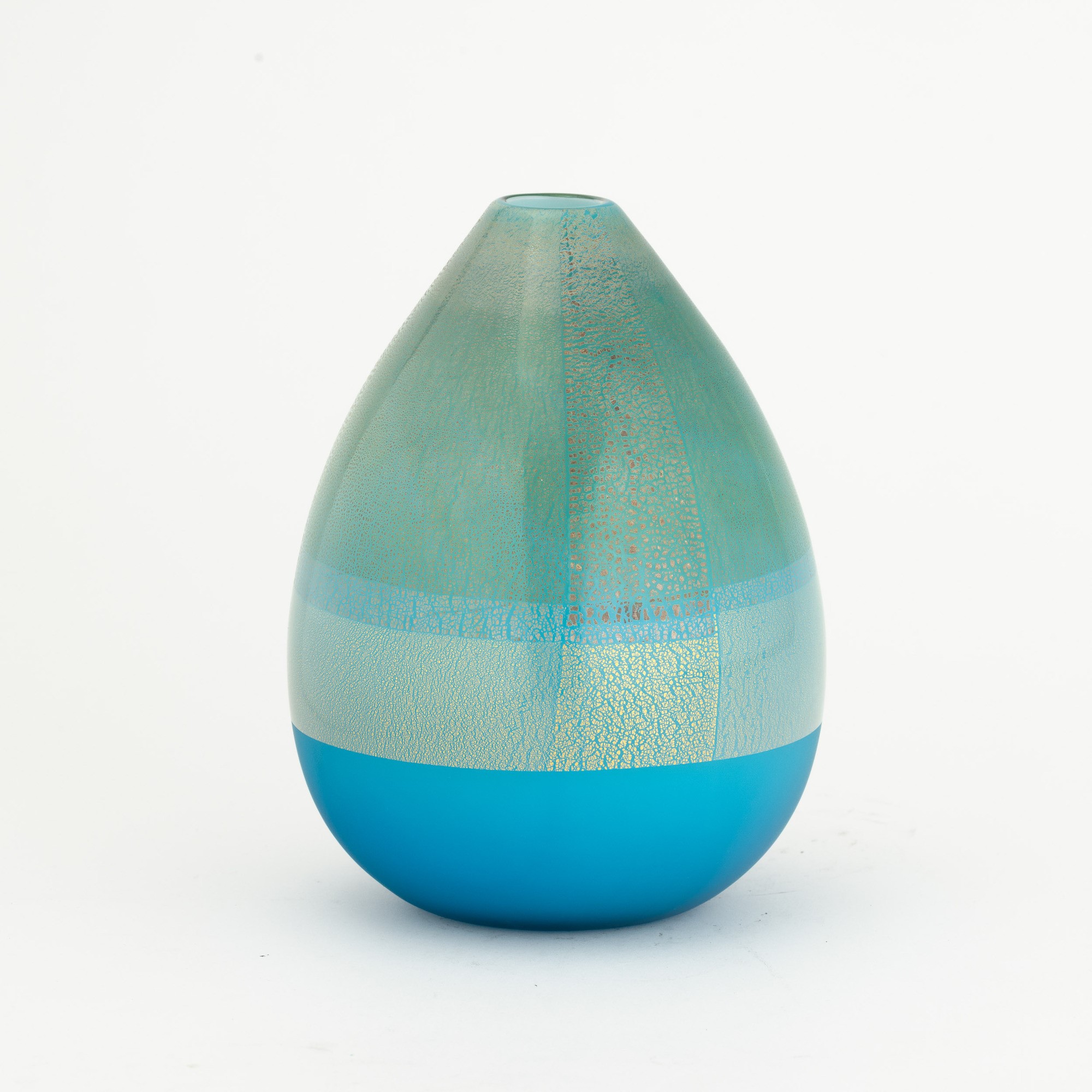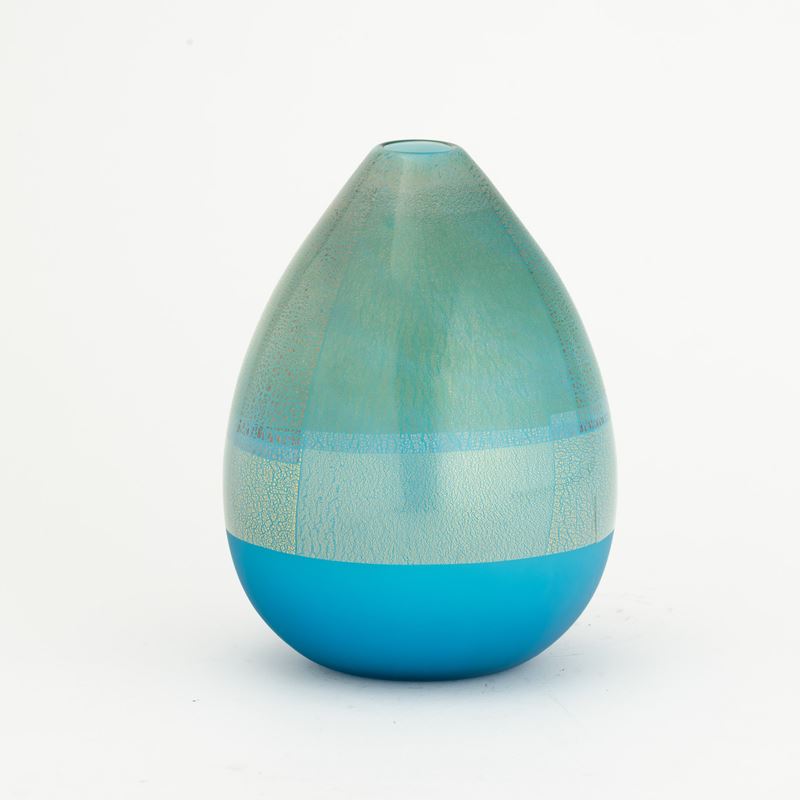 Vaso serie Quarzi in vetro soffiato acquamarina con decoro di foglia oro e argento e base satinata.