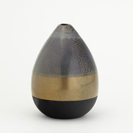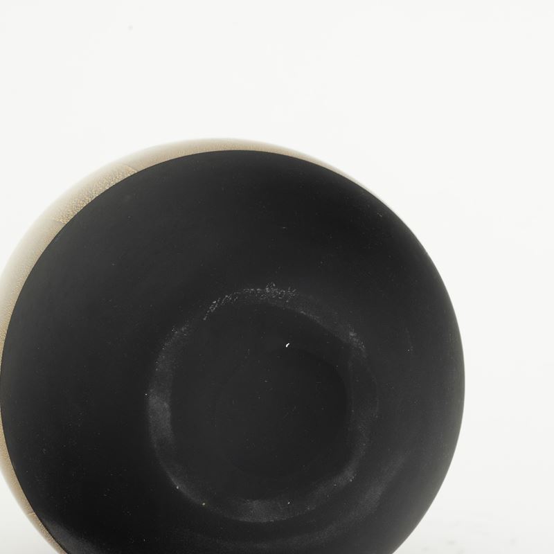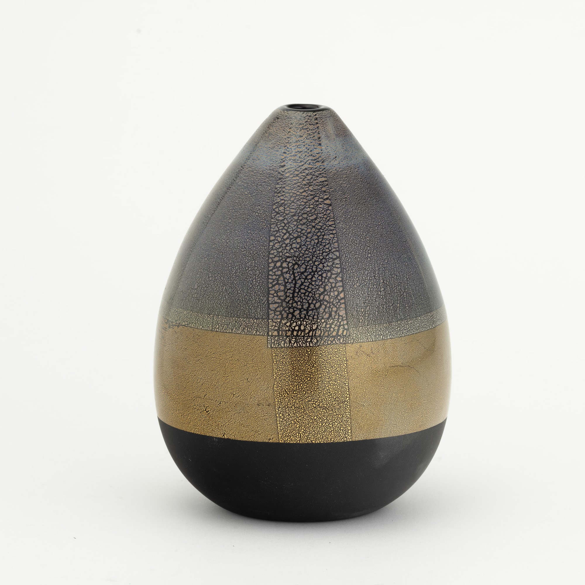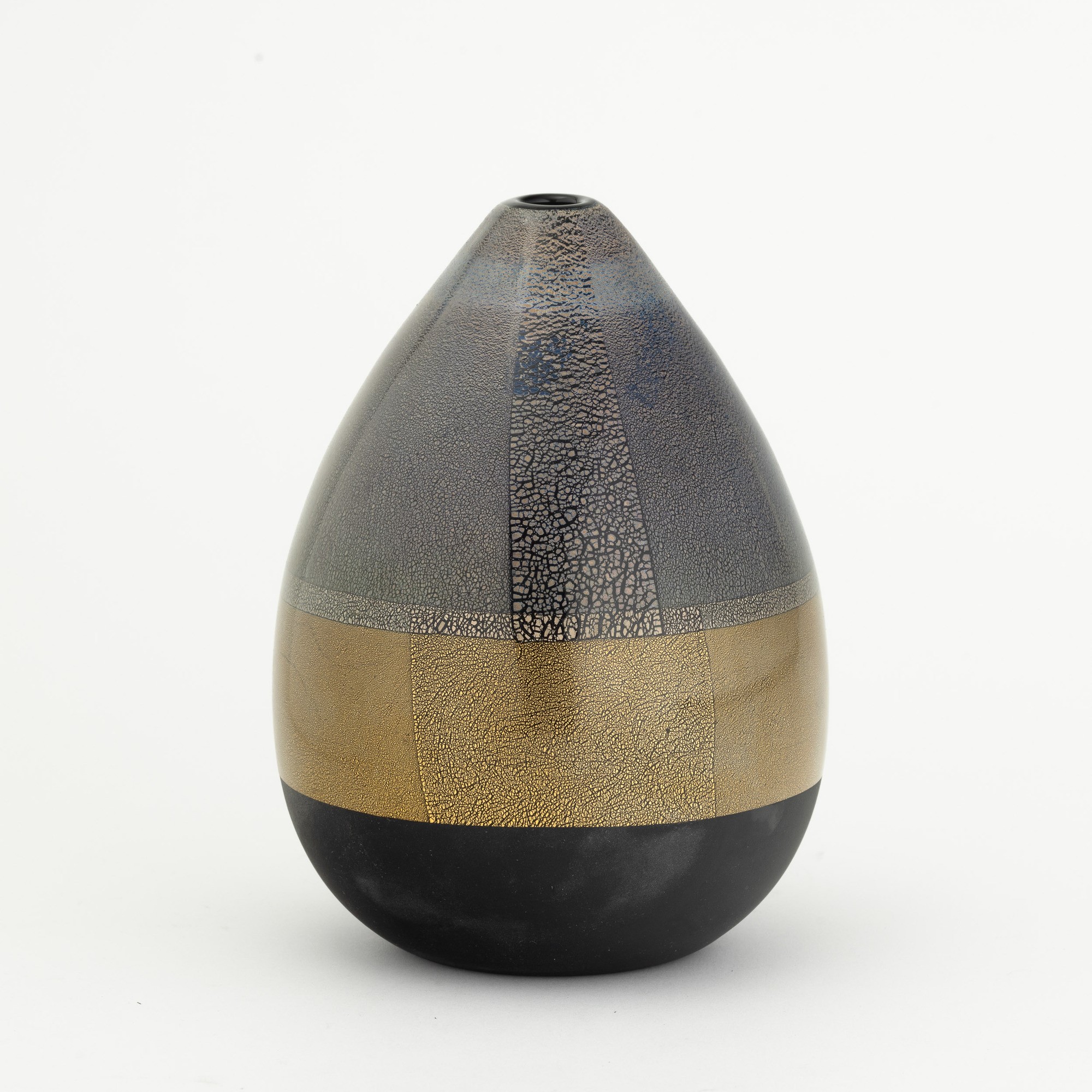 Vaso serie Quarzi in vetro soffiato nero con decoro di foglia oro e argento e base satinata.