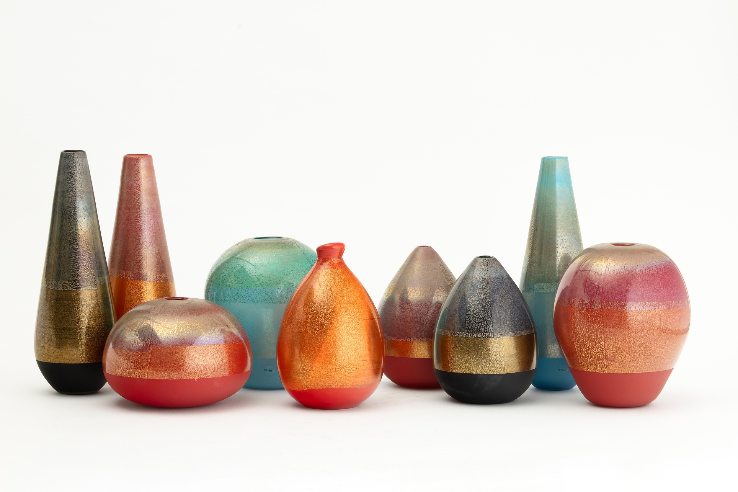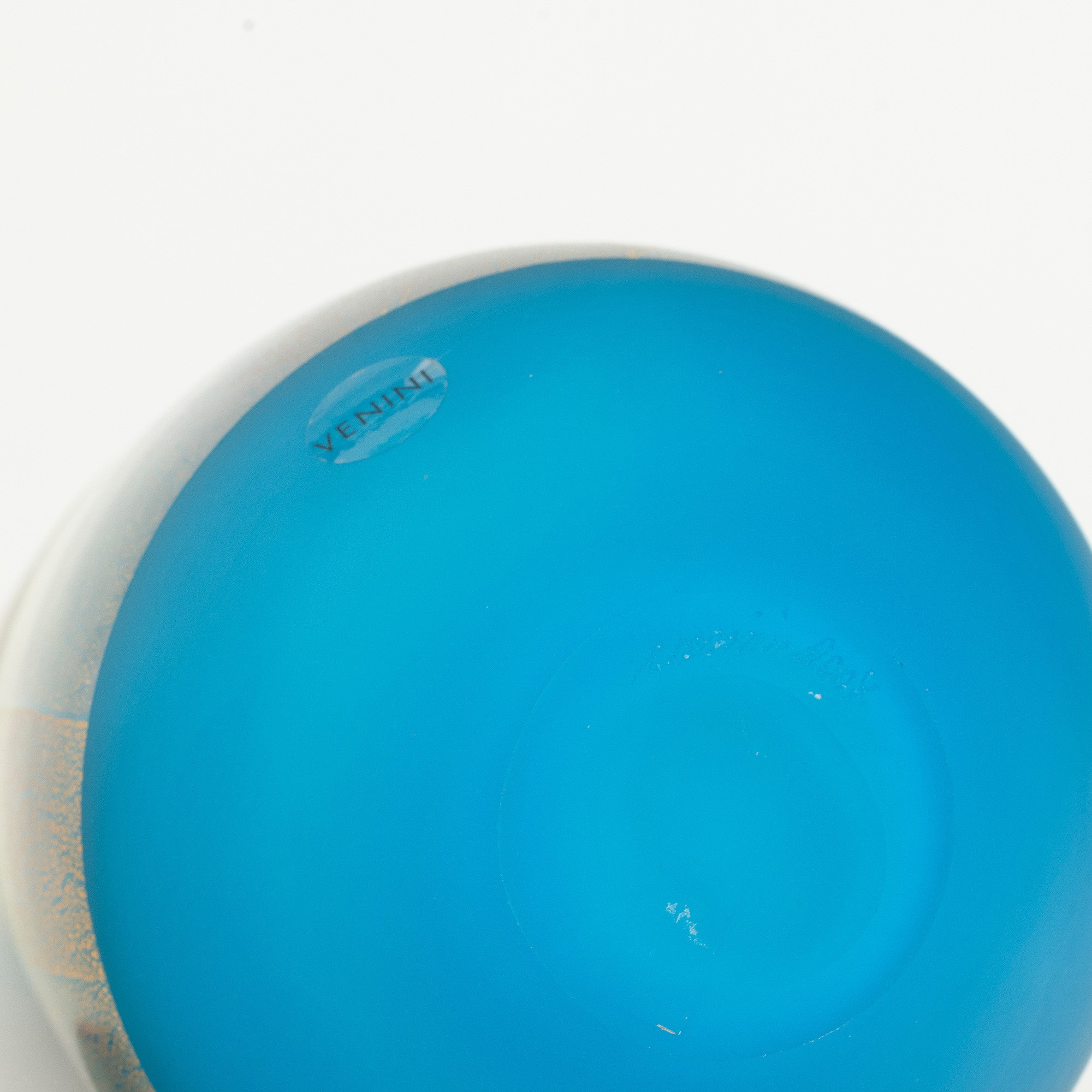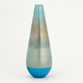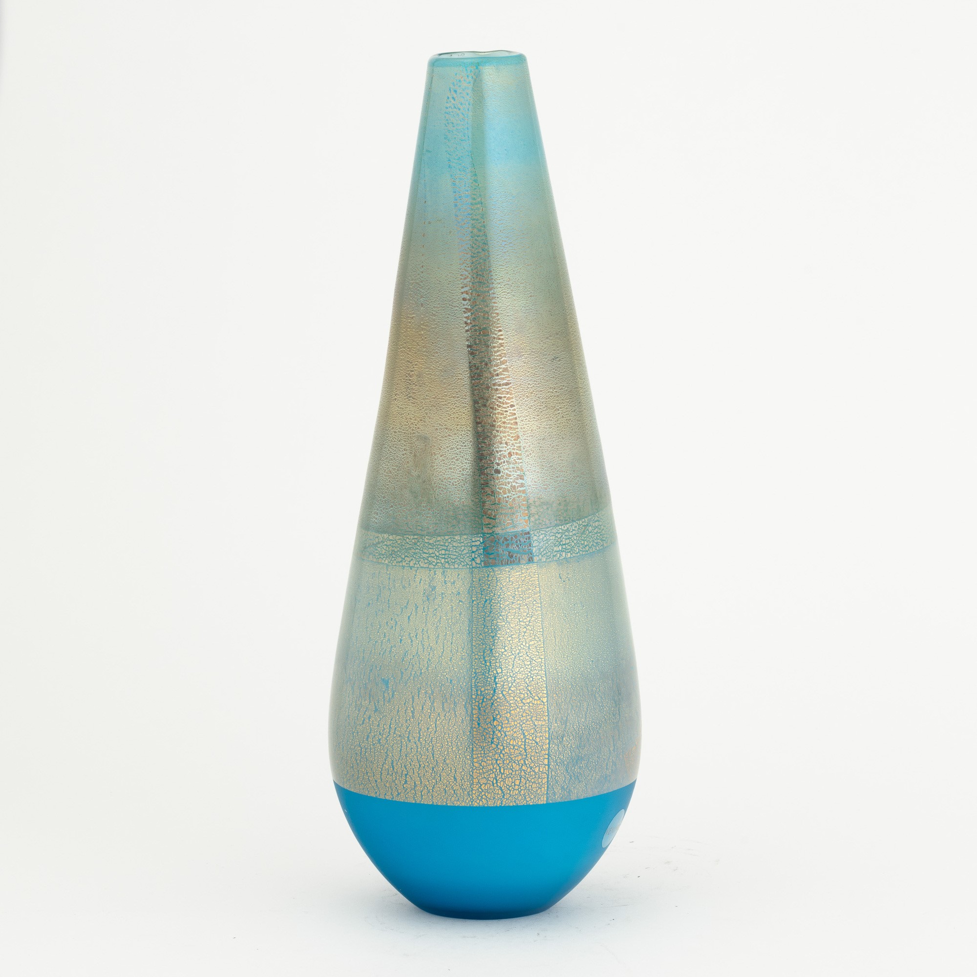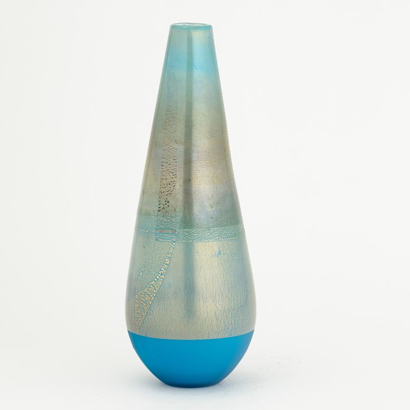 Vaso serie Quarzi in vetro soffiato acquamarina con decoro di foglia oro e argento e base satinata.
