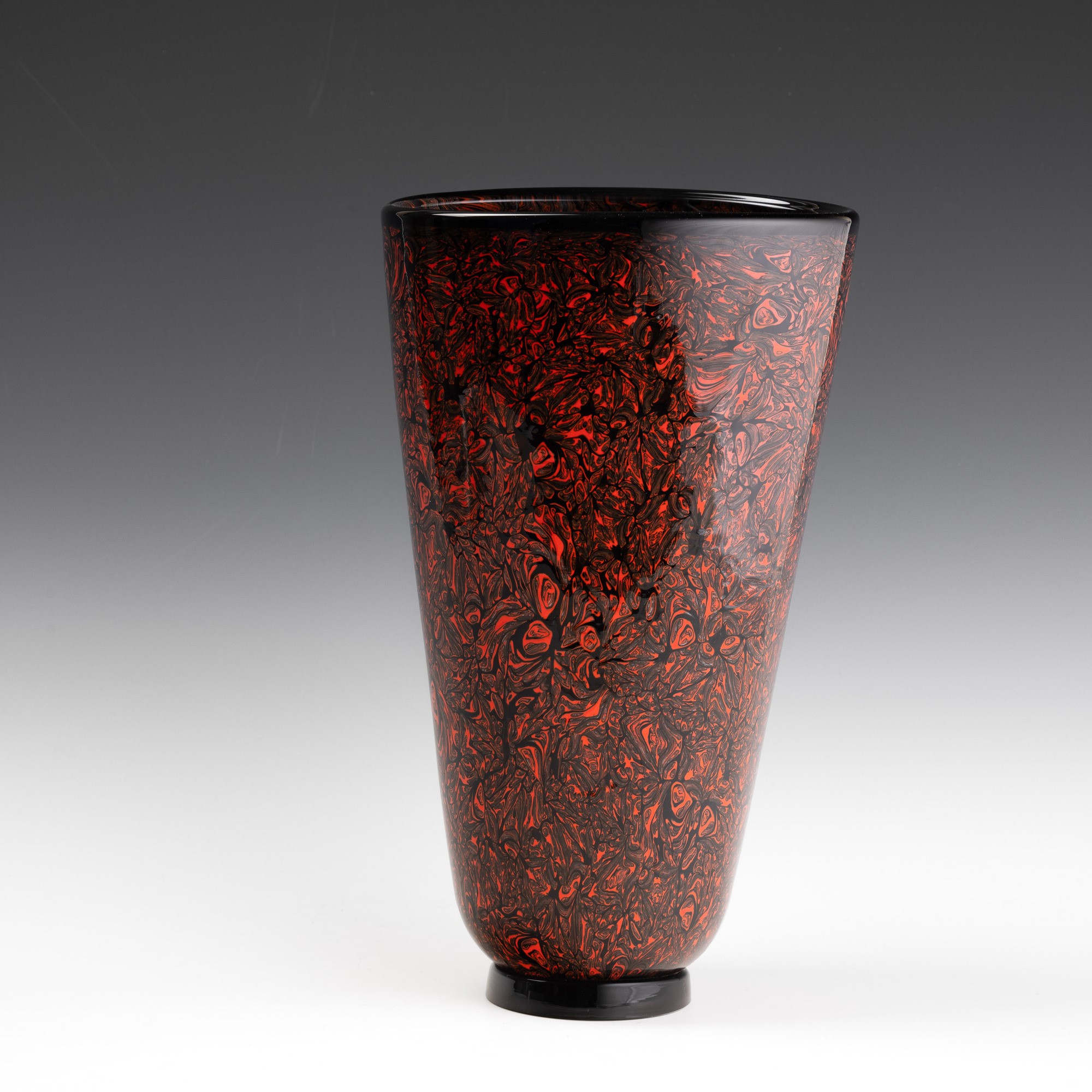 Vaso troncoconico a sezione ovale serie Mosaico in vetro sommerso con decoro di murrine variegate rosse rubino. Piede circolare applicato.