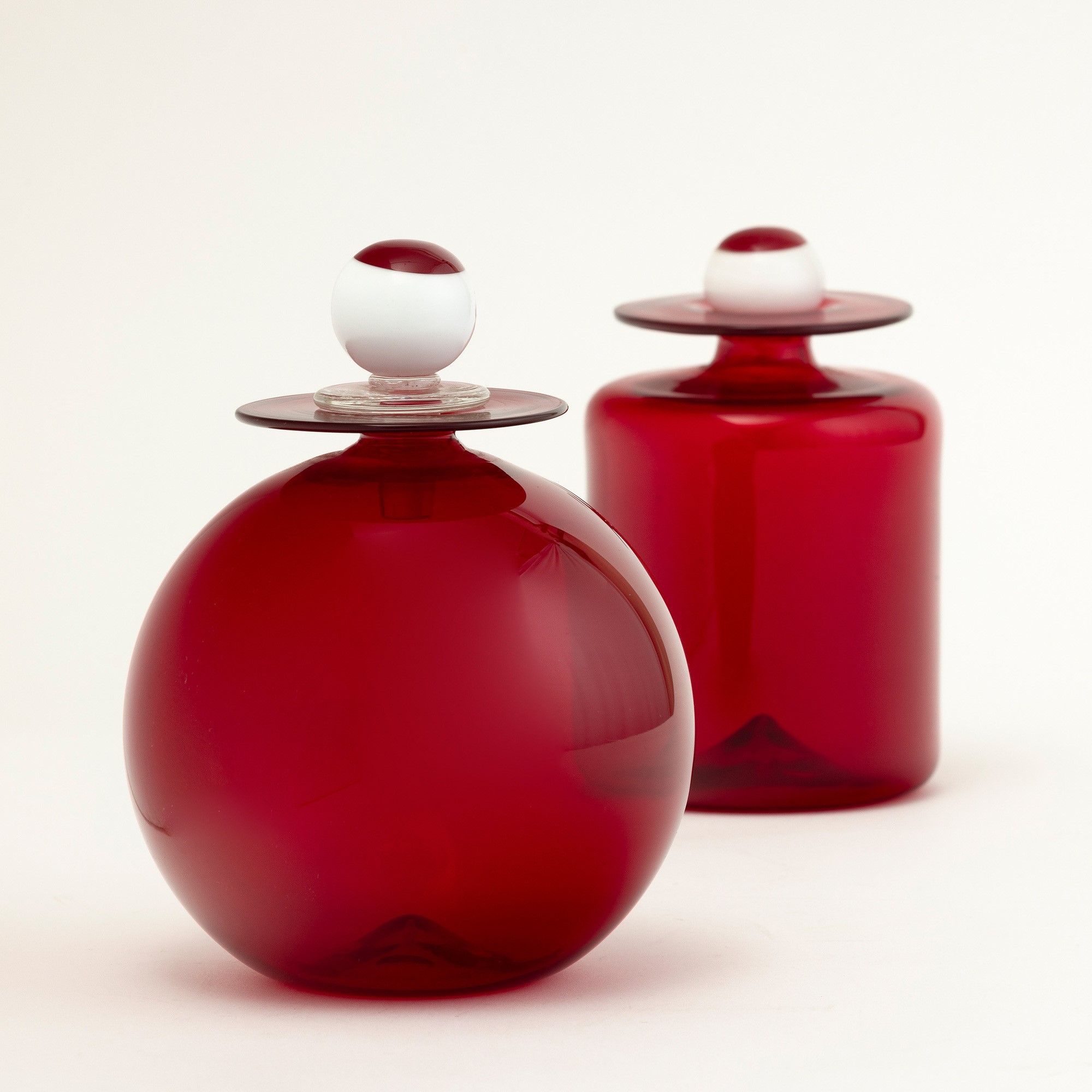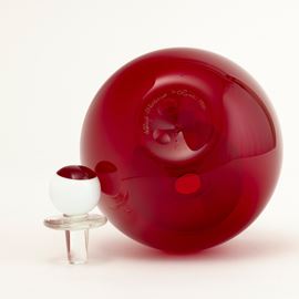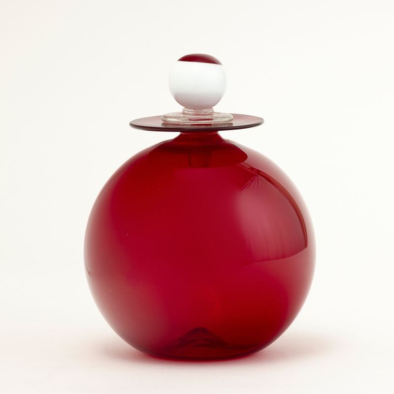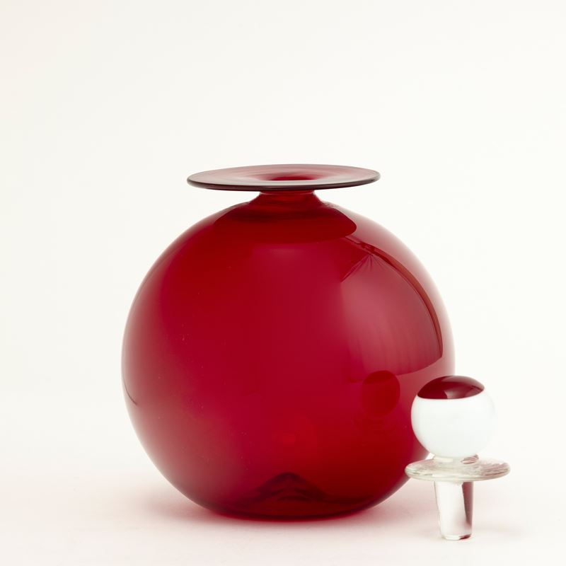 Vaso globulare in vetro soffiato rosso con tappo in forma sferica lattimo e rosso.