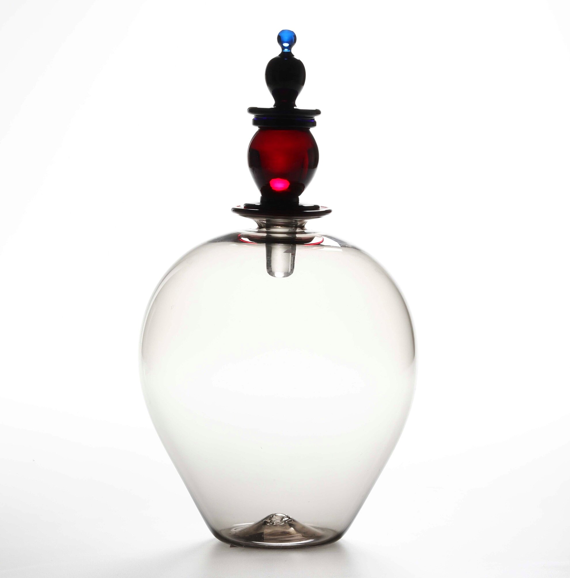 Bottiglia con corpo a sfera in vetro soffiato fumé con tappo a sfere applicate in vetro pesante policromo.