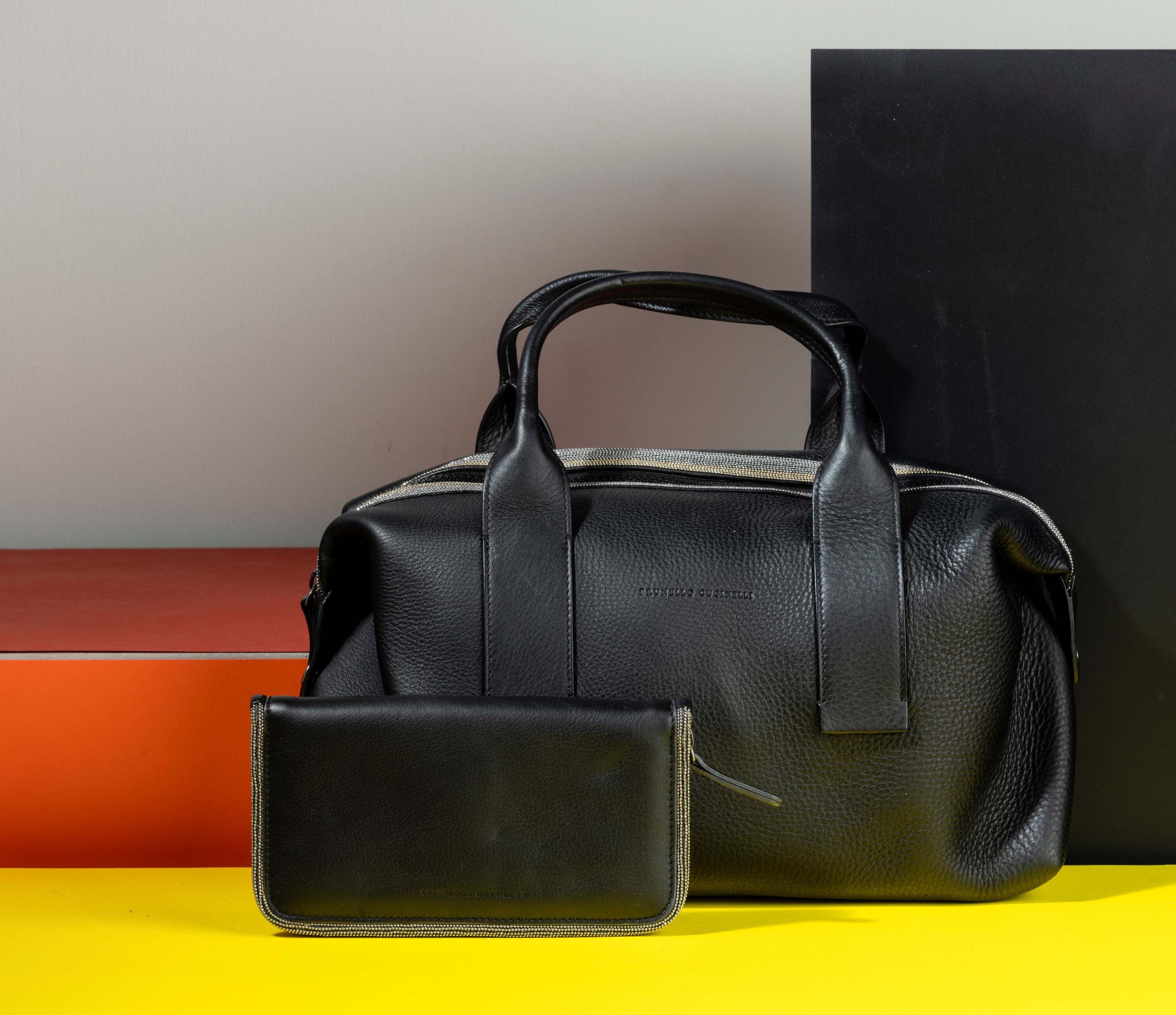 Brunello Cucinelli Borsa oversize in pelle martellata, con applicazione di fasce brillantinate e con portafogli abbinato, difetti, in buone condizioni, dustbag