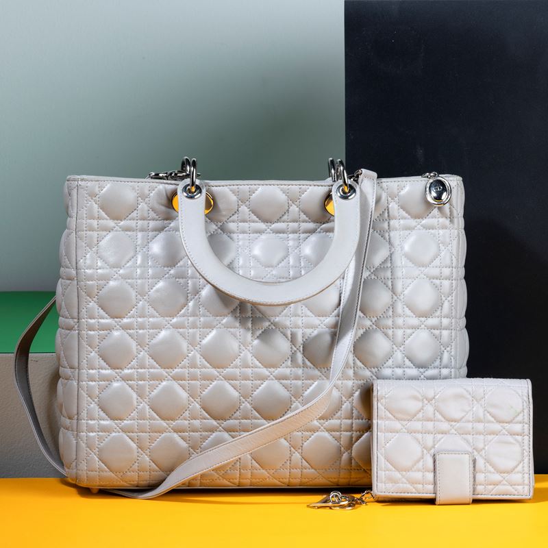 Dior Borsa Lady Dior in pelle trapuntata grigia con tracolla e portafogli abbinato, difetti, in ottime condizioni, dustba [..]