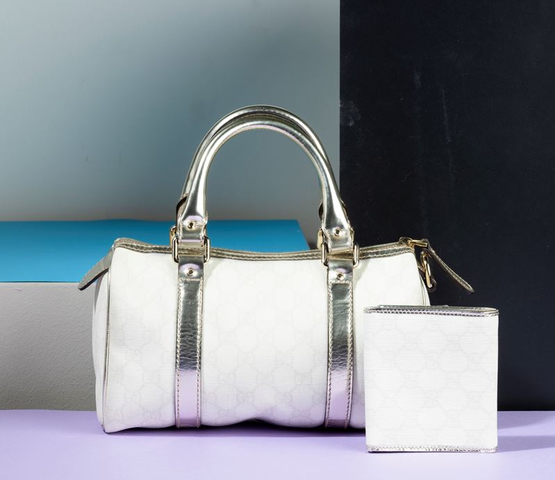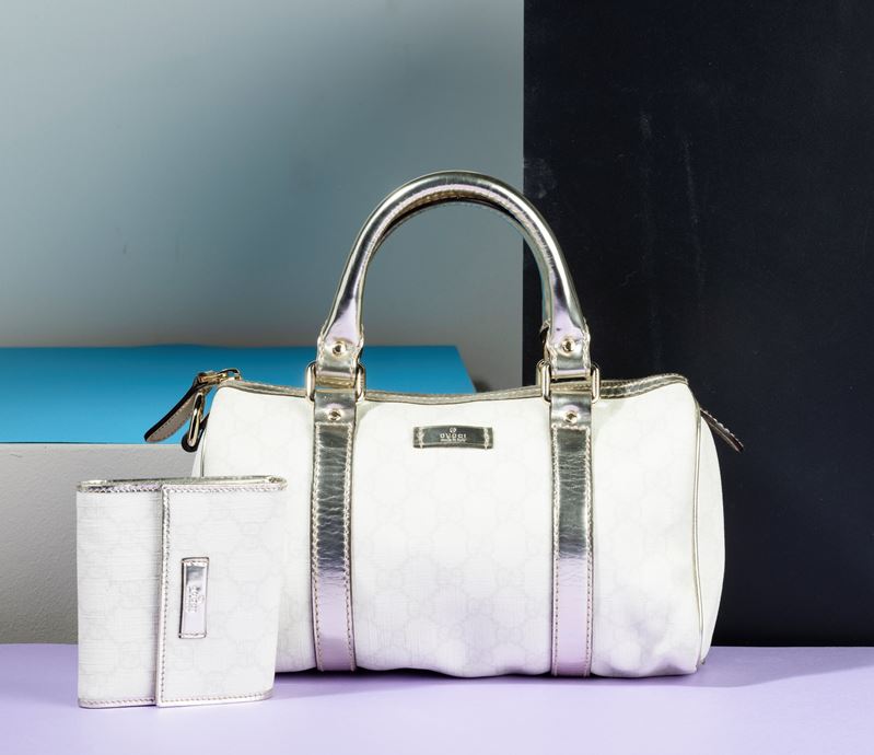 Gucci Boston Supreme Joy Bianco in tessuto e pelle con portafogli abbinato, difetti, in ottime condizioni, dustbag