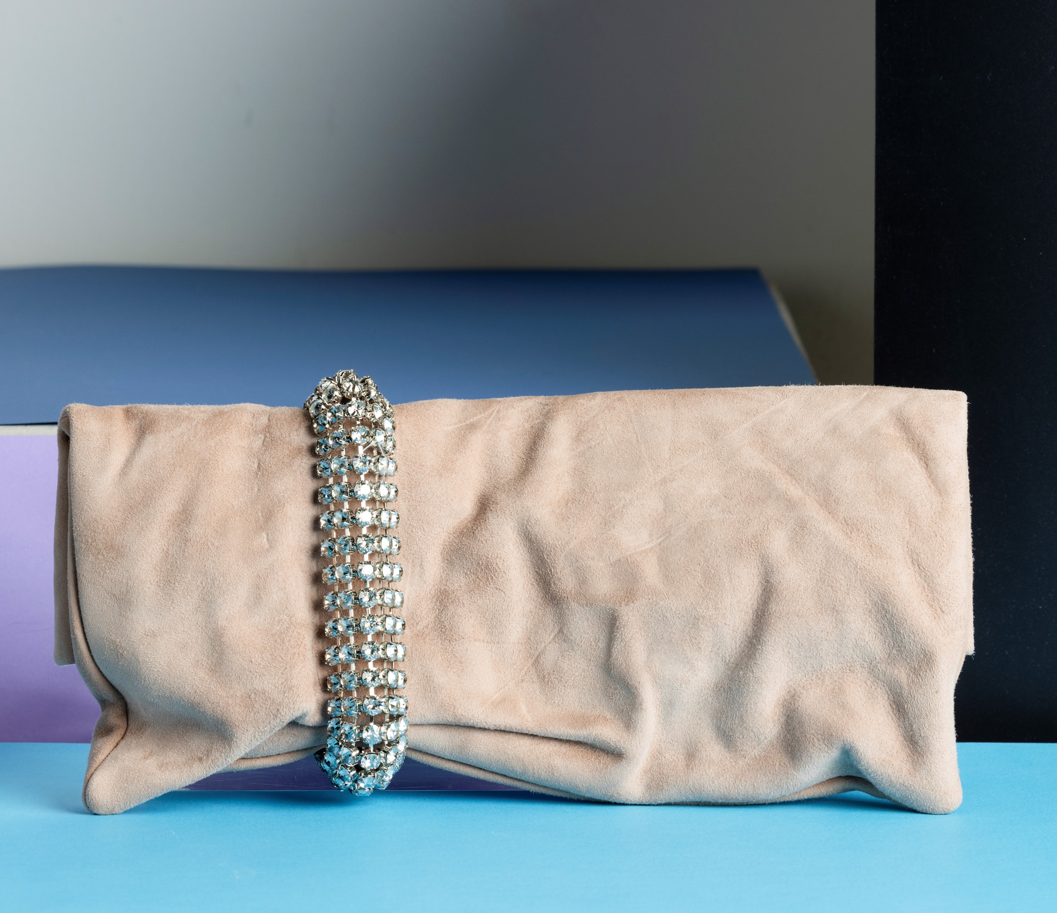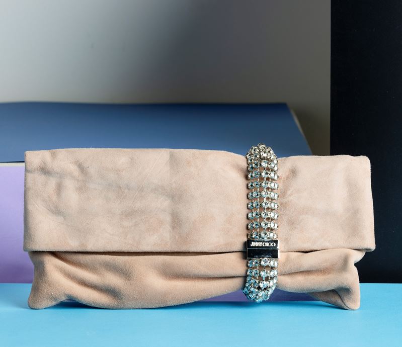 Jimmy Choo Pochette in pelle con chiusura arricchita da brillantini, mis aperta h 23 cm, difetti, in ottime condizioni, dustbag
