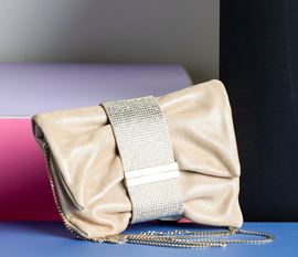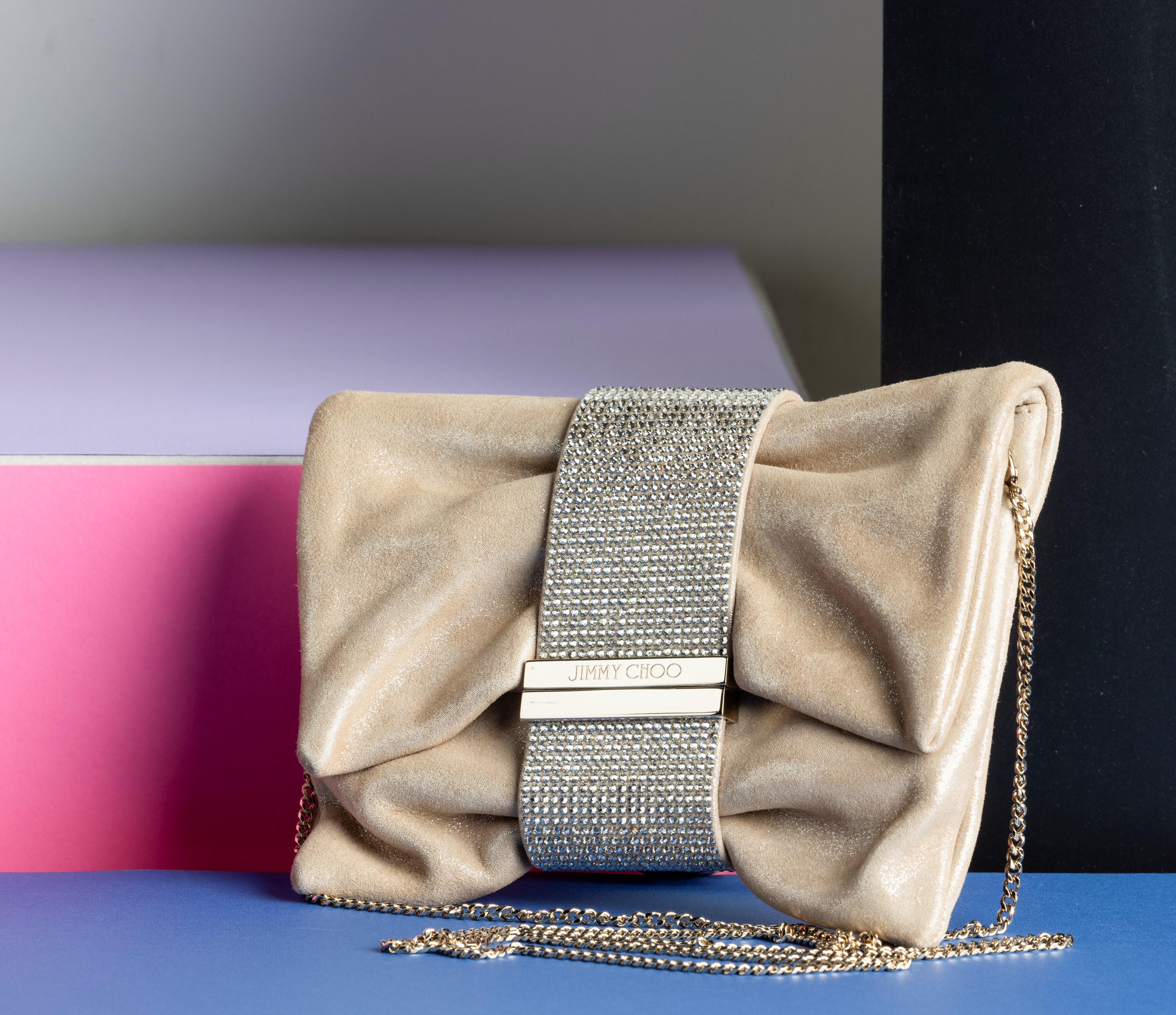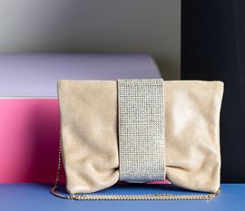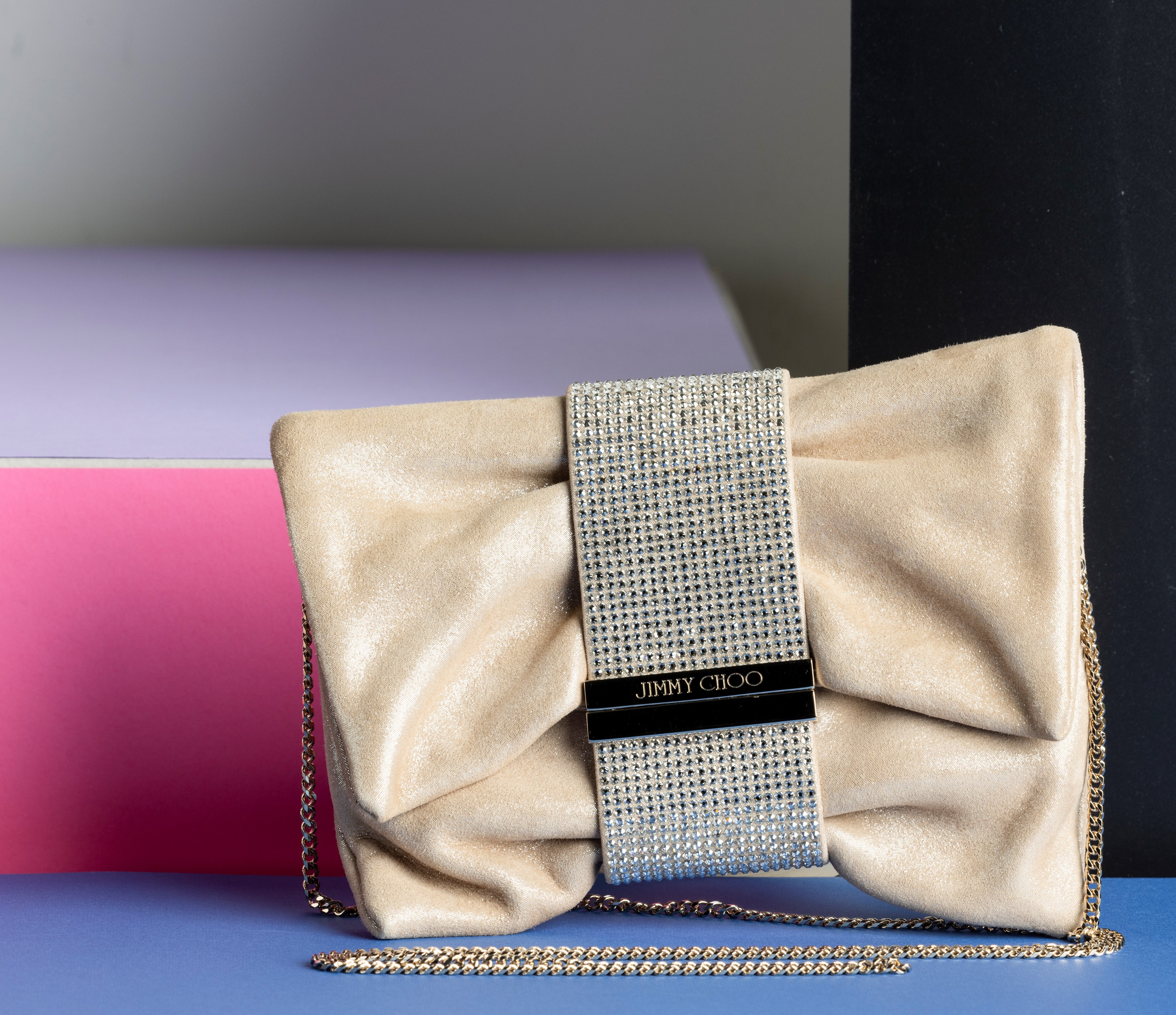 Jimmy Choo Pochette in pelle con tracolla, decorata con brillantini sulla chiusura, difetti, in ottime condizioni, con certificato di autenticità, dustbag