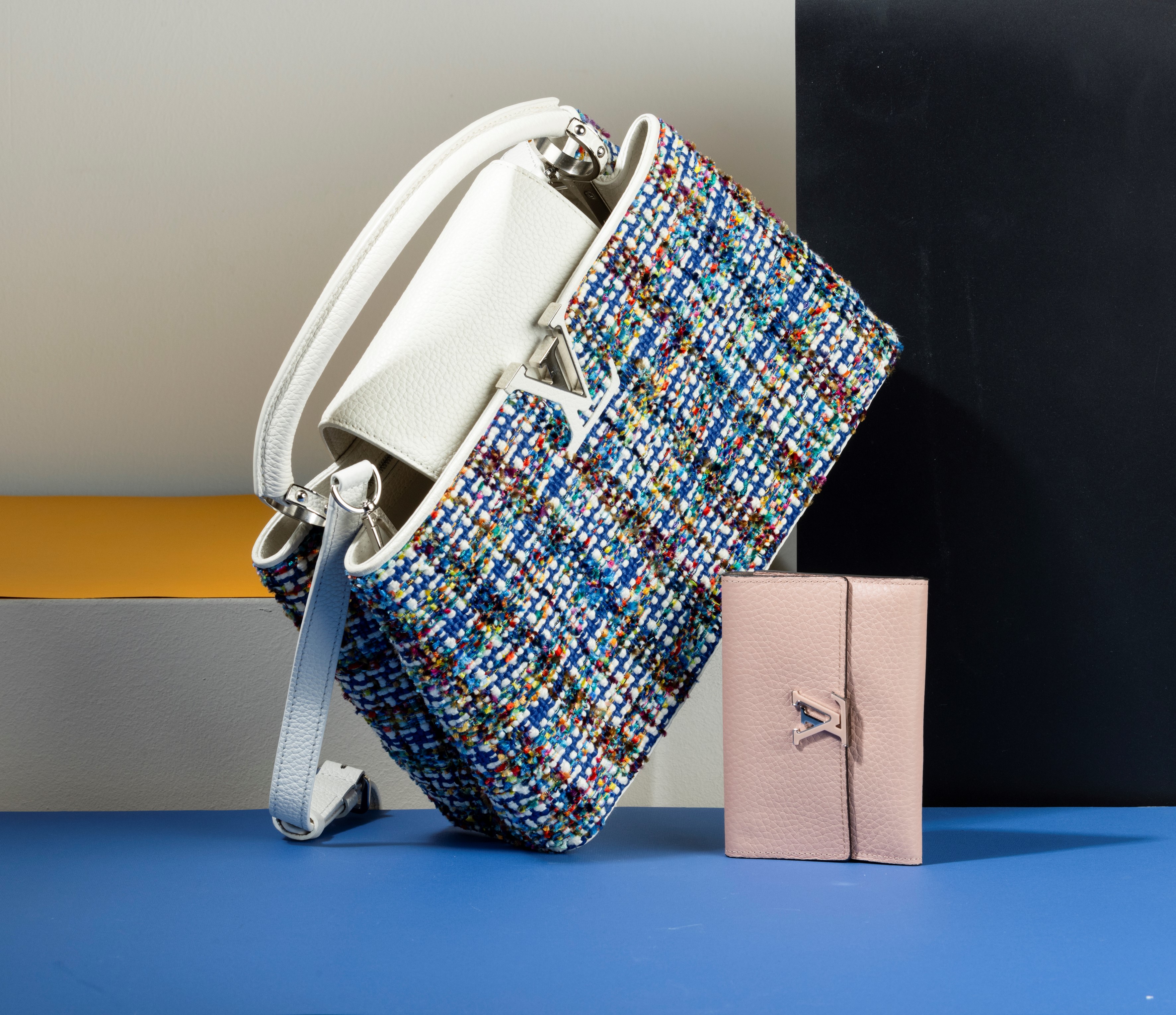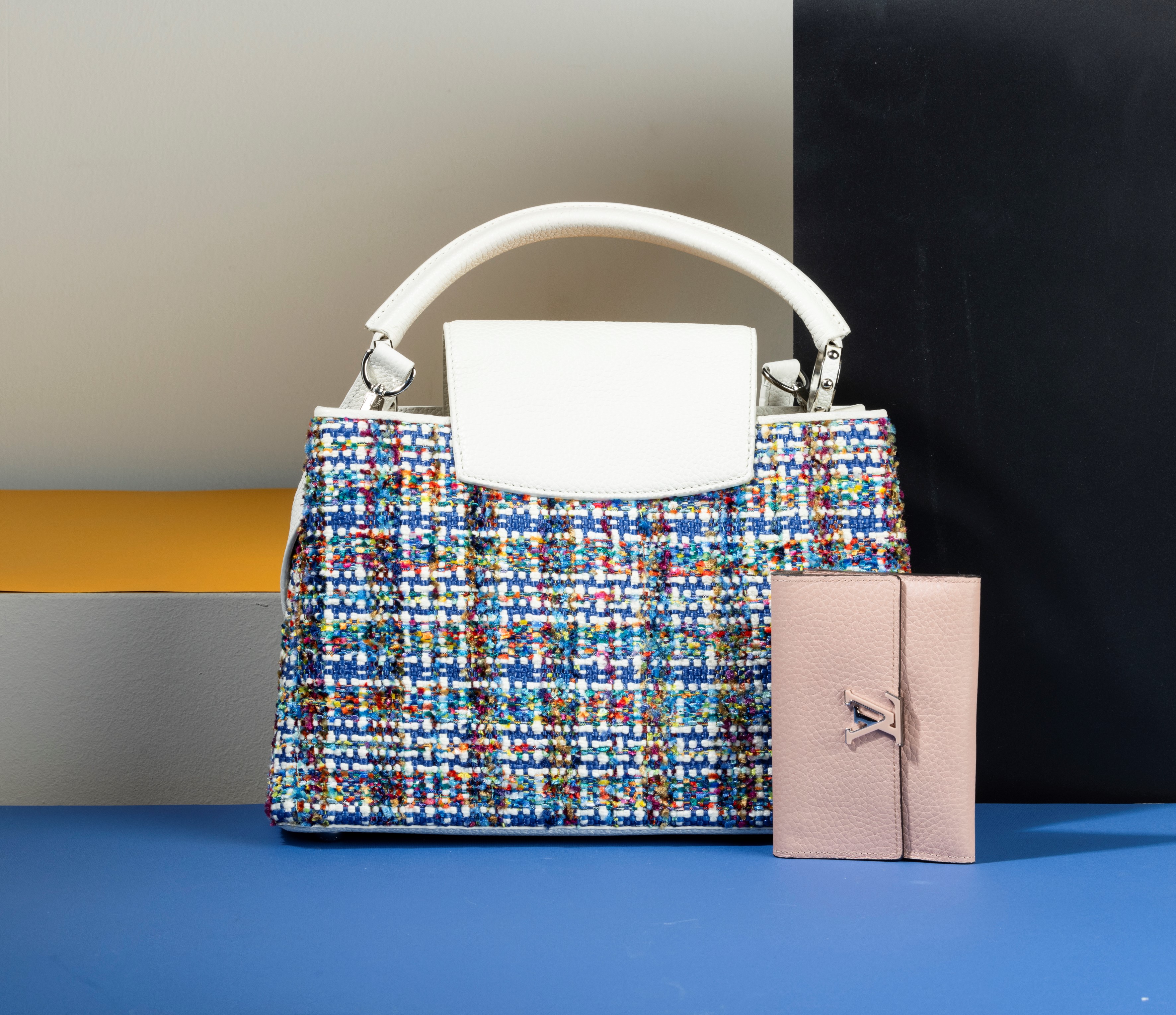 Louis Vuitton Borsa Capucines Limited Edition in pelle e intrecci colorati di lana, con tracolla e portafogli rosa, in ottime condizioni, difetti, dustbag