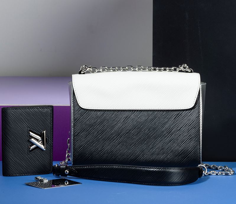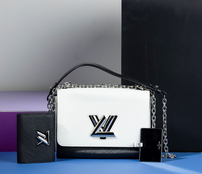Louis Vuitton Borsa Donna Twist bicolore in pelle tote con specchietto e portafogli abbinati, laterali color argento, difetti, [..]