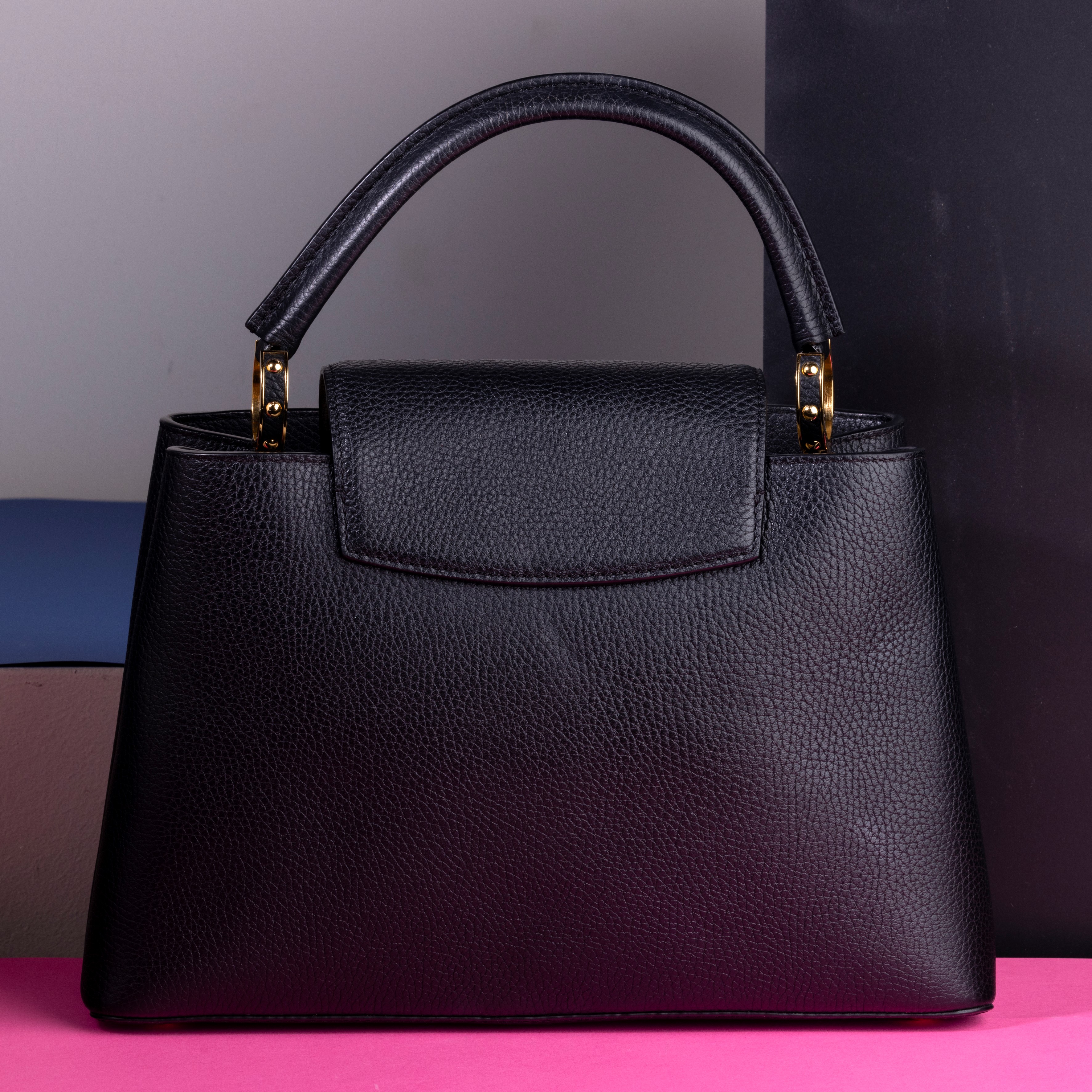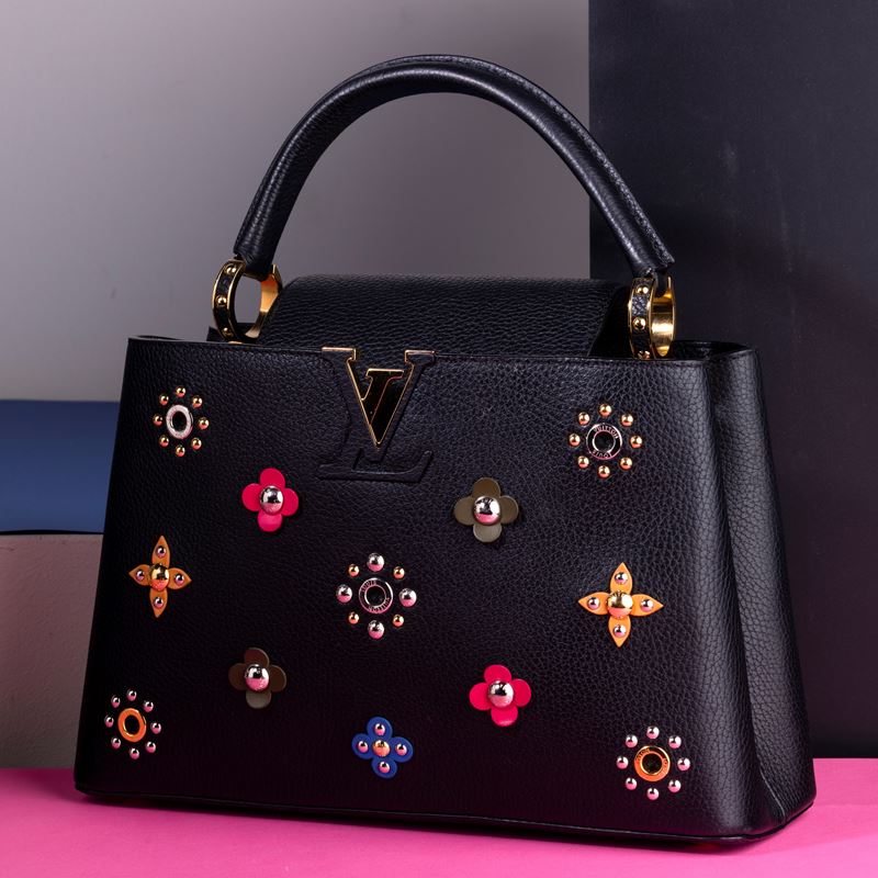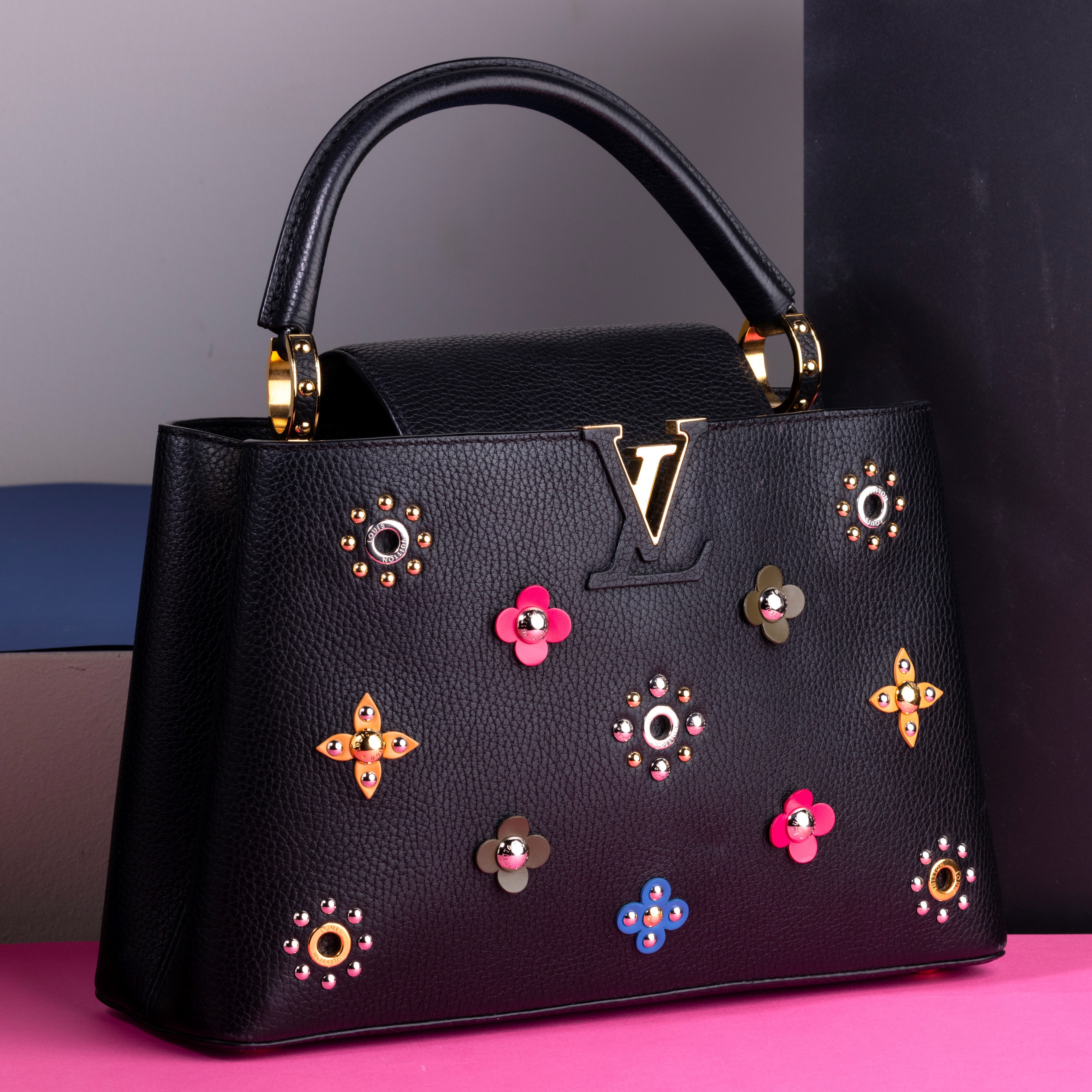 Louis Vuitton Capucines in pelle martellatanera con borchie e fiori, difetti, NOS, dustbag