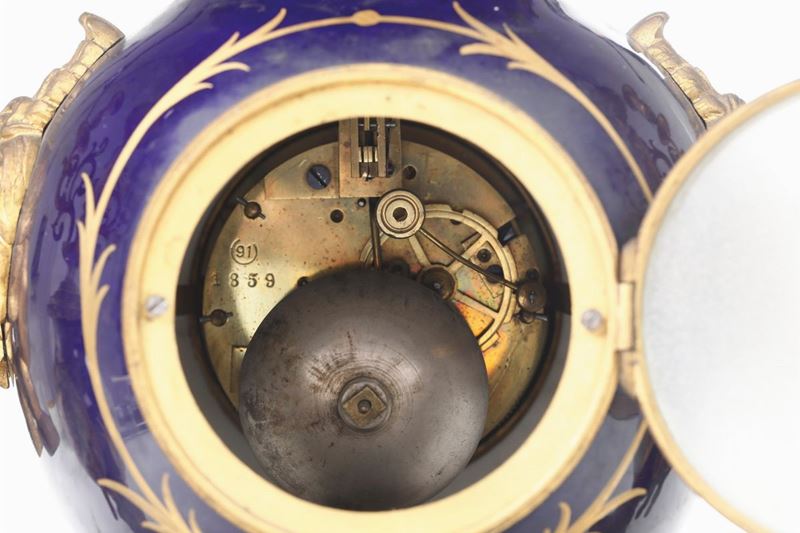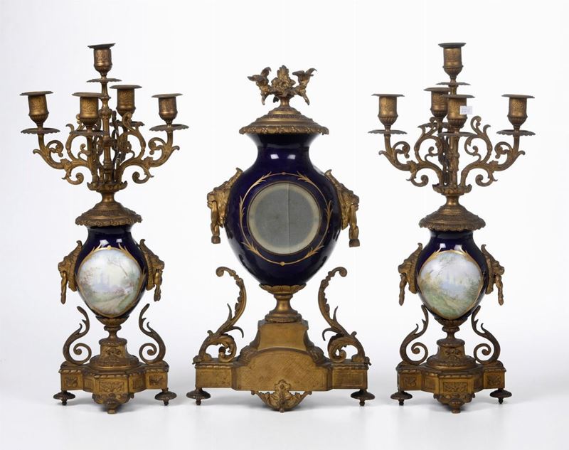 Trittico da camino composto da coppia di candelabri e un orologio in porcellana di Sevres e bronzo dorato. Francia XIX se [..]