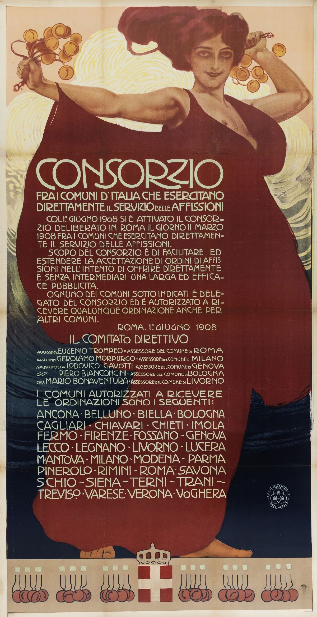 Affisso litografico, 1908. Impresso da Off. G. Ricordi, Milano. Cm 105,6 x 206. Telato. Qualità A/B.