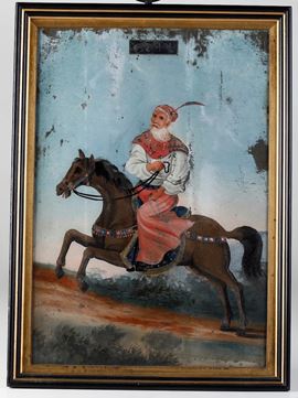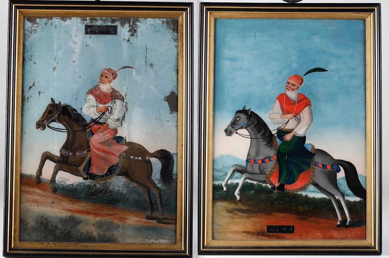 Coppia di dipinti su vetro raffiguranti personaggi a cavallo, India, XIX secolo