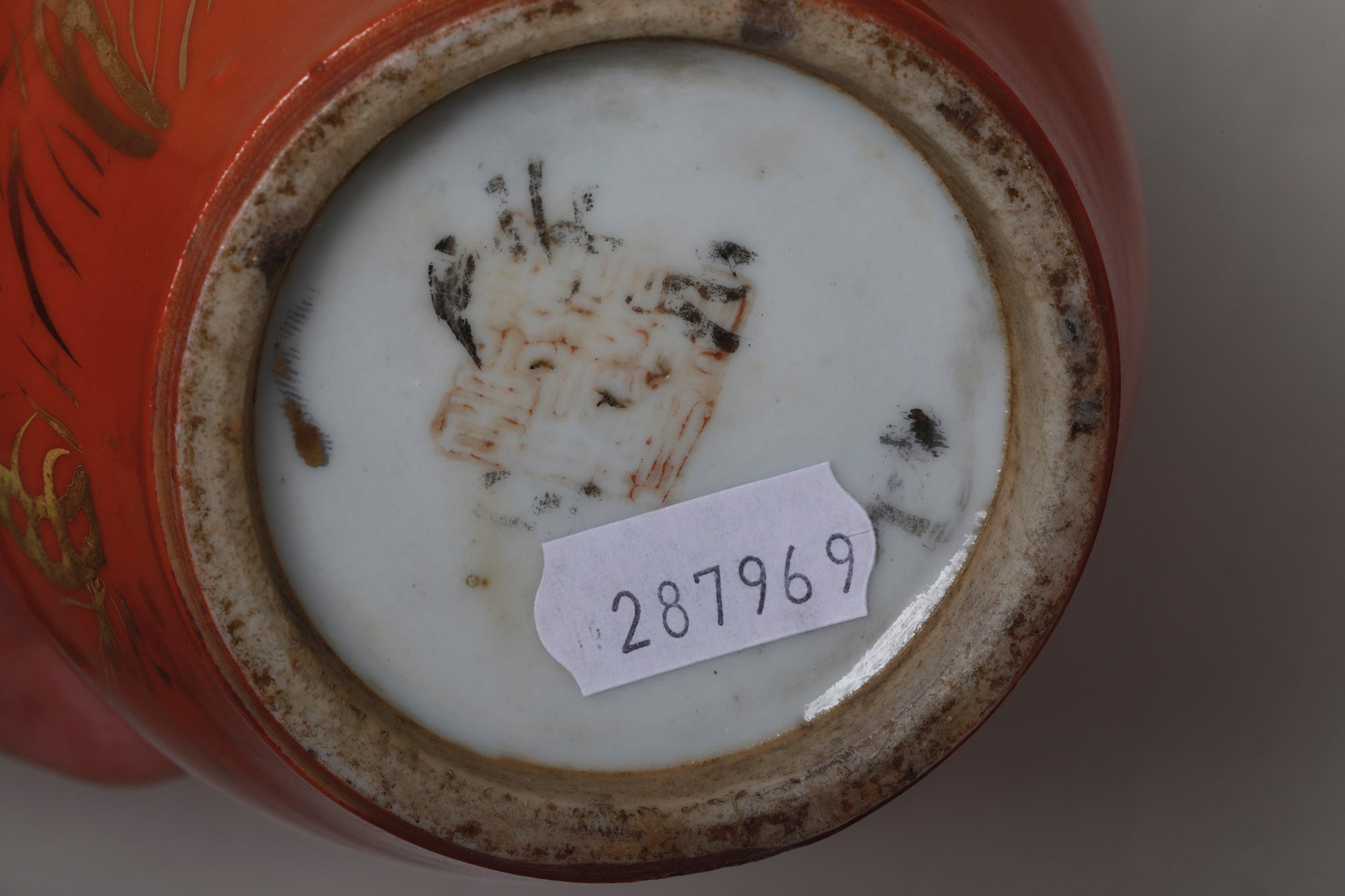 Coppia di vasi in porcellana con decori naturalistici lumeggiati in color oro e anse sagomate, Cina, XX secolo