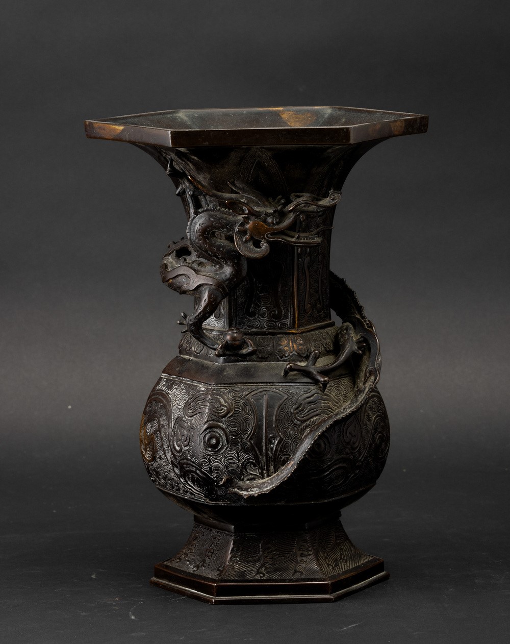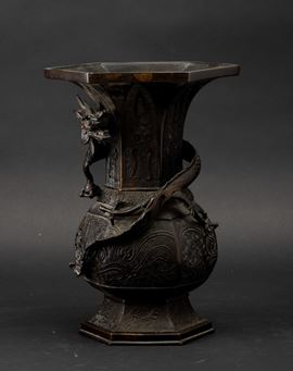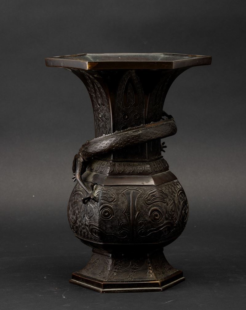 Vaso a tromba in bronzo con decori d'ispirazione arcaica e figura di drago a rilievo, Cina, Dinastia Ming, XVII secolo