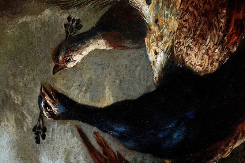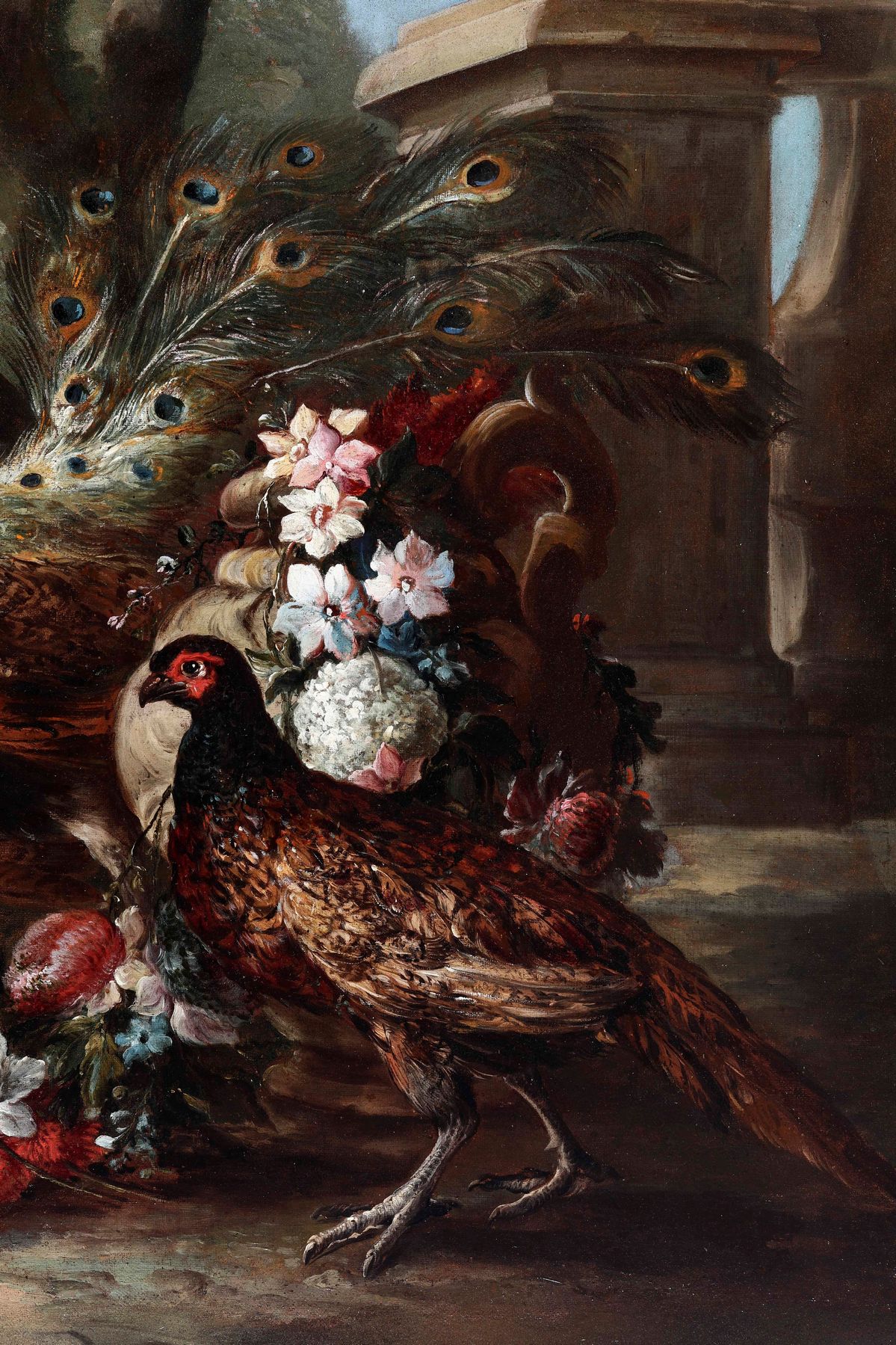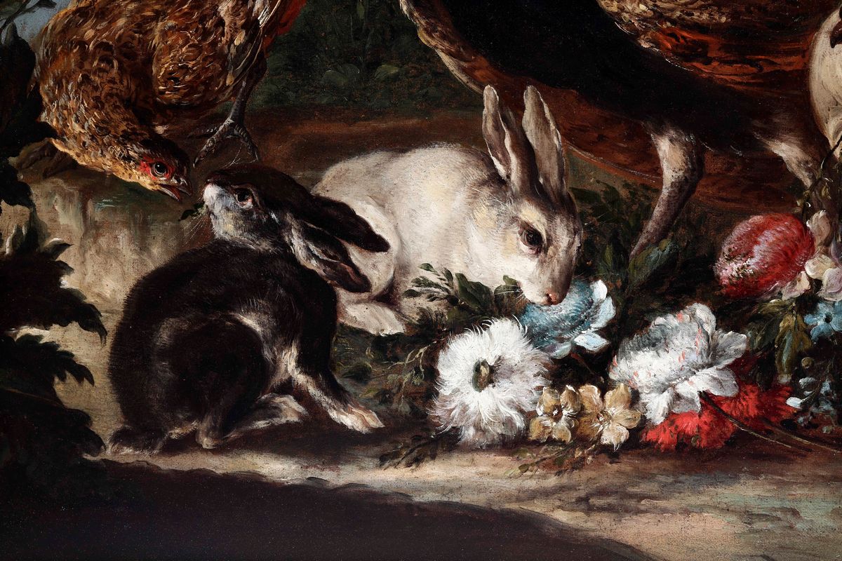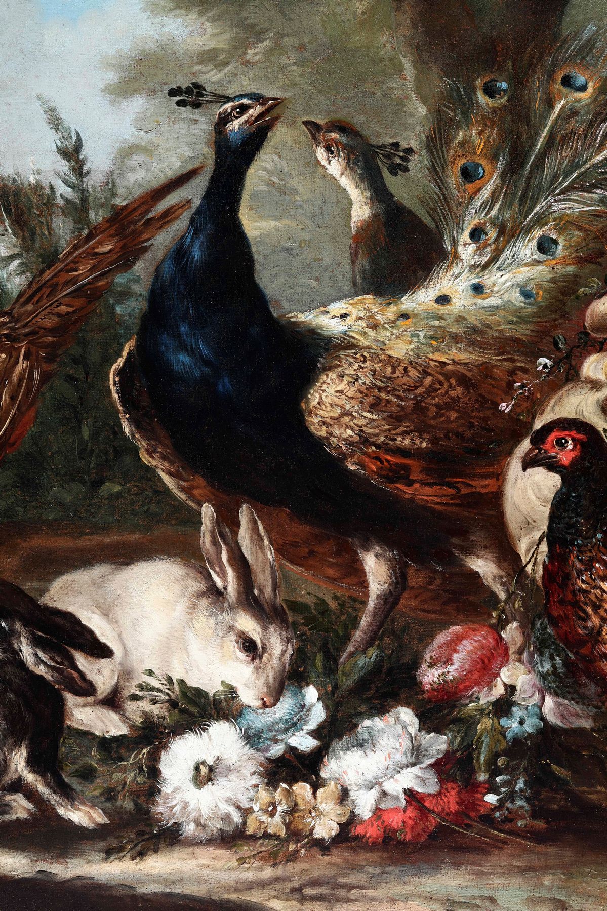 Veduta di giardino con pavoni, fagiano e coniglietti