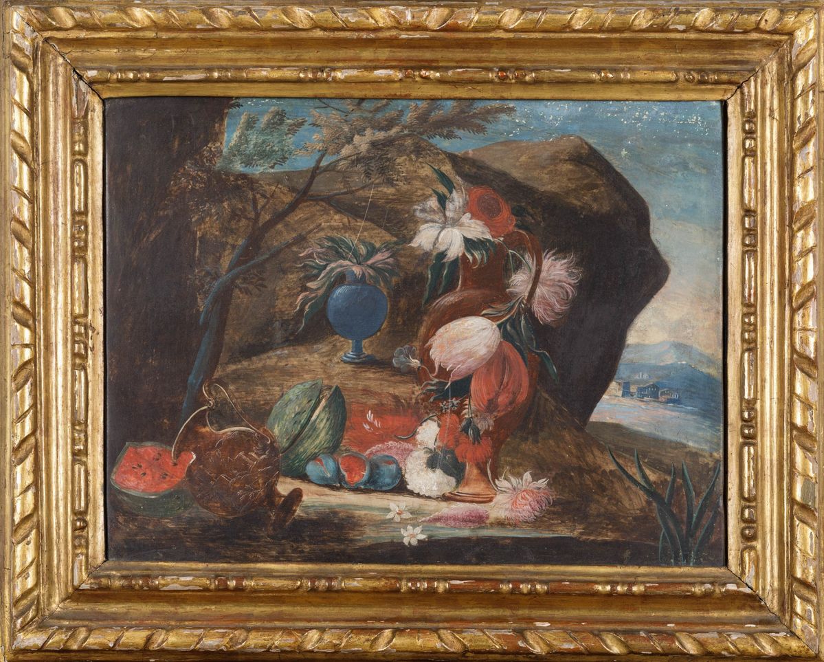 Scuola del XVIII secolo Paesaggi con composizioni di fiori e frutti