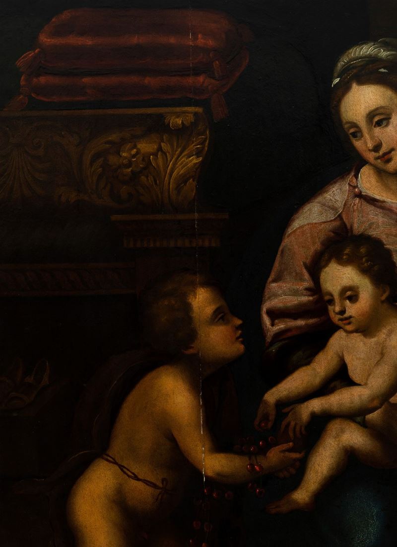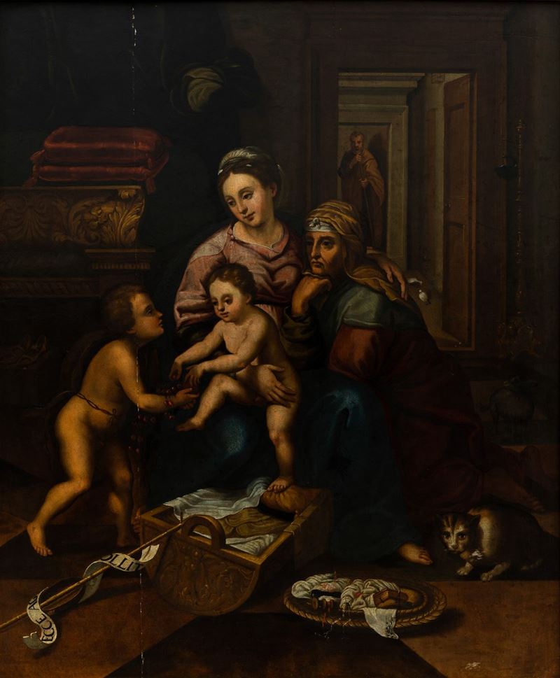 Scuola romana del XVII secolo Sacra Famiglia con San Giovannino e Sant'Anna in un interno