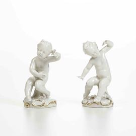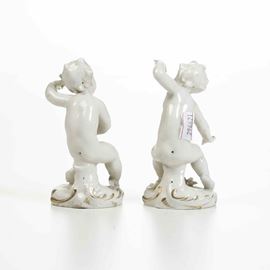 Coppia di figurine di putti, XX secolo. Porcellana. Marca: "N" con corona in blu.