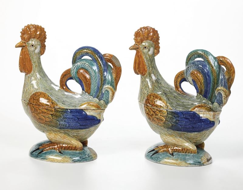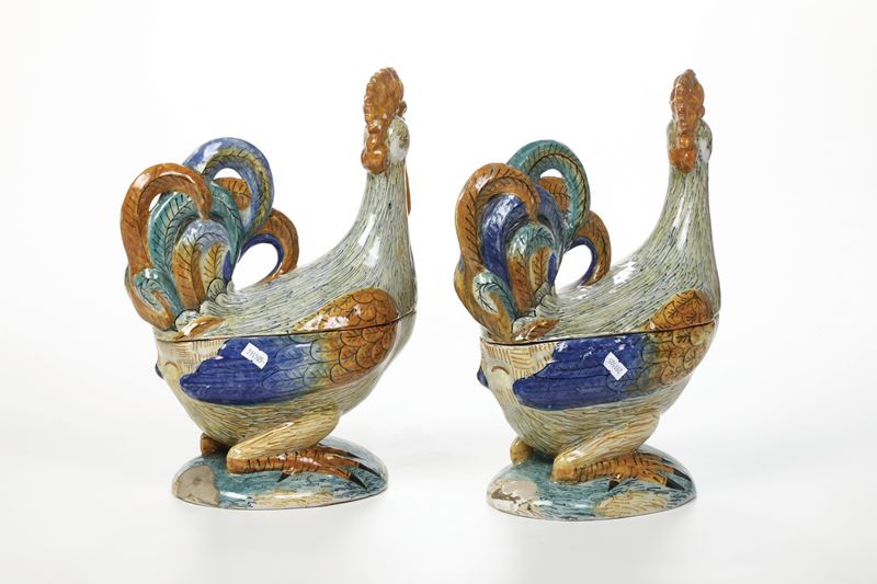 Coppia di terrine a forma di gallo. Probabilmente Nove, XX secolo.