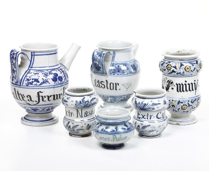 Sei vasi da farmacia. Italia del nord e Liguria, XVIII secolo.
