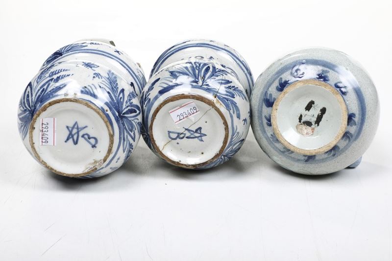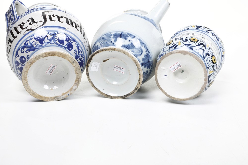 Maiolica. Dimensioni: altezza massima cm 21; minima cm 8,7. Conservazione: orcioli, uno con restauri al piede e al bordo superiore, l'altro con felatura; albarelli, quello policromo con piede ricomposto, gli altri con cadute di smalto e una sbeccatura al bordo superiore.