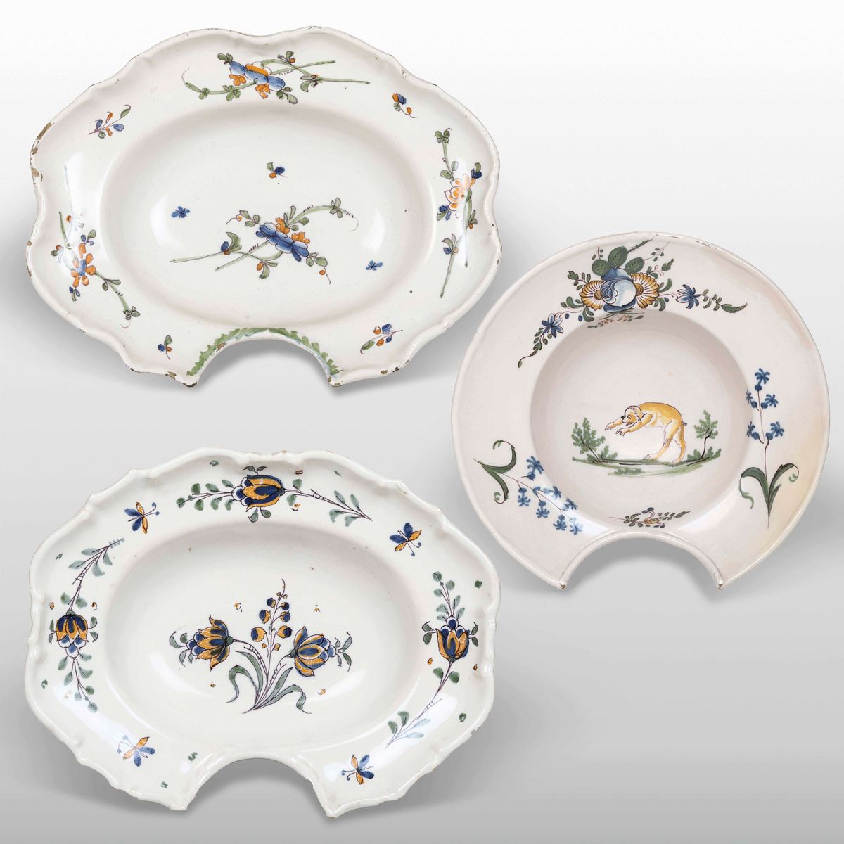 Tre bacili da barbiere. Francia, Manifattura di Montpellier (?), XVIII secolo.
