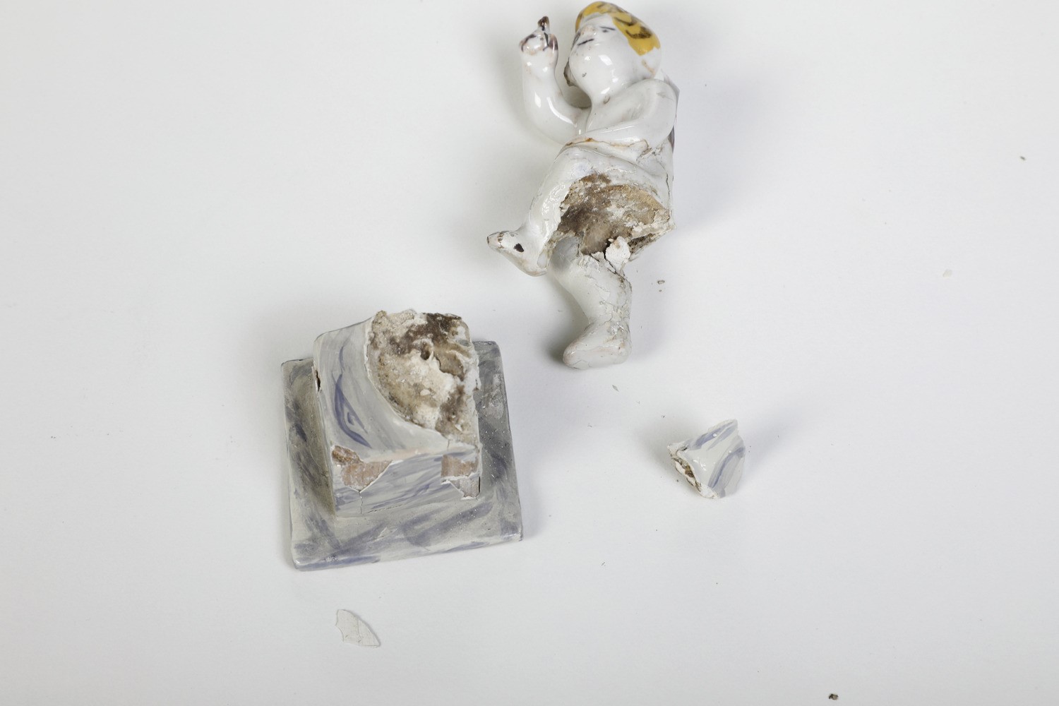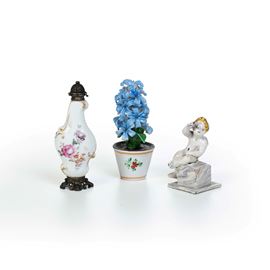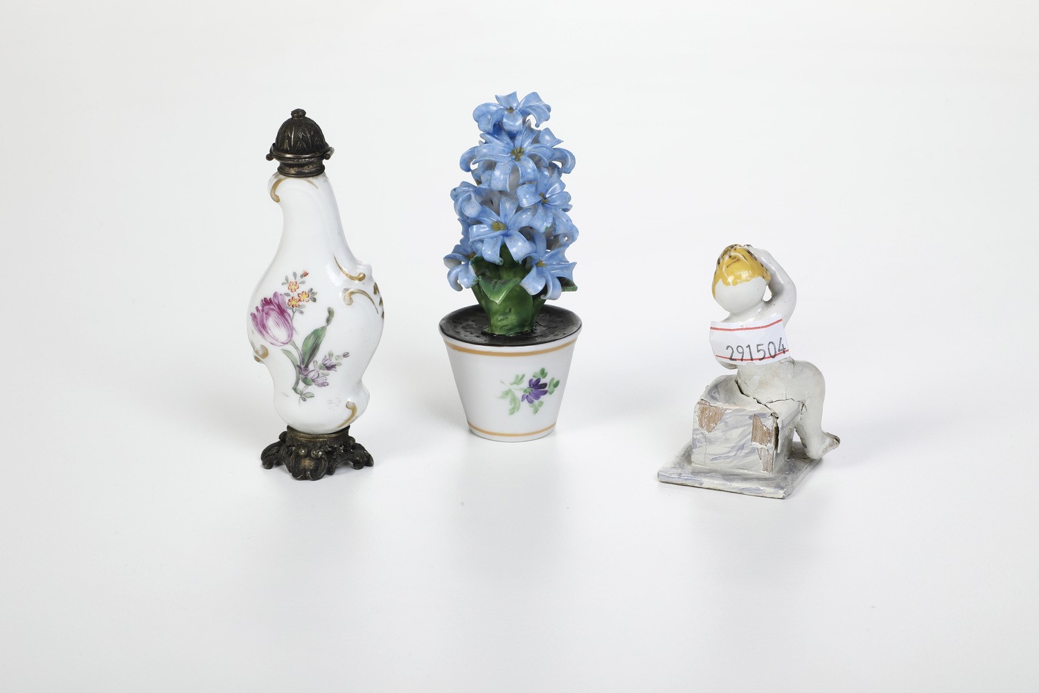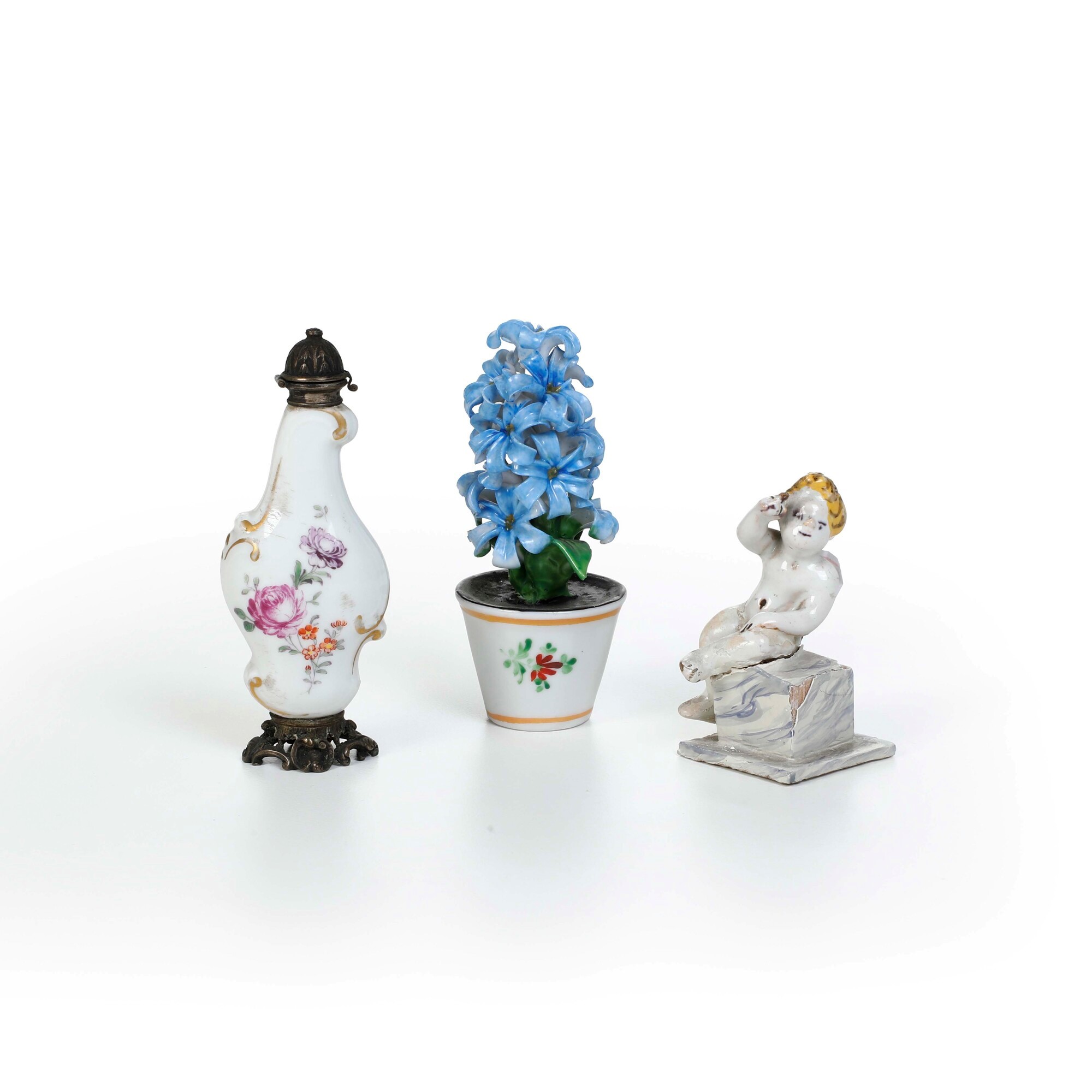 Al lotto si aggiungono: un vasetto con fiori in porcellana XX secolo e una figurina di putto in miniatura in maiolica, restauri.