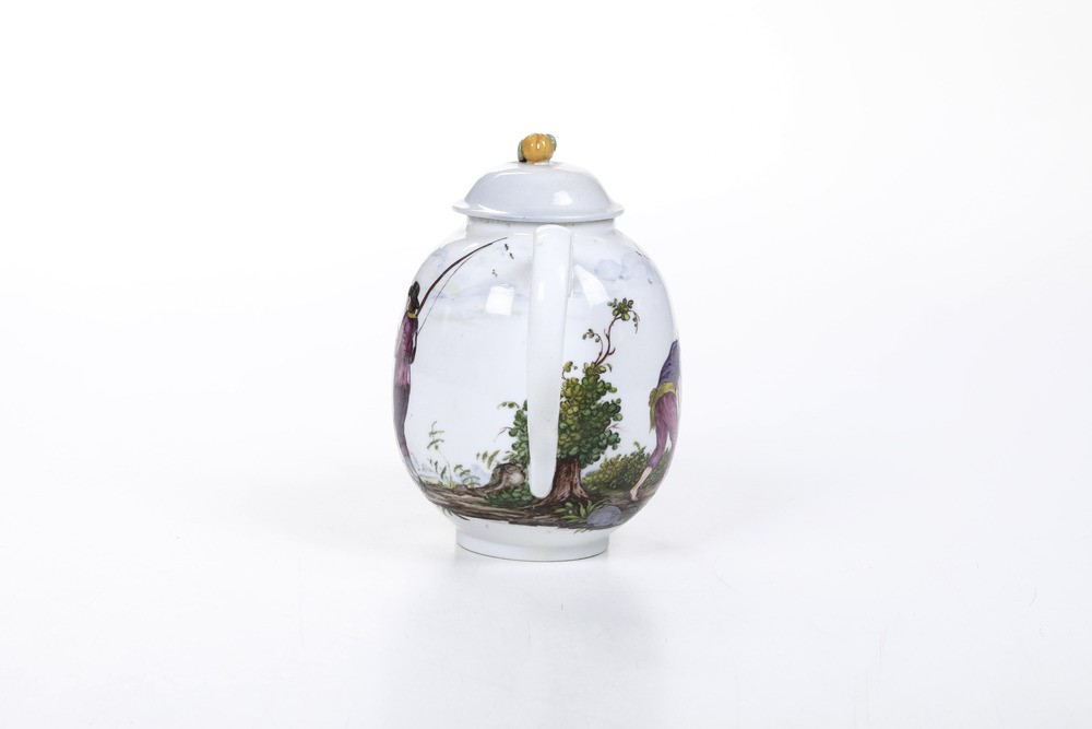Porcellana policroma. Marca: “V” o "N" incisa (?). Altezza cm 14,3. Conservazione: ottima; coperchio non pertinente.